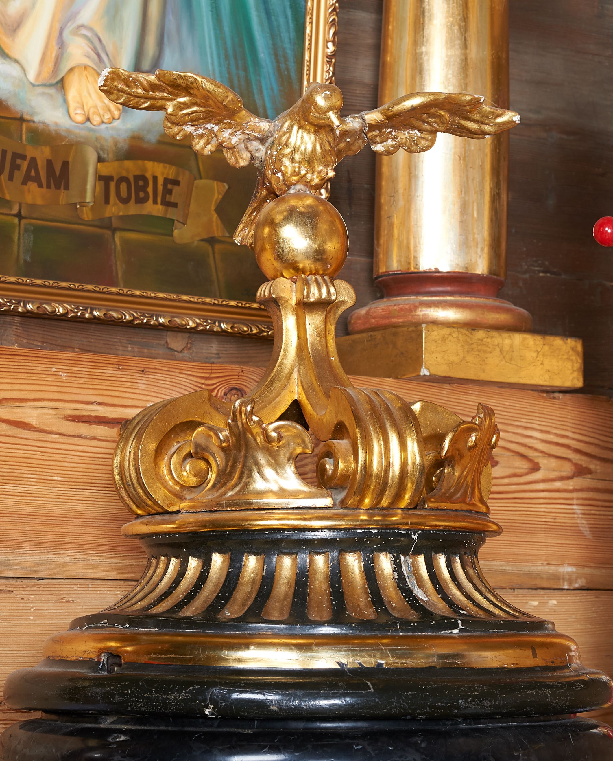 Podstawa utworzona z cylindrycznej dolnej i prostopadłościennej górnej części, z trzonem w typie gruszkowatym podtrzymującym czarę w formie spłaszczonej kuli z puklami. Pokrywa drewniana, w kształcie korony z czterema kabłąkami, zwieńczona kulą z gołębicą Ducha Świętego.