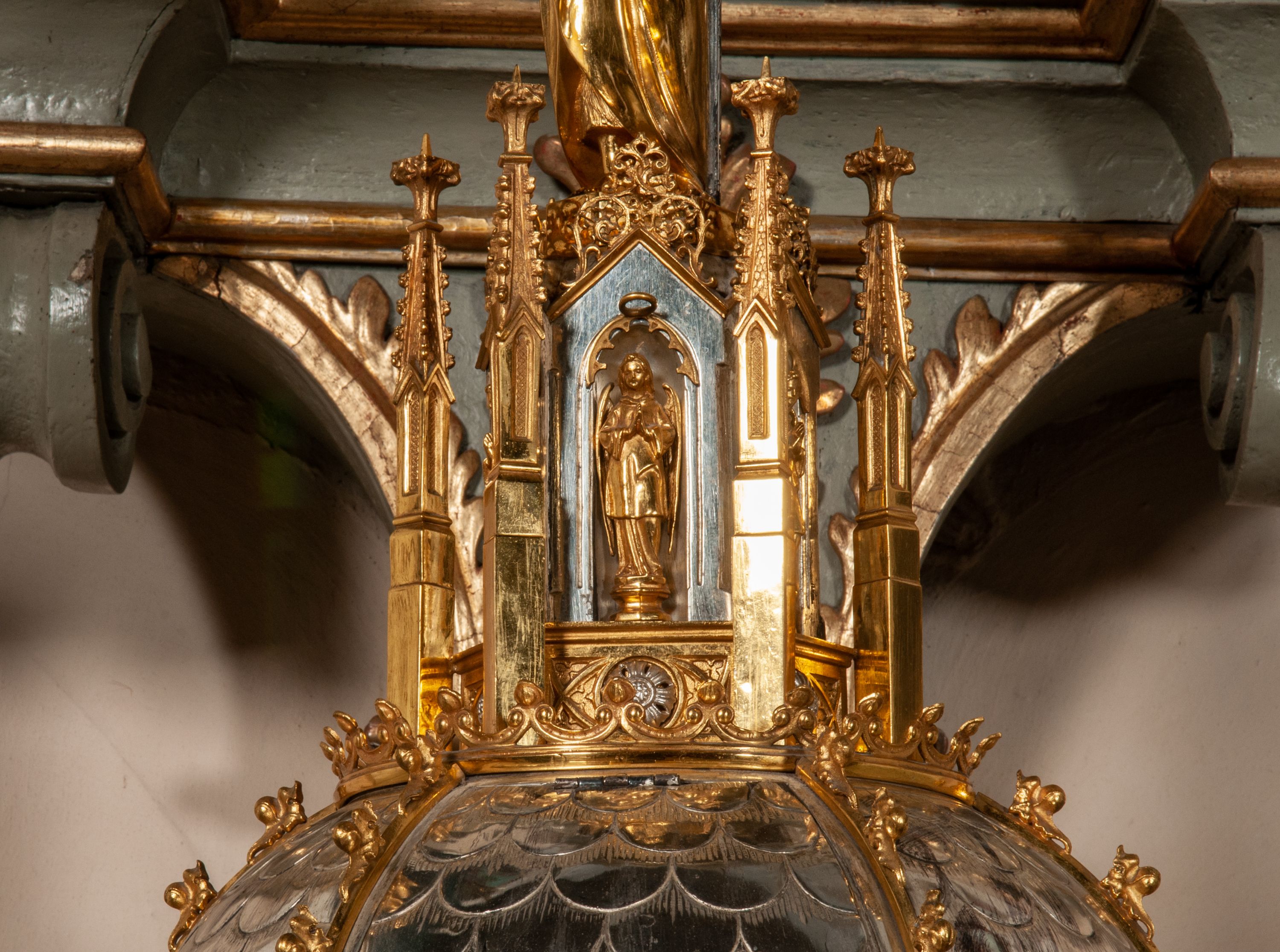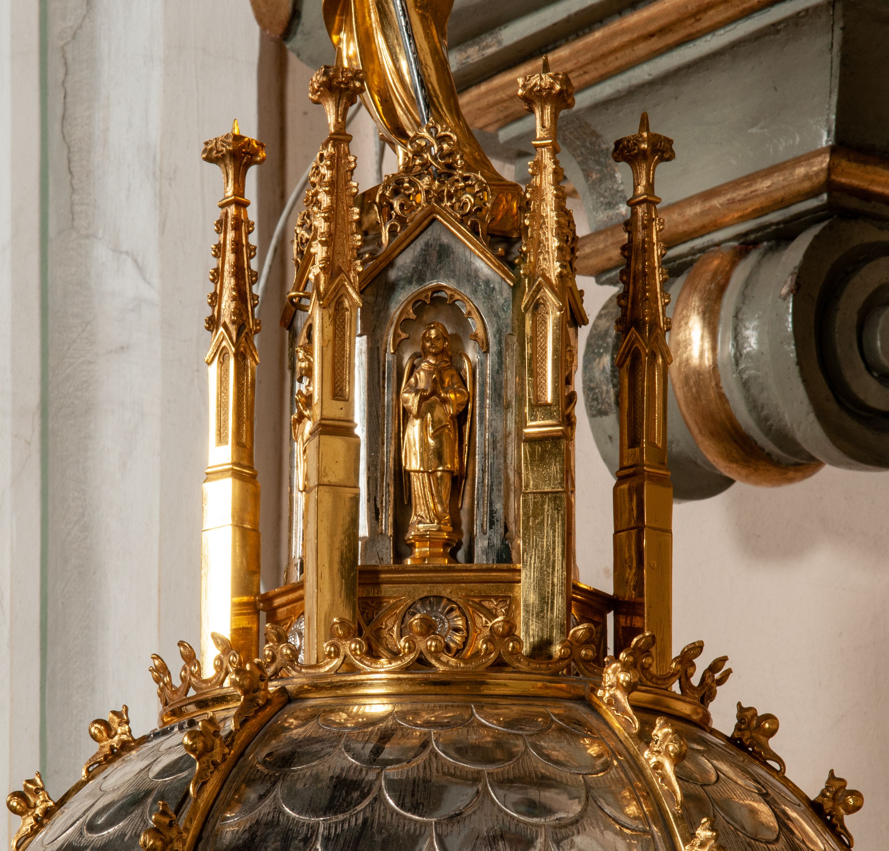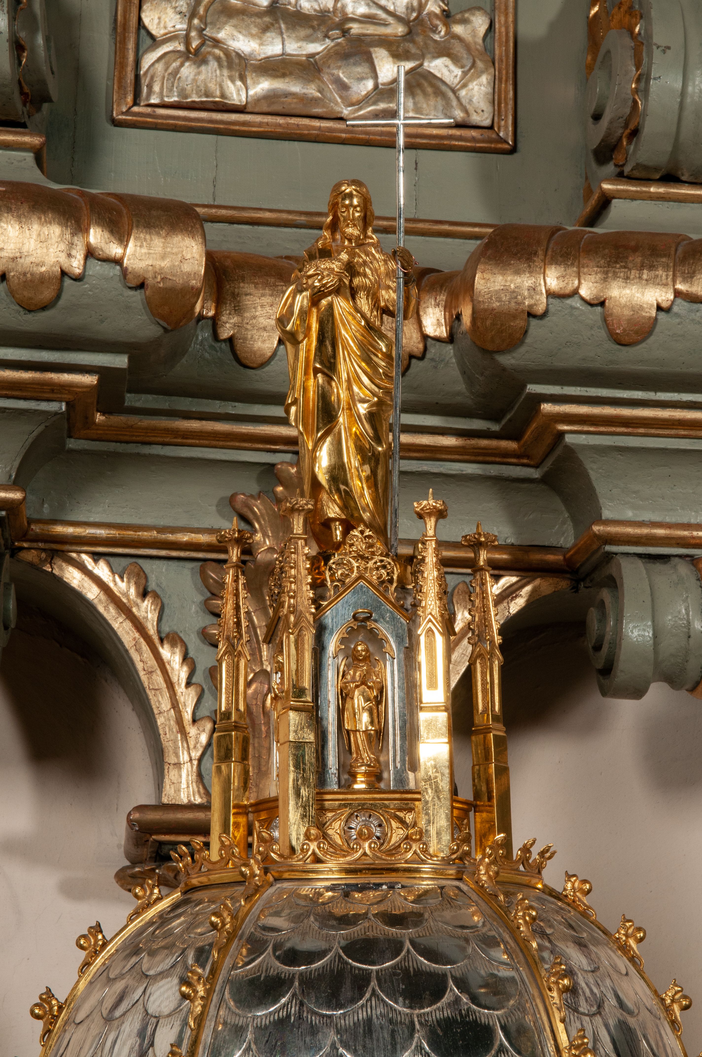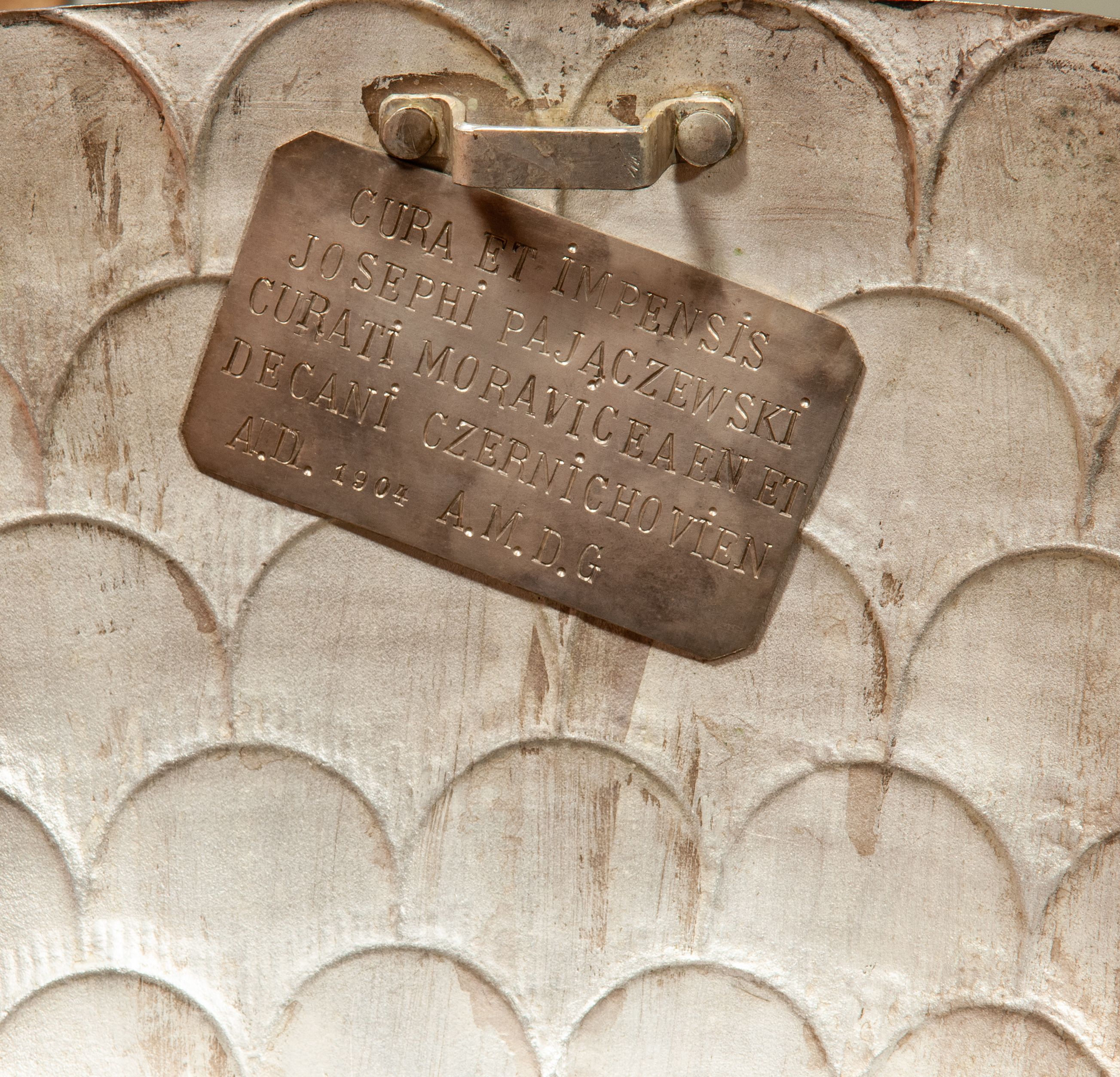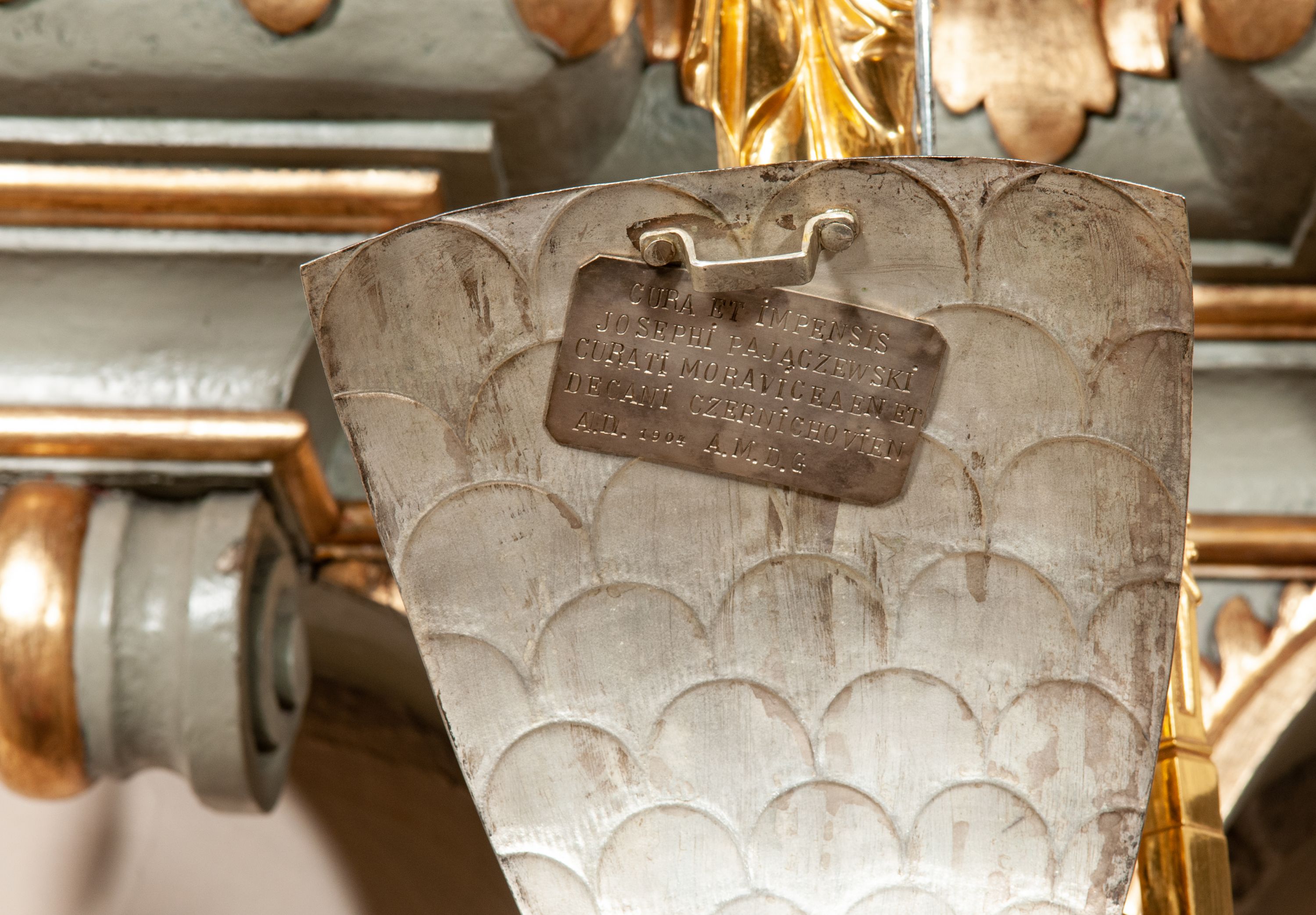Podstawa okrągła, dwustopniowa z prostopadłościenną górną częścią, z trzonem w typie gruszkowatym z wałkiem w górnej części, podtrzymującym czarę w formie spłaszczonej kuli z puklami. Na czarze tarcza herbowa ujęta wolutami z godłem herbu Szaszor lub Orla. Pokrywa drewniana, w kształcie smukłej półkopuły o powierzchni pokrytej srebrzonymi łuskami, obwiedzionej koroną, podzielona żebrami z żabkami i zwieńczona koroną. Nad kopułą sześcioboczna wieżyczka ujęta wolnostojącymi pinaklami. Jej ścianki zakończone trójkątnie z ornamentalnymi grzebieniami, wypełnione wnękami z postaciami aniołów. Nad wieżyczką figura św. Jana Chrzciciela, ubranego w wielbłądzią skórę i płaszcz przerzucony na prawym ramieniu. W prawej dłoni podtrzymuje baranka, w lewej trzyma osadzony na długim trzpieniu krzyż. Na wewnętrznej stronie pokrywy tabliczka z inskrypcją: „CURA ET IMPENSIS / JOSEPHI PAJĄCZEWSKI / CURATI MORAVICEAEN ET / DECANI CZERNICHOVIEN A(NNO) D(OMINI) 1904 A(D) M(AIOREM) D(EI) G(LORIAM)”.
