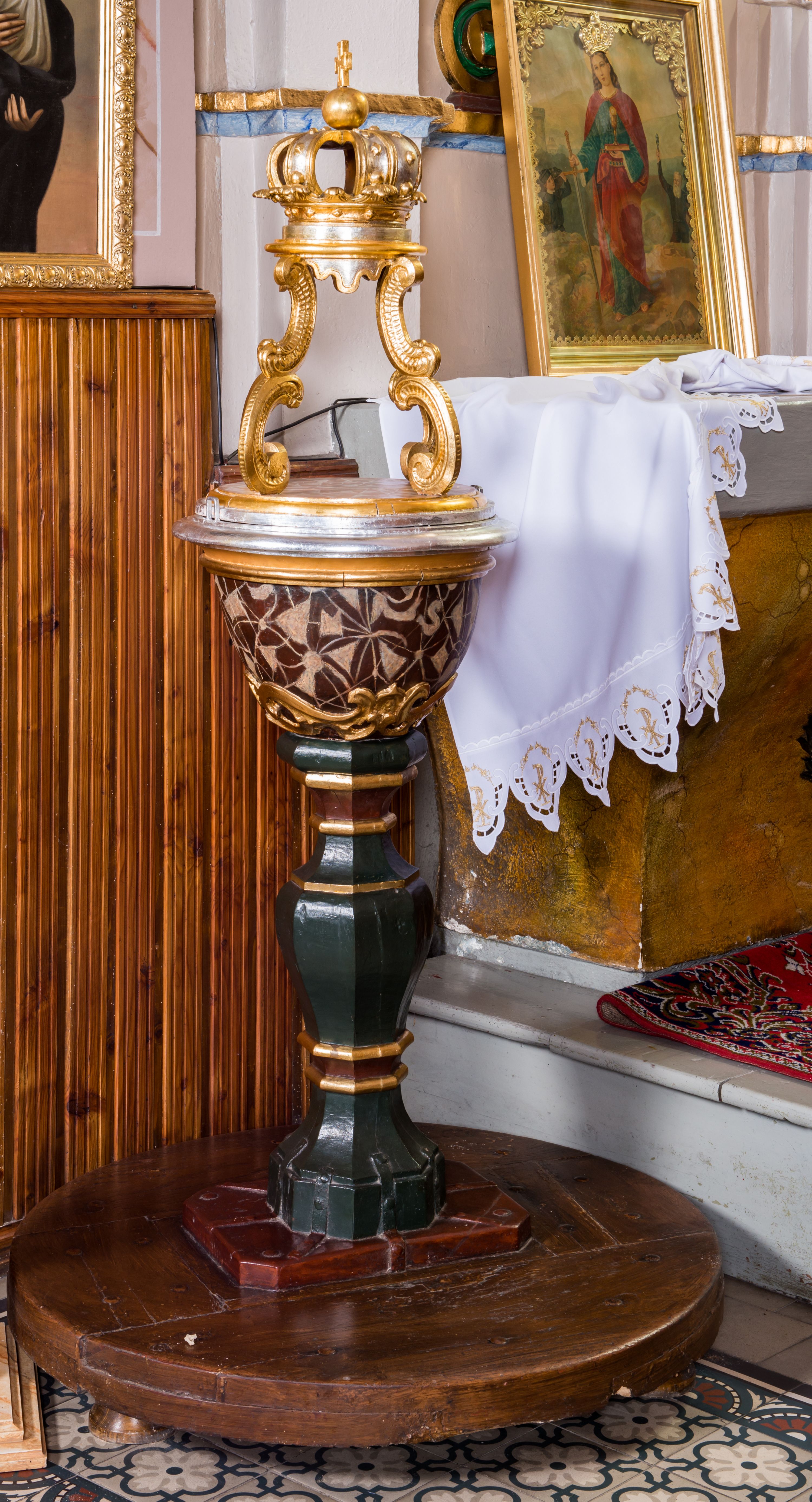 Chrzcielnica w typie kielichowym na niewysokiej stopie w kształcie prostopadłościanu o ściętych narożach, przymocowanej do trzonu na rzucie ośmioboku, z gruszkowym nodusem pośrodku, ujętym u dołu parą, a u góry jednym pierścieniem, zwieńczonym pierścieniem i wałkiem. Czarę chrzcielnicy na rzucie koła, pokrytą polichromowanym wzorem geometrycznym, dołem zdobi płaskorzeźbiony motyw ornamentyki akantowej, górą obiega wałek, znajdujący się tuż pod lekko wywiniętym wylewem. Ażurowa czasza osadzona jest na niewysokiej podstawie na rzucie koła. Tworzą ją cztery kabłąki w postaci pary małżowin w kształcie litery „C”, wspierające zwieńczenie w formie zamkniętej korony. Struktura chrzcielnicy utrzymana jest w odcieniach bordo, ciemnej zieleni oraz beżu, detale oraz czasza są złocone i srebrzone.