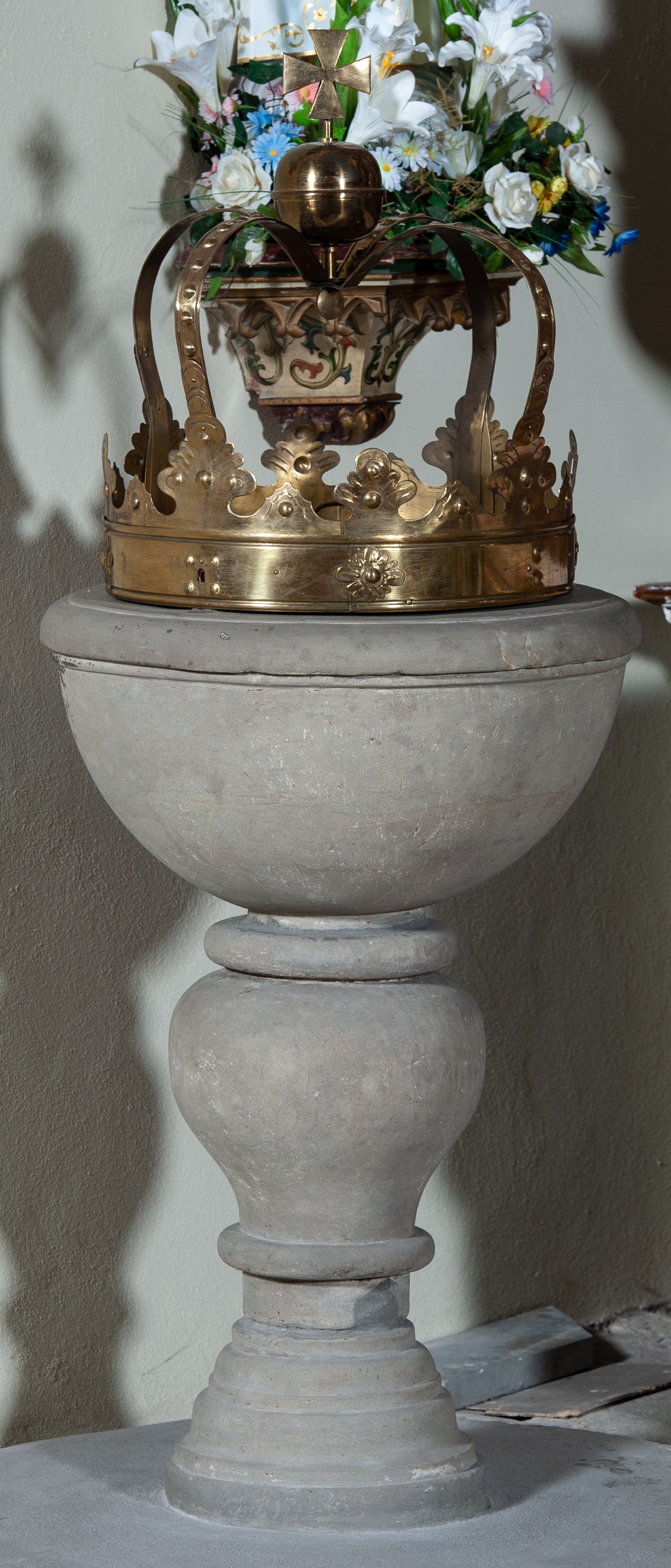Skromna chrzcielnica o uproszczonych formach, wykonana zapewne w miejscowym warsztacie kamieniarskim