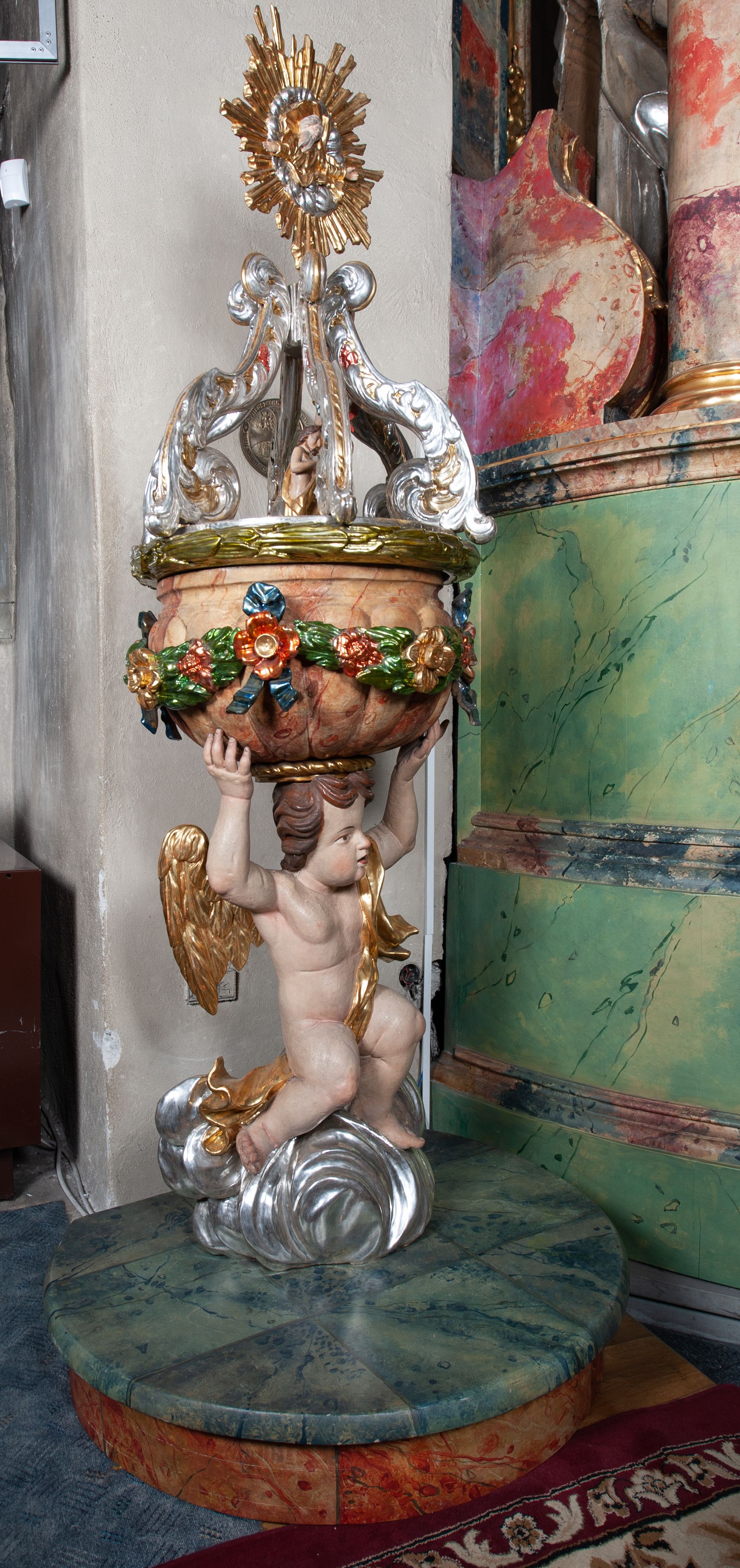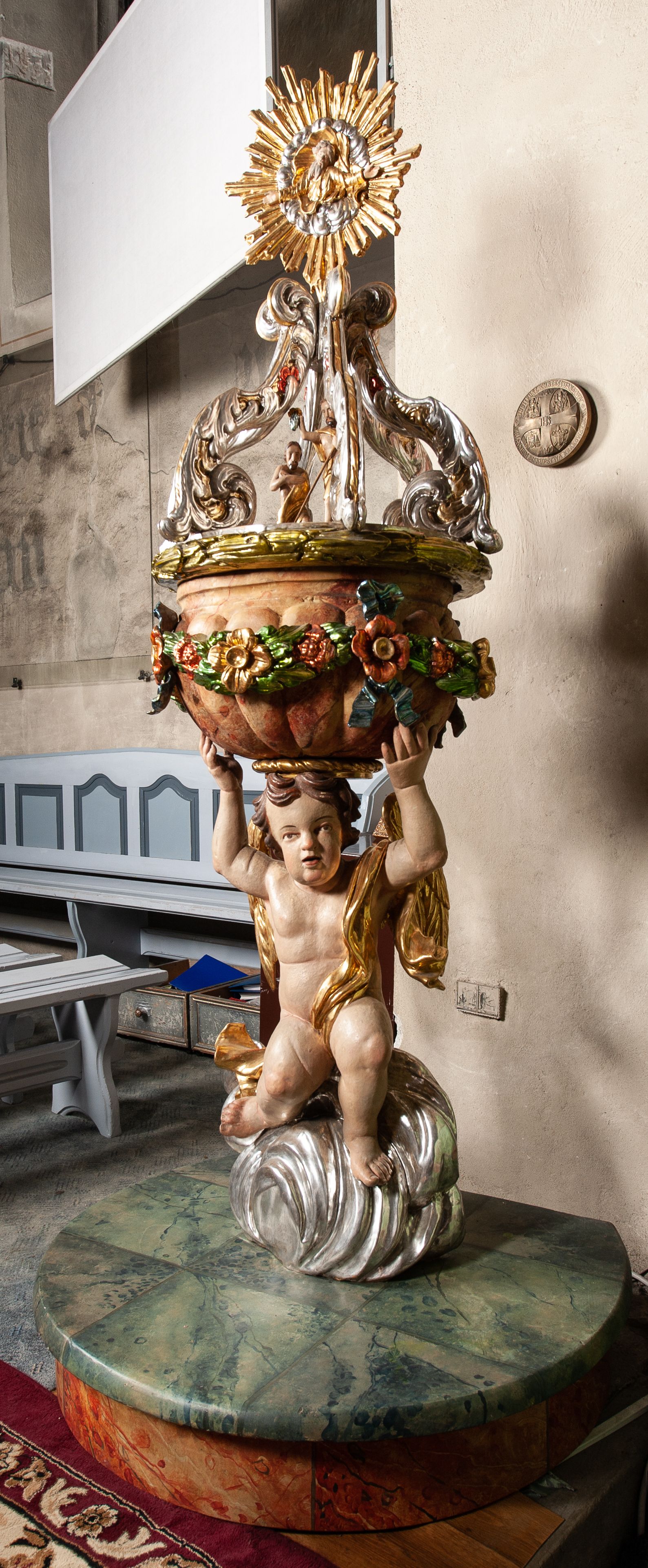 Barokowa chrzcielnica, niezwykle ozdobna, z programem ikonograficznym odnoszącym się do sceny chrztu Chrystusa w Jorhanie.