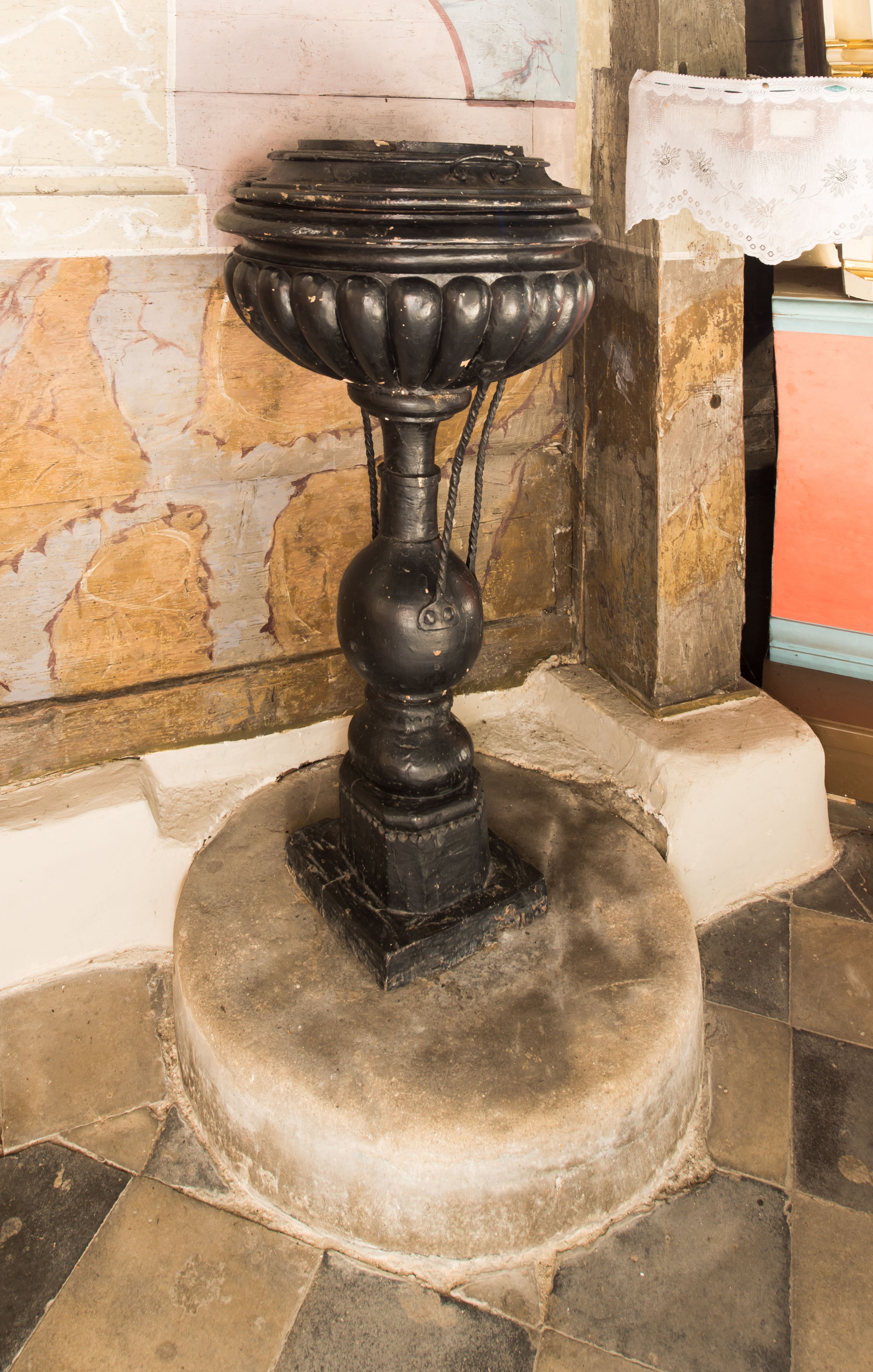 Chrzcielnica została wykonana w drewnie do miejscowego kościoła parafialnego pod koniec XVI wieku.