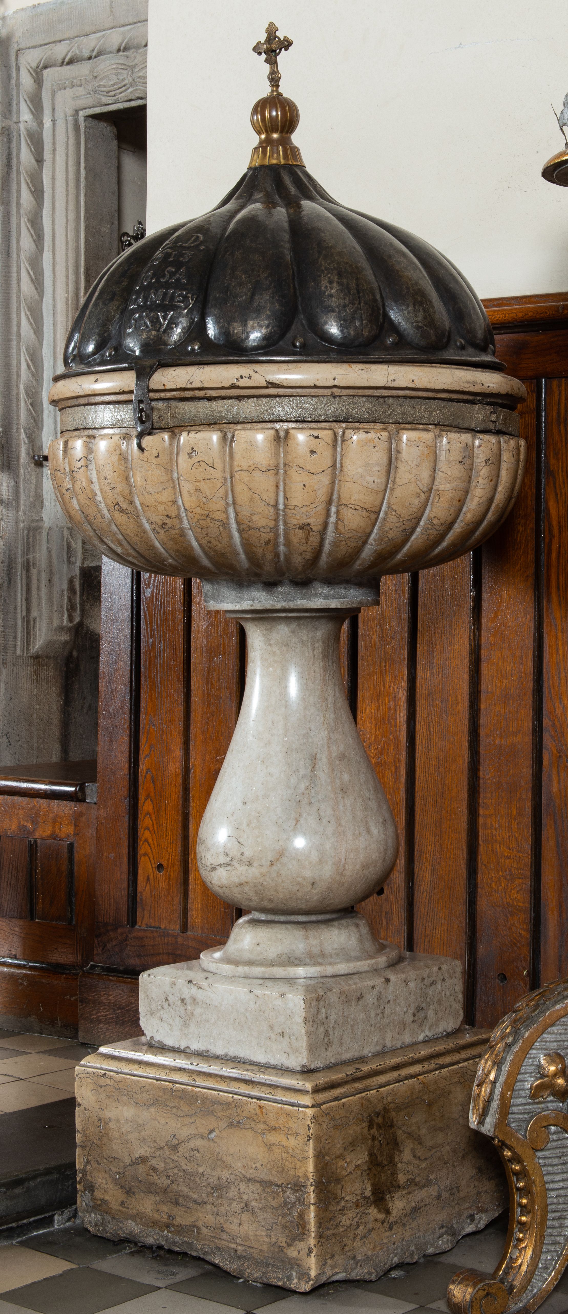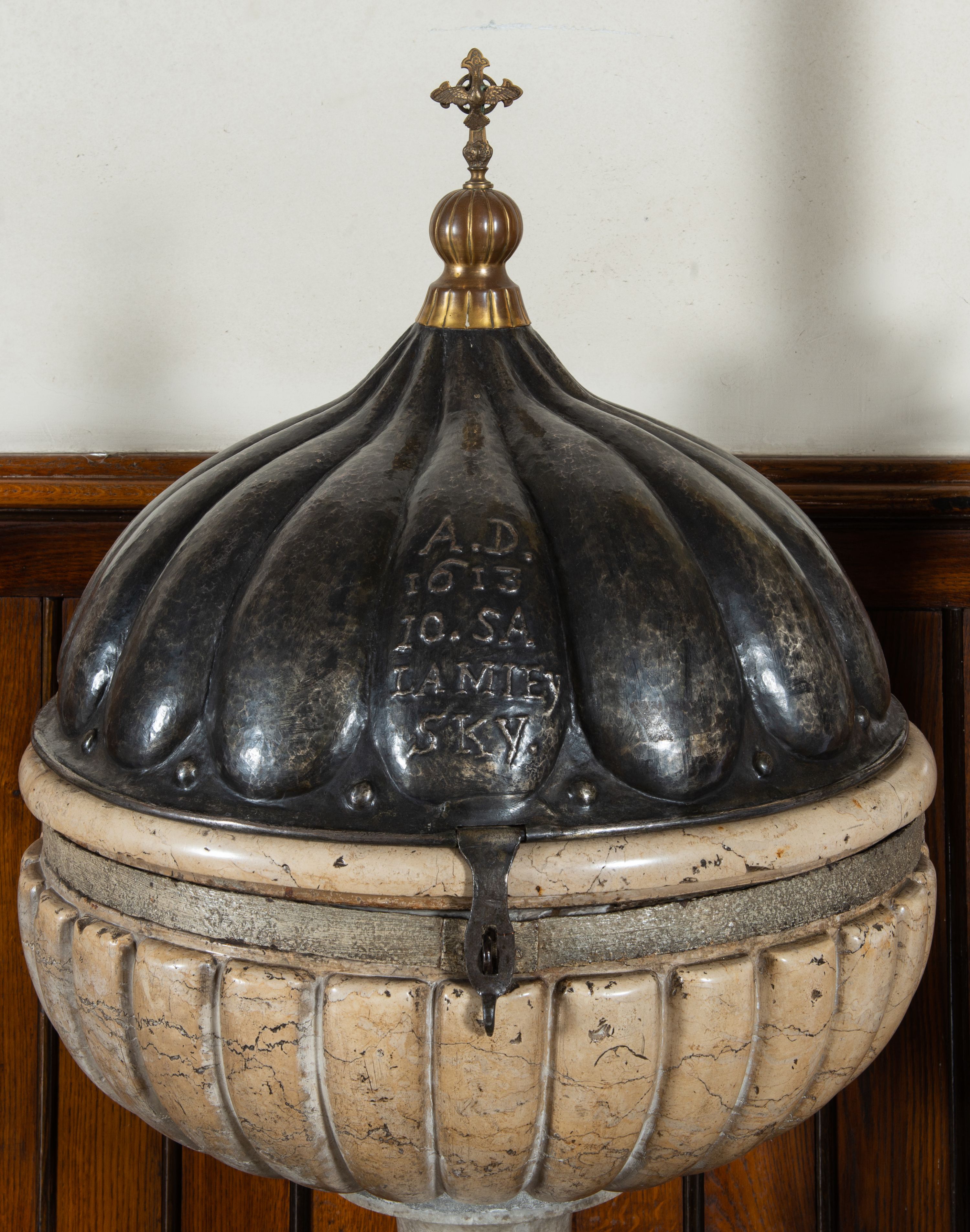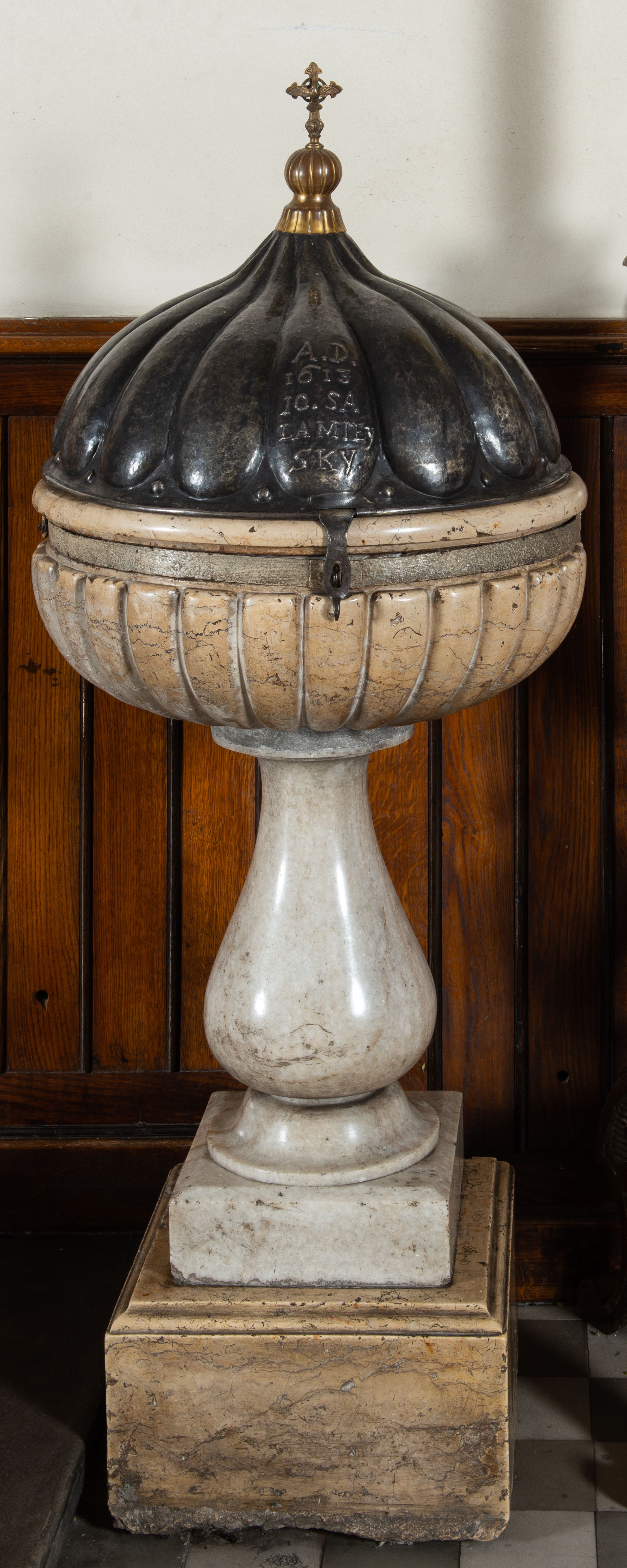 Marmurowa chrzcielnica uzyskała kształt kielicha. Na sześciennym cokole ustawiono czworoboczny postument, z którego wyrasta gruszkowa tralka podtrzymująca, spłaszczoną, sferyczną czarę dekorowaną imitacją płaskiego puklowania z wywiniętym brzegiem. Blaszana pokrywa uzyskała formę trybowanej półkuli, zakończonej aplikowaną kulą z krzyżem z gołębicą Ducha Świętego. Na pokrywie znajduje się trybowana inskrypcja: „A[NNO] D[OMINI] / 1613 /10.SA/LA MIEY/SKY".