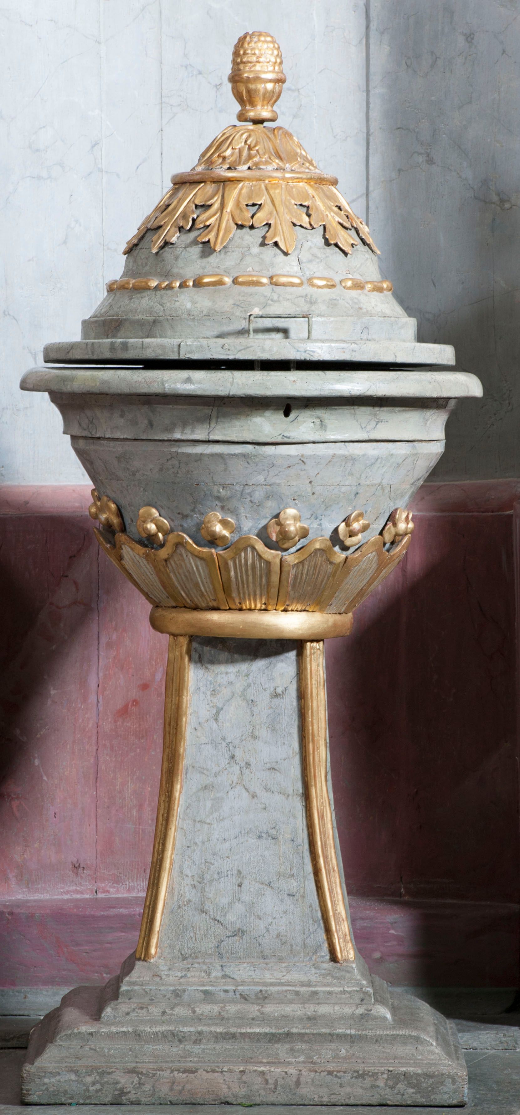 Forma, kolorystyka, zastosowana ornamentyka, w tym wieńczący strukturę wazon płomienisty wskazują, że omawiana antyambona powstała w tym samym warsztacie, co umiejscowiona naprzeciwko niej ambona.