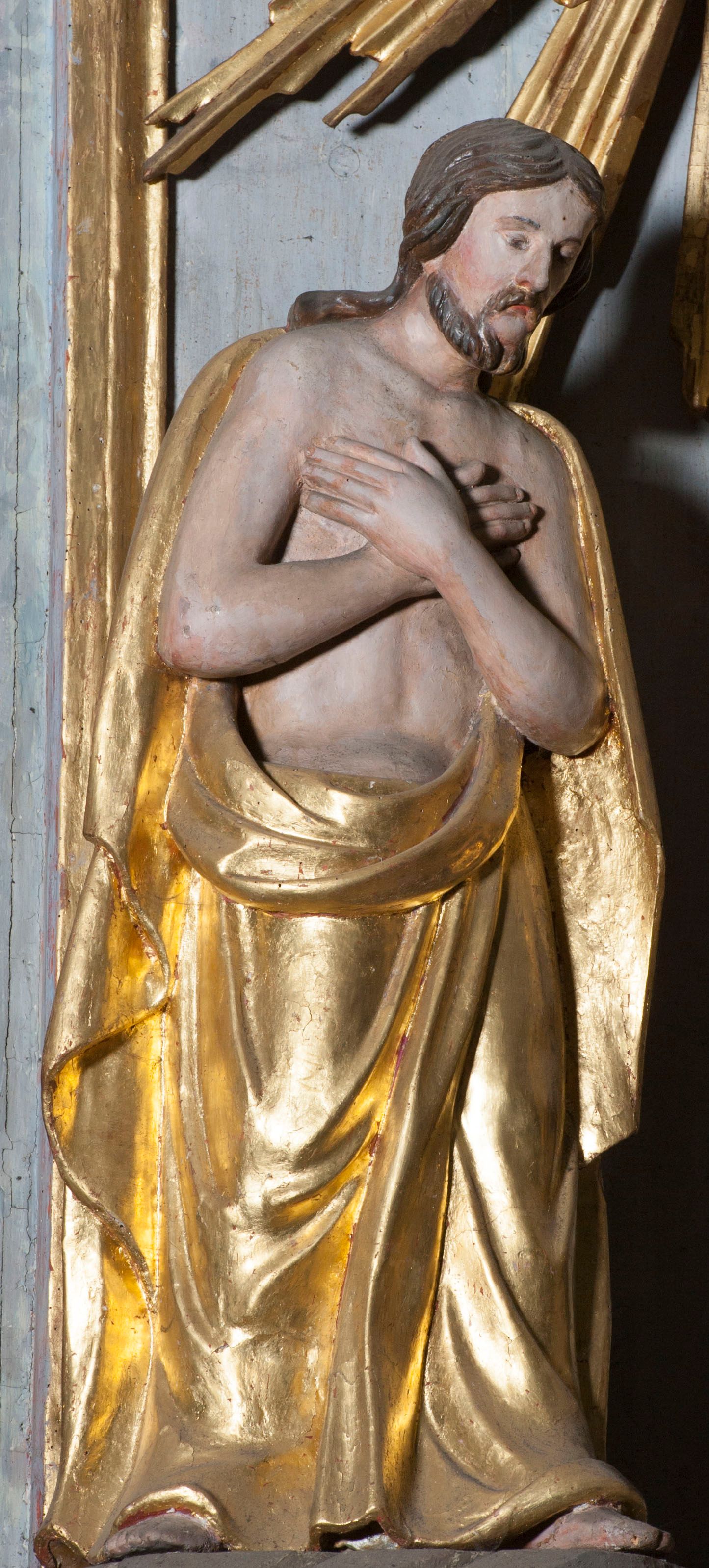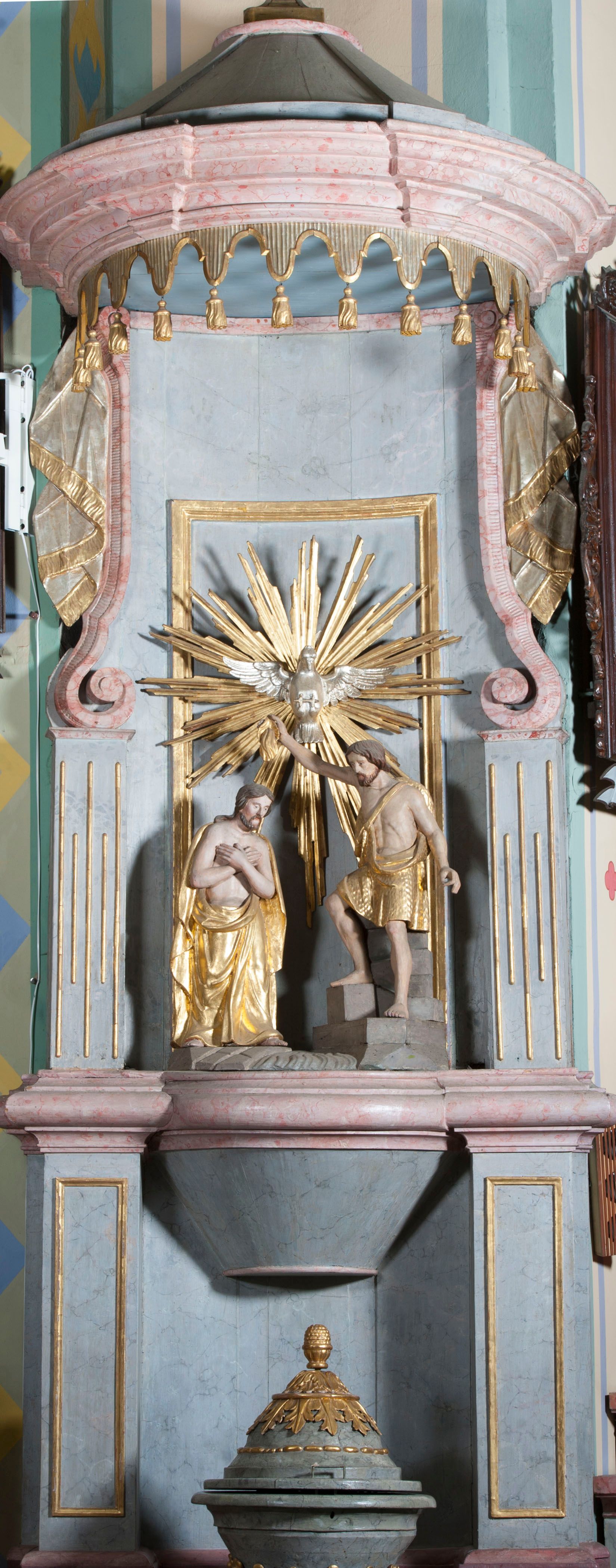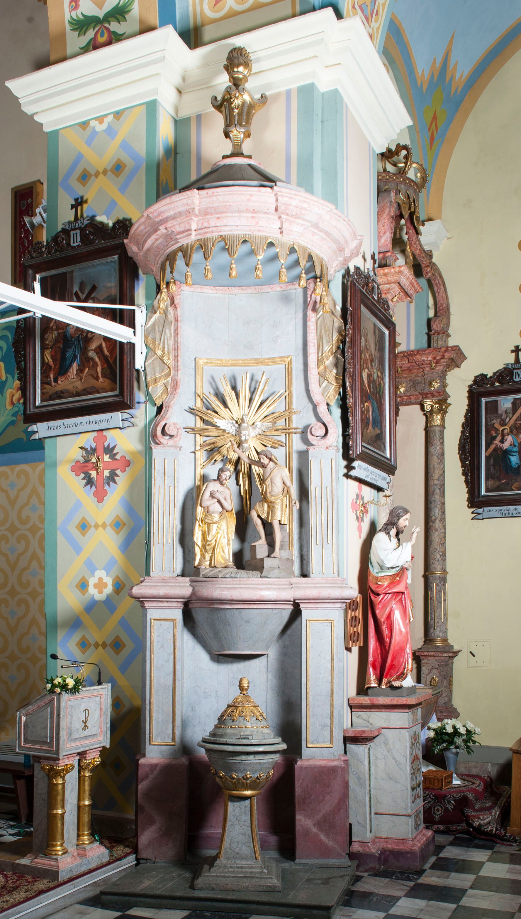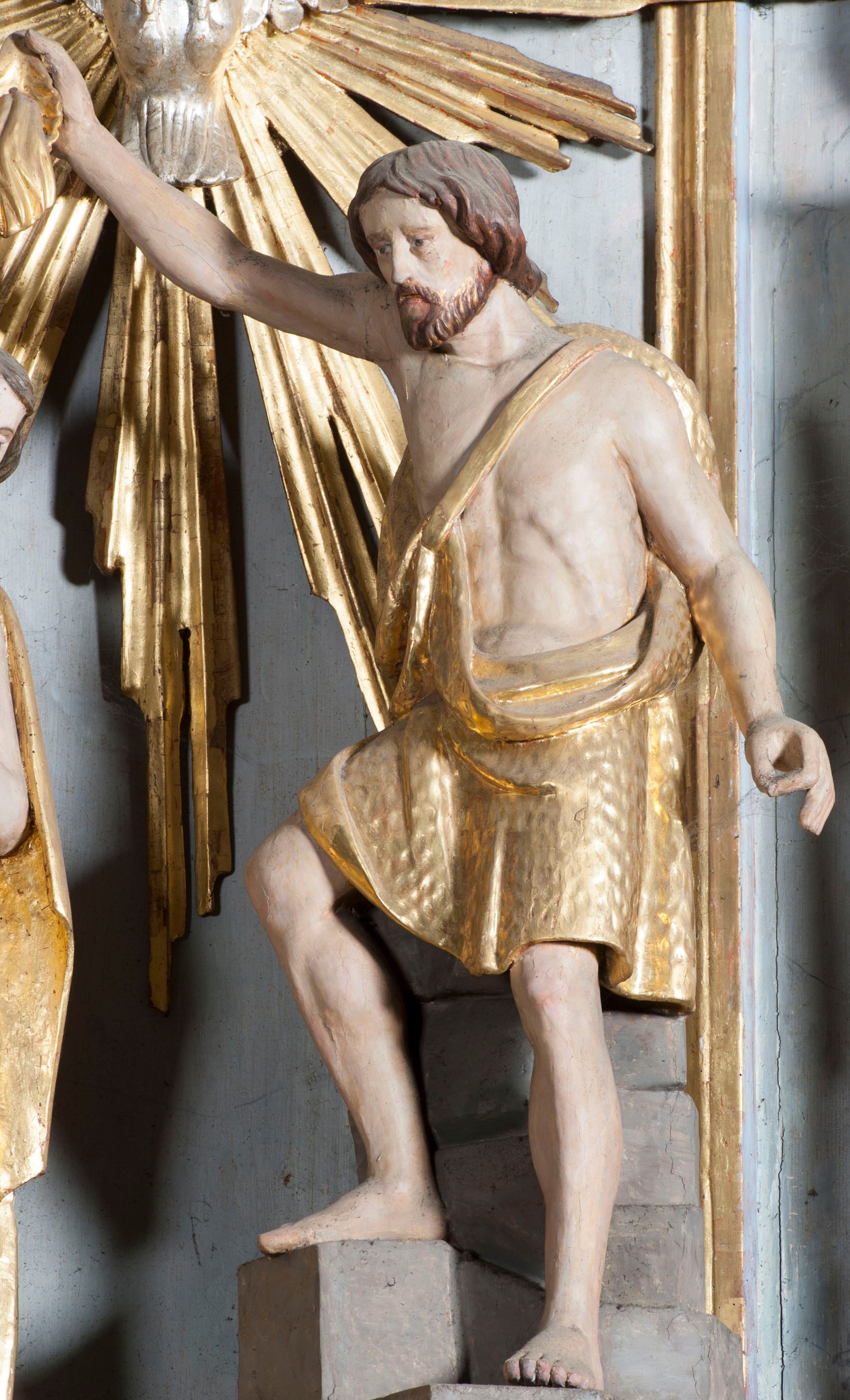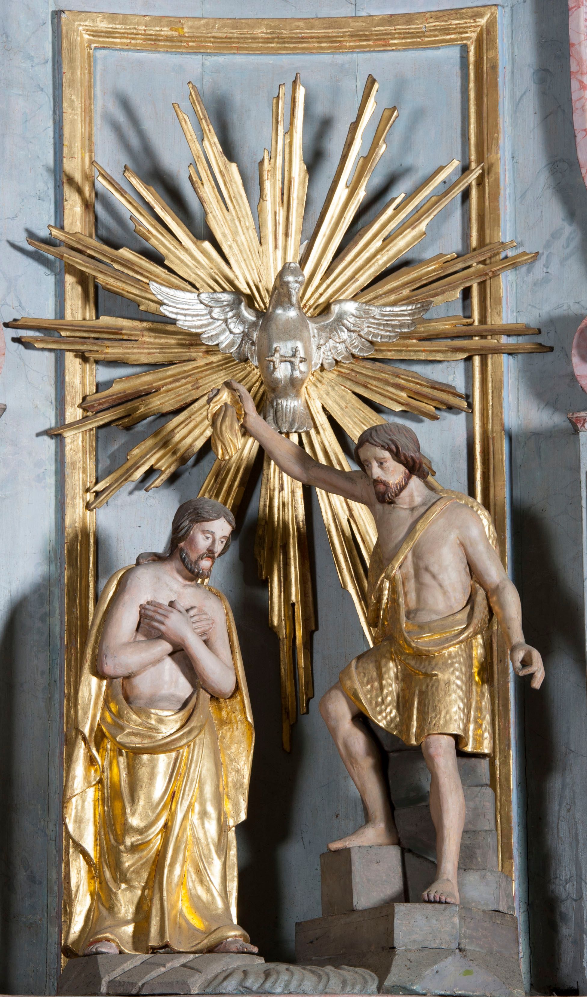 Grupa rzeźbiarska przedstawiająca scenę Chrztu Chrystusa. Rzeźby pełne, całopostaciowe. Po prawej stronie, na blikach skalnych św. Jan Chrzciciel zwrócony w prawo, z prawą nogą ustawioną wyżej, z uniesioną prawą ręką, w której trzyma muszlę z wodą, którą wylewa nad głową Chrystusa. Twarz ma pociągłą, szczupłą, okoloną krótką brodą, włosy półdługie, opadające na kark. Ubrany w osłaniający biodra płaszcz ze skóry, podtrzymywany przez taśmę przewiązaną przez lewe ramię. Po przeciwnej stronie figura Chrystusa zwróconego w trzech czwartych w lewo, w kontrapoście, delikatnie pochylonego z dłońmi skrzyżowanymi na piersi. Twarz pociągła, okolona krótką brodą, włosy długie, opadające na plecy. Na ramiona ma zarzucony płaszcz, biodra przepasane drapowaną tkaniną sięgającą kostek, tors nagi. W tle dużej wielkości gołębica Ducha Świętego na tle glorii promienistej. W odsłoniętych partiach ciała polichromia naturalistyczna, szaty złocone.