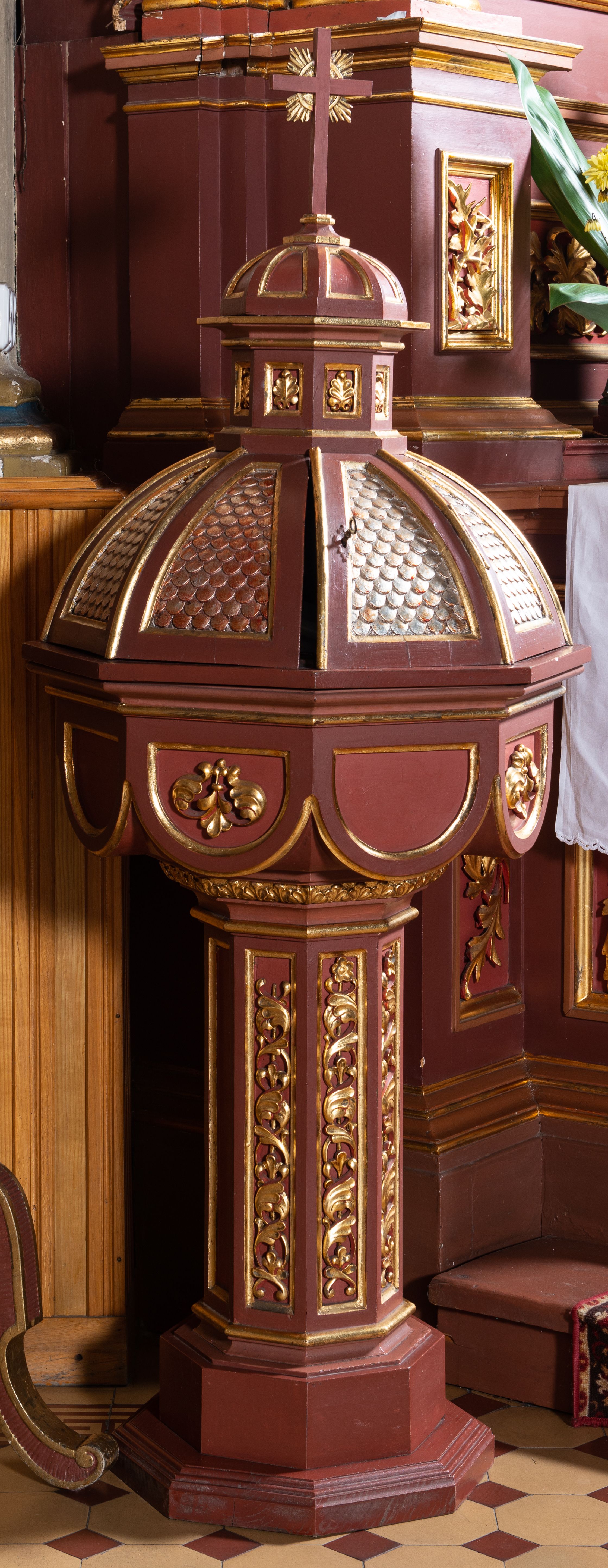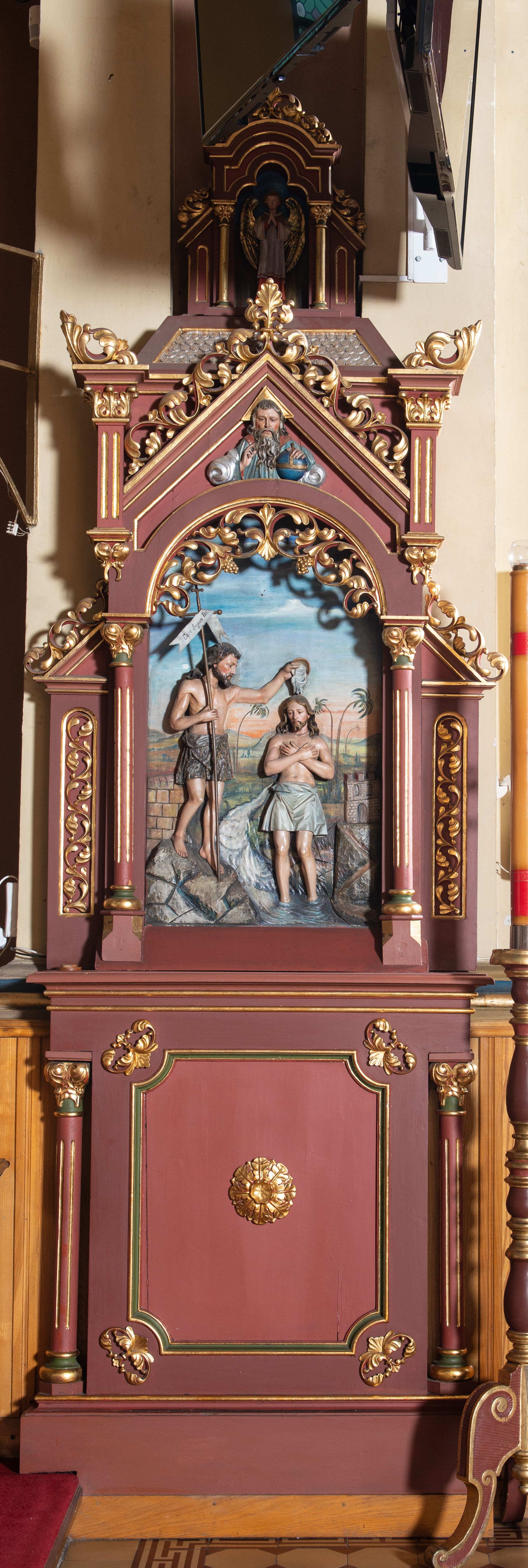 Przyjmuje się, iż usytuowana tuż obok chrzcielnicy płaskorzeźba przedstawiająca Chrzest Jezusa w Jordanie, pochodzi z poprzedniego, drewnianego kościoła. Czas jej powstania określa się na okres około 1829 roku. W Archiwum Parafialnym znajduje się informacja, iż rzeźbione obramienie ujmujące płaskorzeźbę zostało wykonane w 1896 roku wraz z ołtarzami bocznymi. Cechy stylowe wykazują jednak szereg podobieństw z retabulum ołtarza głównego, które powstało około 1905 roku.
