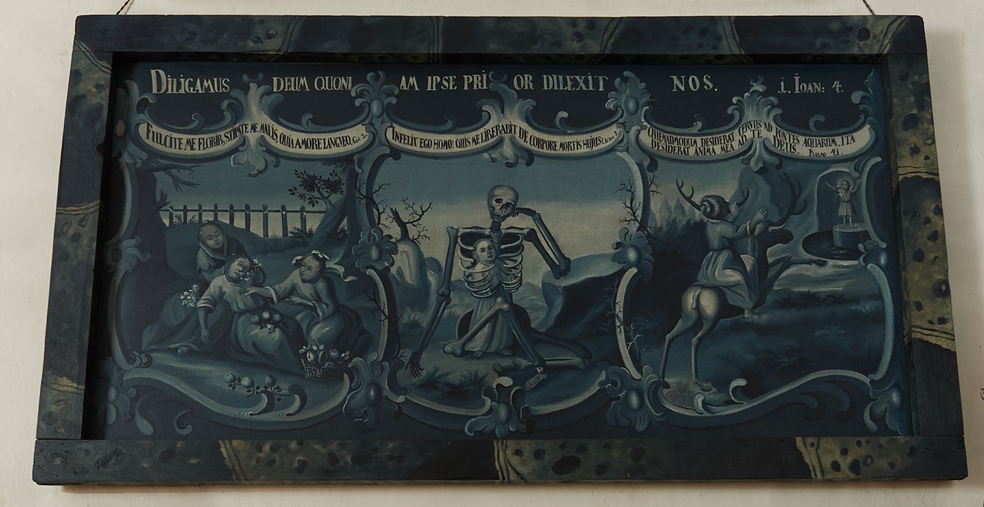 Drugi obraz z napisem w górnej linii „DILIGAMUS DEUM QUINI AM IPSE PRIOR DILEXIT NOS. 1. Ioan: 4.”. Każda ze scen ukazana jest na tle pejzażu i zwieńczona na górze kartuszem z napisem. W pierwszej od lewej ukazane są trzy postacie kobiece, z których środkowa omdlała. Pierwsza kobieta podtrzymuje jej głowę i przykłada do niej kwiaty, a trzecia kobieta klęczy i wyciąga ku niej ręce. Przed omdlałą znajduje się kosz z owocami. W wieńczącym kartuszu napis „FULCITE ME FLORIB[US], STIPATE ME MALIS, QUIA AMORE LANGVEO. Cant: 2.”. Środkowa przedstawia kościotrupa, w którego żebrach klatki piersiowej uwięziona jest modląca się postać. W wieńczącym kartuszu napis „INFELIX EGO HOMO! QUIS ME LIBERABIT DE CORPORE MORTIS HUJUS? Ad Rom: 7.”. Trzecia scena po prawej przedstawia od tyłu kobietę jadącą na jeleniu, która lewą ręką trzyma jego poroże. Kierują się w stronę znajdującego się w grocie skalnej źródła, które tryska z uskrzydlonej postaci. W wieńczącym kartuszu napis „QUEMADMODUM DESIDERAT CEVUS AD FONTES AQUARUM, ITA / DESIDETAT ANIMA MEA AD TE DEUS. Psalmo 41.”.
