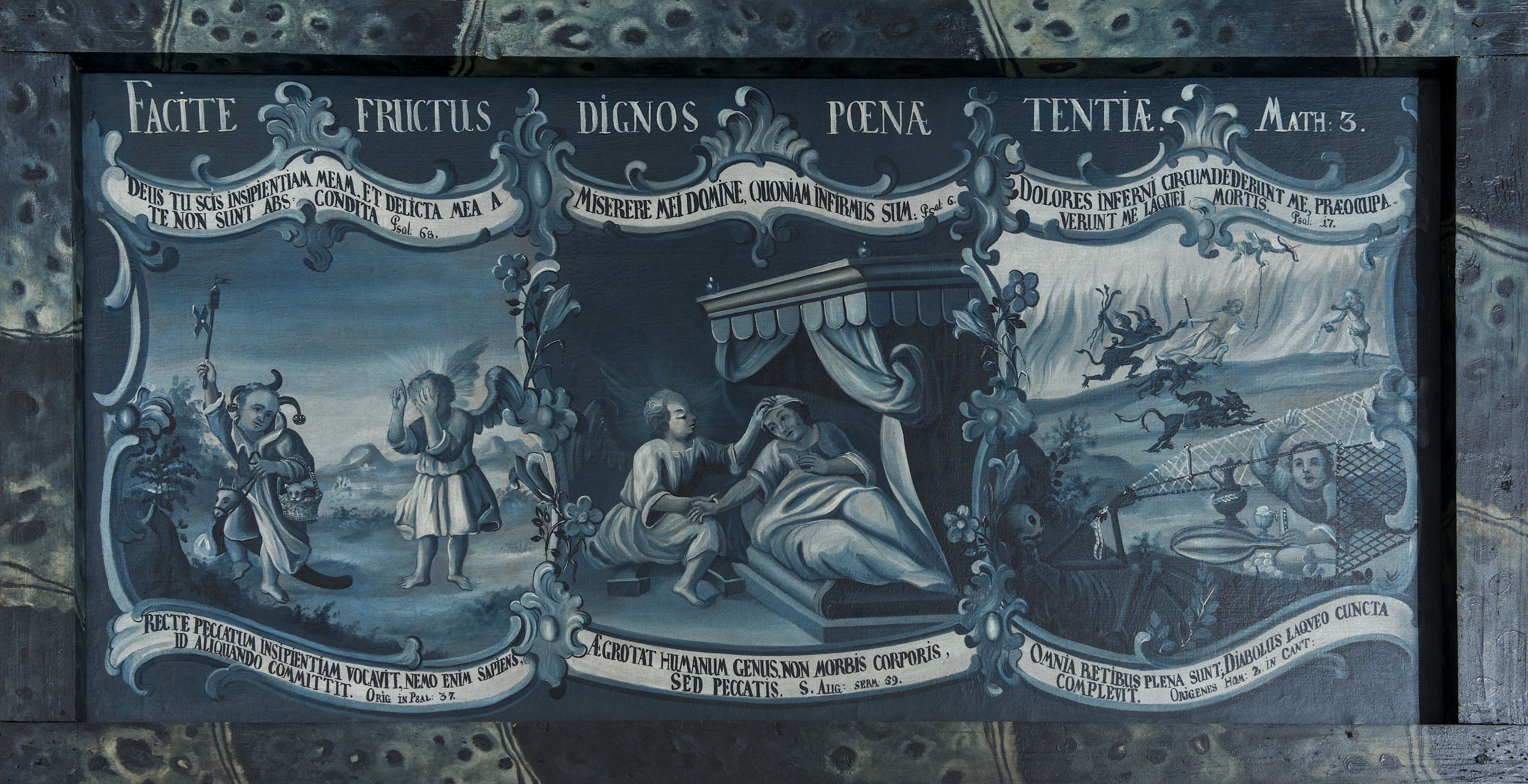Pierwszy obraz z napisem w górnej linii „FACITE FRUCTUS DIGNOS POENAE TENTIAE. MATH: 3.”. Każda ze scen ujęta jest na górze i na dole kartuszami z napisami. Pierwsza od lewej jest na tle pejzażu i przedstawia ukazanego frontalnie, tańczącego błazna. Na drugim planie znajduje się uskrzydlona postać, w tunice, z głową w glorii, która lewą ręką zakrywa twarz, prawą z palcem wskazującym kieruje do góry. W górnym kartuszu napis „DEUS TU SCIS INSIPIENTIAM MEAM, ET DELICTA MEA A / TE NON SUNT ABS CONDITA Psal: 68.”, w dolnym „RECTE PECCATUM INSIPIENTIAM VOCAVIT, NEMO ENIM SAPIENS, / ID ALIQUANDO COMMITTIT. Orig in Psal: 37.”. Środkowa scena ukazana jest we wnętrzu, w którym po prawej stronie znajduje się łoże z baldachimem, z leżącą w nim chorą i płaczącą kobietą. W lewej części sceny, przy łóżku siedzi zwrócona profilem uskrzydlona postać w tunice, która prawą ręką trzyma za dłoń chorą, lewą kładzie na jej głowie. W górnym kartuszu napis „MISERERE MEI DOMINE, QUONIAM INFIRMUS SUM: Psal: 6.”, w dolnym „AEGROTAT HUMANUM GENUS, NON MORBIS CORPORIS, / SED PECCATIS. S. Aug: serm: 59.”. Trzecia scena ukazana jest na tle fantastycznego pejzażu. Na pierwszym planie leży ukazany z profilu kościotrup, który złapał w sieć, próbującą się wyrwać leżącą postać, przed którą znajdują się naczynia, owoce i lutnia. Na drugim planie na tle ognia trzy diabły ścigają uciekającą postać z pochodnią. Przed nią inna postać dmie w trąbę, druga, uskrzydlona nadlatuje z łukiem zrzucając uciekającej linę. W górnym kartuszu napis „DOLORES INFERNI CIRCUMDEDERUNT ME, PRAEOCCUPA=/VERUNT ME LAQUEI MORTIS. Psal. 17.”, w dolnym „OMNIA RETIBUS PLENA SUNT; DIABOLUS LAQVEO CUNCTA / COMPLEVIT. Origines Hom: 2. in cant:”.