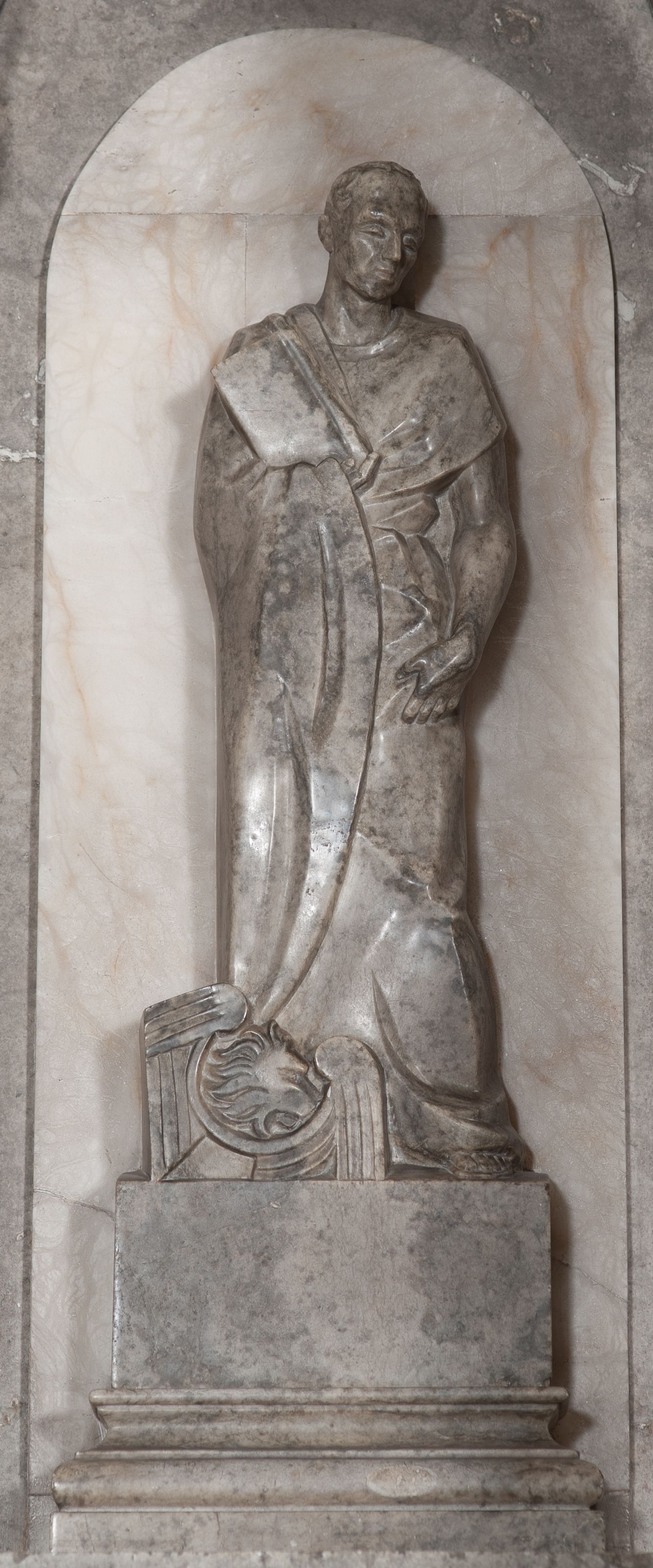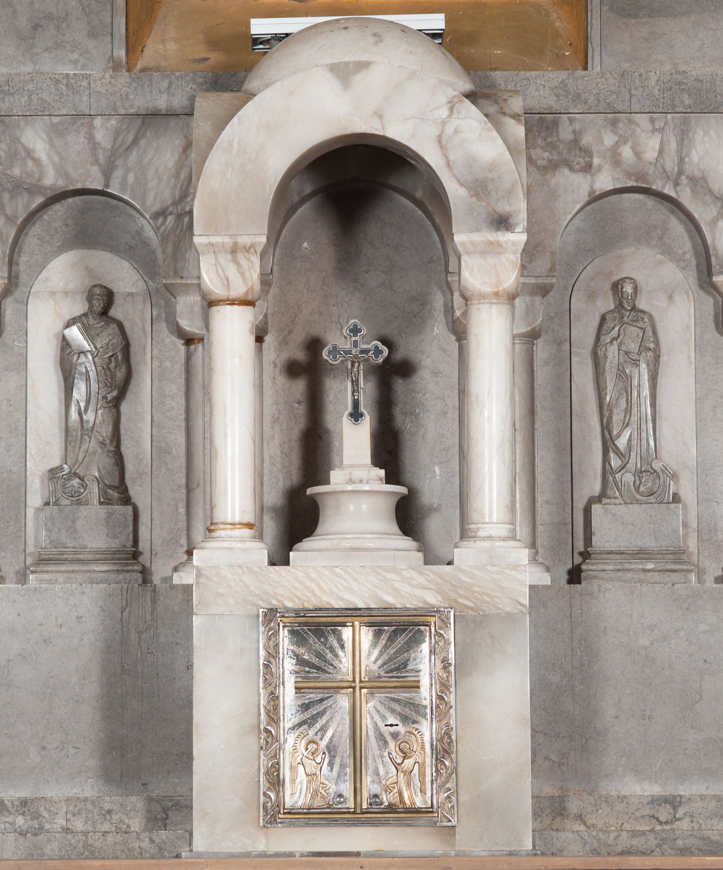 Płaskorzeźbione przedstawienia ewangelistów ukazanych całopostaciowo, w pozycji stojącej, umieszczone na prostopadłościennych, profilowanych u podstawy postumentach. Święty Jan Ewangelista ujęty jako młody, długowłosy mężczyzna z ciałem zwróconym w trzech czwartych w lewo. Głowa pochylona do dołu, twarz szczupła, o regularnych rysach i prostym nosie. Święty w swojej lewej ręce trzyma otwartą księgę, prawą dłonią wskazuje na zapisany w niej tekst. Postać ubrana w długą, obszerną szatę o szerokich rękawach i luźno przerzucony przez prawe ramię płaszcz. U stóp świętego z lewej strony kompozycji przedstawiony atrybut św. Jana – orzeł. Święty Marek został ukazany frontalnie, jako dojrzały, krótkowłosy mężczyzna. Głowa przechylona nieznacznie w lewą stronę, twarz okrągła z wyraźnie zaznaczonym, prostym nosem. Święty w swojej prawej, ugiętej w łokciu ręce trzyma zamkniętą księgę. Lewa ręka o wyraźnie zaznaczonej muskulaturze opuszczona wzdłuż ciała, dłoń wsparta na udzie. Postać ubrana w długą szatę o krótkim rękawie oraz obszerny, luźno zarzucony na prawe ramię płaszcz. U stóp świętego, z lewej strony kompozycji ukazany atrybut w postaci uskrzydlonej lwiej głowy. Święty Łukasz został przedstawiony frontalnie jako dojrzały, krótkowłosy mężczyzna o owalnej twarzy i krótkiej brodzie. Postać oburącz trzyma zamkniętą księgę. Święty ubrany jest w długą szatę oraz okrywający całą sylwetkę płaszcz. U stóp postaci z prawej strony kompozycji przedstawiono atrybut św. Łukasza w postaci uskrzydlonej głowy wołu. Ostatni z ewangelistów – św. Mateusz został ukazany ciałem zwróconym w trzech czwartych w prawo i głową ujętą z profilu oraz pochyloną do dołu. Ewangelistę przedstawiono jako starszego mężczyznę o dłuższych, falowanych i przerzedzonych nad czołem włosach i krótkiej brodzie. Postać ubrana w długą szatę oraz obszerny płaszcz w obu rękach trzyma zamkniętą księgę. U stóp św. Mateusza, z prawej strony kompozycji przedstawiono jego atrybut – uskrzydloną głowę anioła.