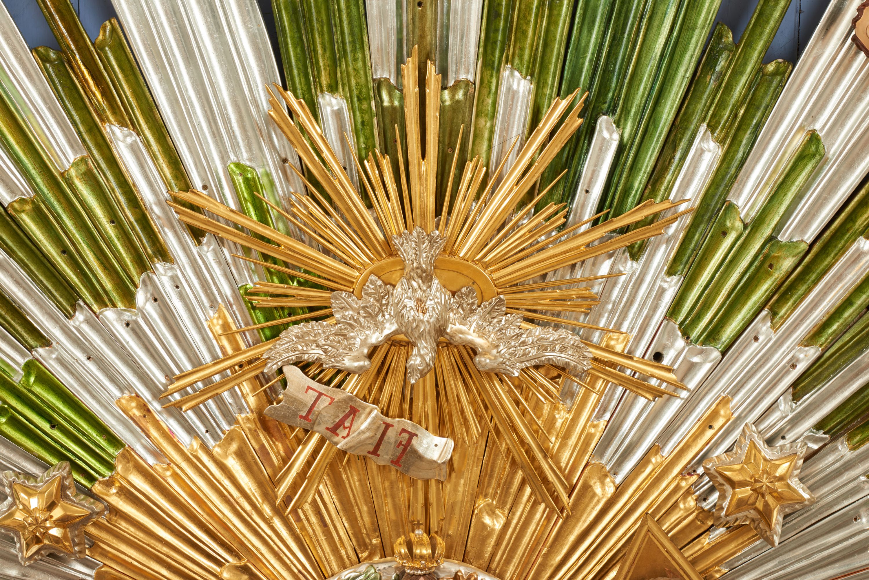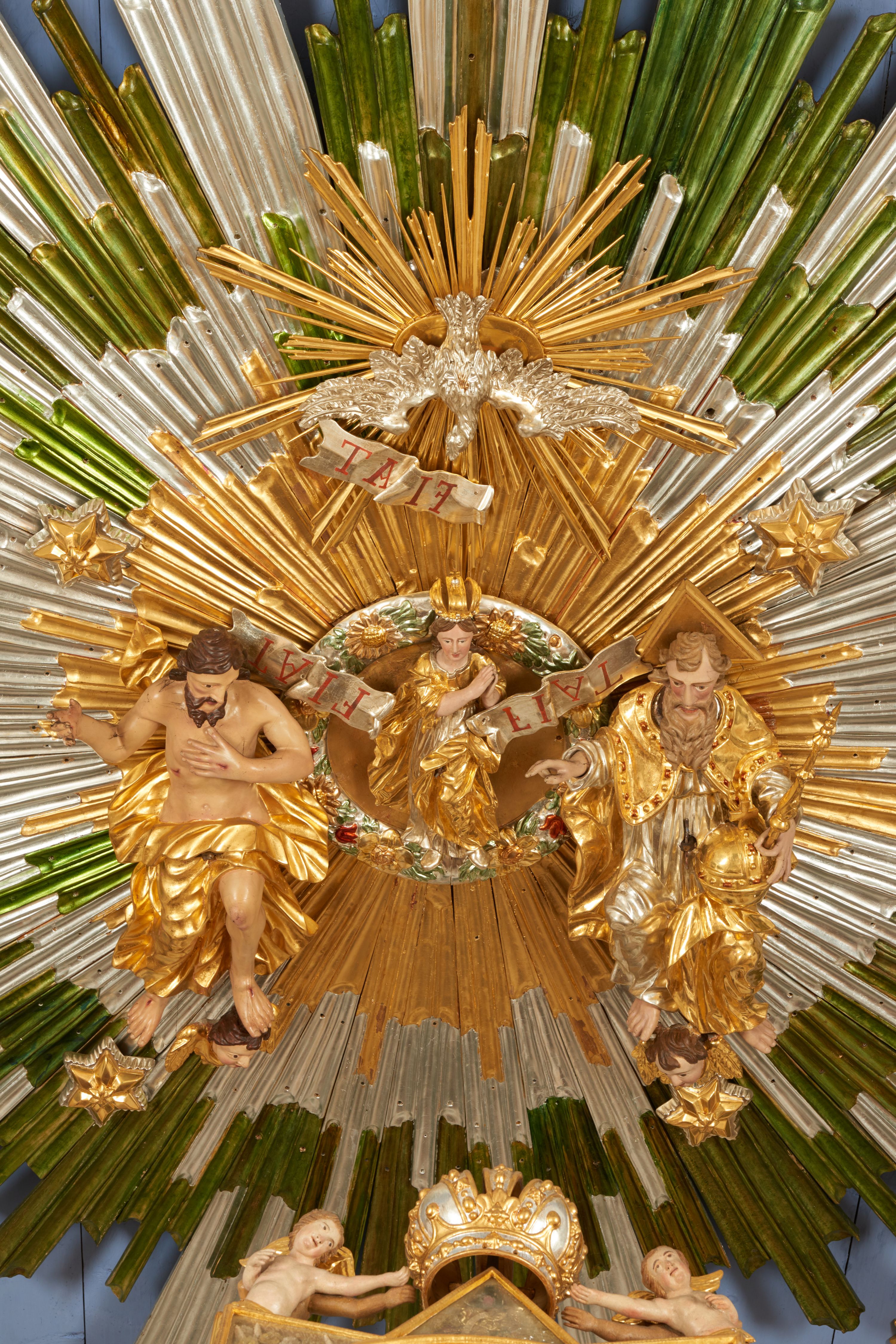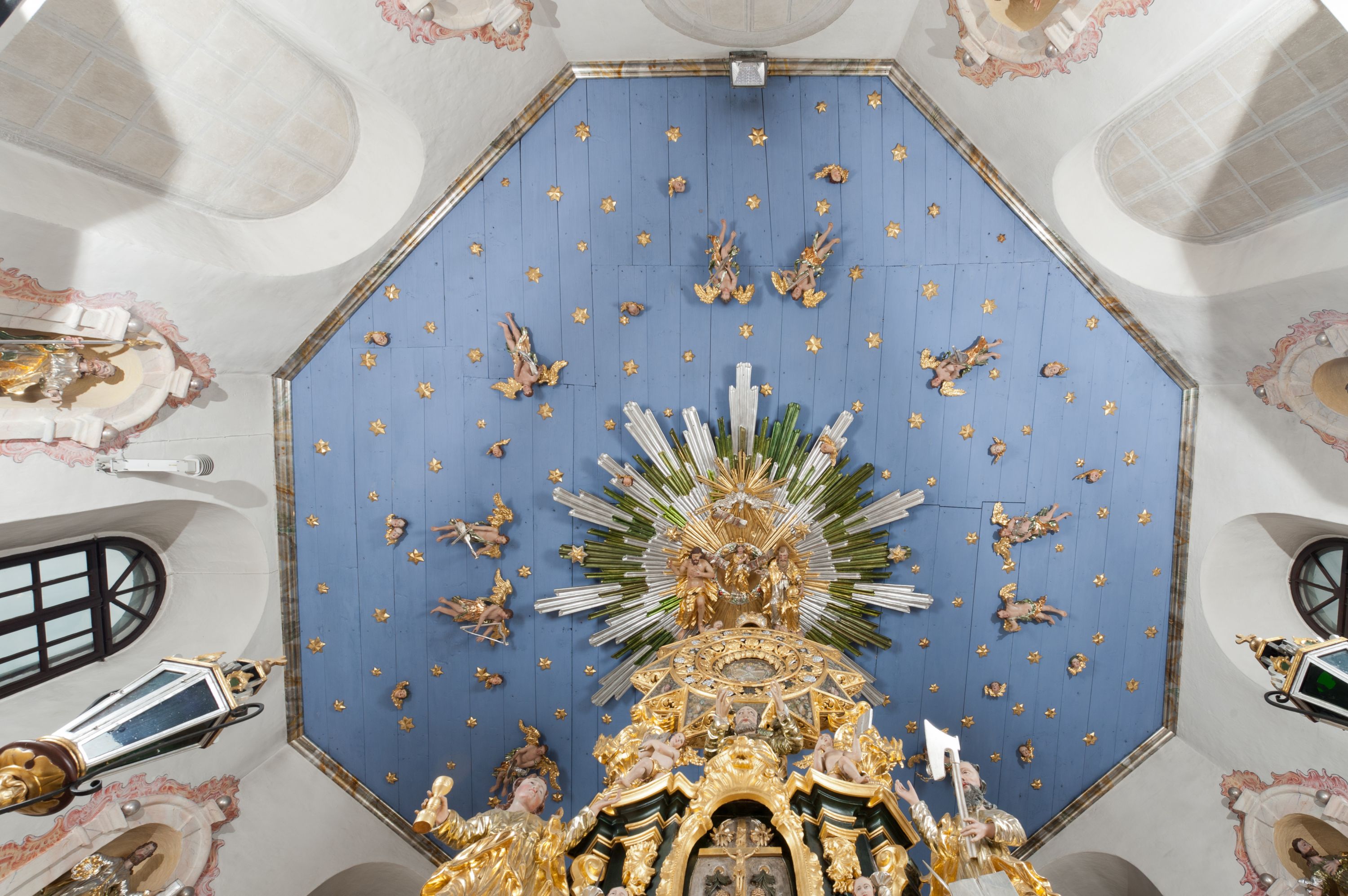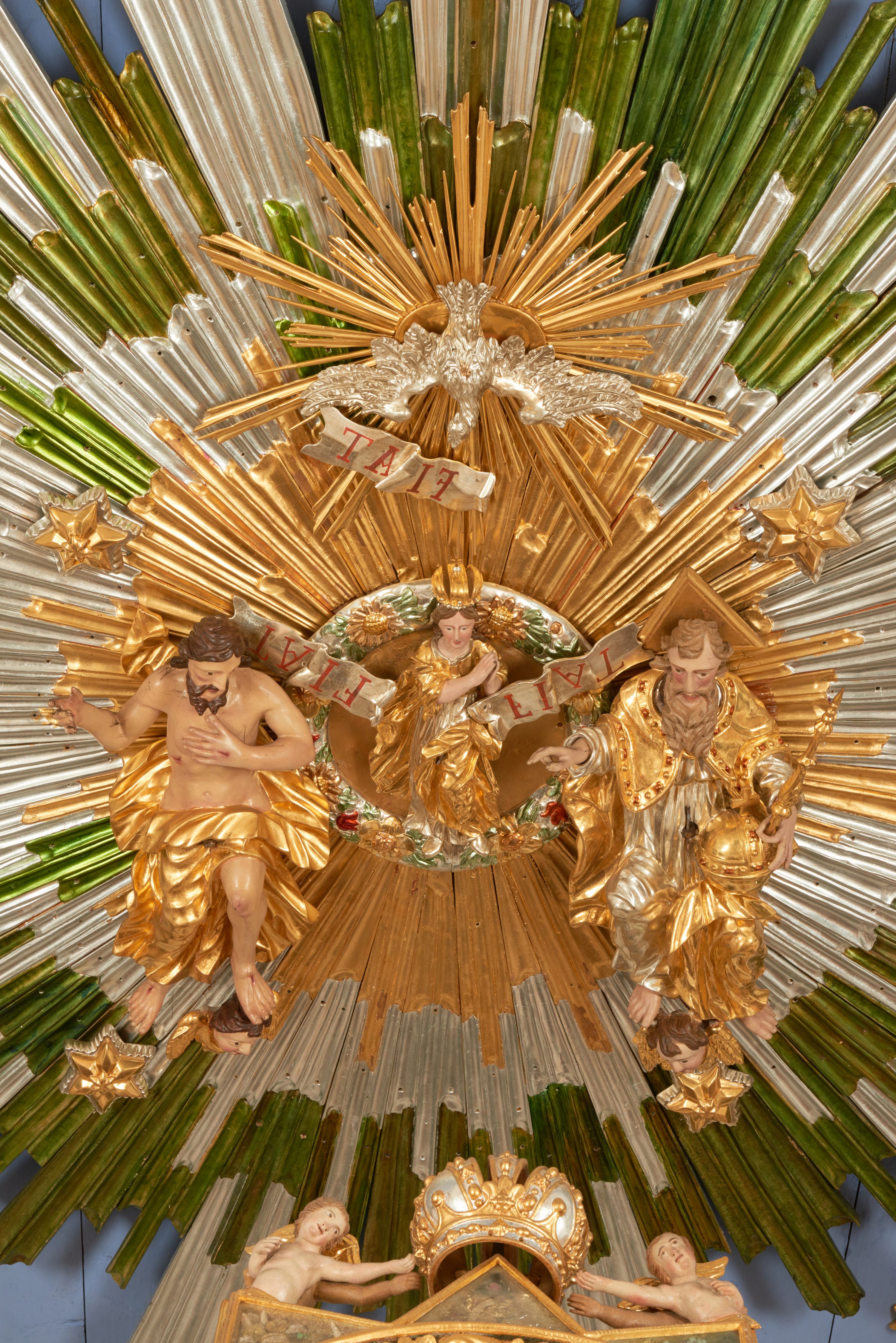 Drewniany, polichromowany na niebiesko strop, na planie ośmioboku, ujęty profilowaną ramą. W jego centrum grupa Koronacji Marii w glorii promienistej. W środku grupy figura Matki Boskiej na tle opaski dekorowanej kwiatami. Maria ukazana frontalnie, w kontrapoście, z rękami złożonymi w geście modlitwy. Twarz ma pociągłą, szczupłą, o młodzieńczych rysach, okoloną długimi włosami, upiętymi z tyłu głowy. Ubrana jest w srebrzoną suknię oraz złocony płaszcz narzucony na ramiona i zawinięty na lewej nodze, na głowie ma koronę zamkniętą. Marię flankują dwie banderole z napisem: „FIAT”. Po jej prawej znacznie większa figura Chrystusa, ukazanego frontalnie, w pozycji siedzącej, z głową skierowaną do wewnątrz; jego lewa ręka spoczywa na piersi, prawa jest ugięta i uniesiona w geście wskazującym. Twarz ma pociągłą, szczupłą, okoloną brodą skręconą w dwa pukle, oraz kręconymi włosami. Chrystus przewiązany jest w partii bioder złoconym płaszczem otaczającym postać i odsłaniającym lewą nogę. Jego ciało w odsłoniętych partiach, ma delikatnie zarysowaną muskulaturę, z zaznaczonymi śladami męki. Po lewej stronie Marii znacznie większa figura Boga Ojca, ukazanego frontalnie, w pozycji siedzącej. Lewą ręką przytrzymuje jabłko królewskie, w dłoni dzierży berło, prawą wyciąga w geście błogosławieństwa. Twarz ma pociągłą, o starczych rysach, okoloną długą, kręconą brodą opadającą na pierś oraz krótkimi włosami. Ubrany jest w obficie drapowaną srebrzoną tunikę, przepasaną w talii oraz złocony płaszcz z dekoracyjną, kameryzowaną lamówką, zapięty na piersi i opadający na boki, z zawiniętym fragmentem tkaniny na lewej nodze. Nad postaciami nadlatująca gołębica Ducha Świętego w glorii promienistej z banderolą z napisem: „FIAT”. Grupa na tle trzystrefowej glorii promienistej dekorowanej gwiazdami i uskrzydlonymi główkami anielskimi. Glorię z grupą Koronacji otacza dwunastu aniołów, ułożonych naprzemiennie w cztery pary muzykujących postaci (ze skrzypcami, wiolonczelą, gitarą, trąbką, harfą) z czterema aniołami podtrzymującymi tace z symbolicznymi przedmiotami (różaniec, wieniec laurowy, chleb (?), dyscyplina). Strop dekorowany jest w całości gwiazdami i uskrzydlonymi główkami anielskimi. Figury w partiach ciała polichromowane są naturalistycznie, ich szaty są złocone, srebrzone i laserowane; atrybuty są srebrzone.