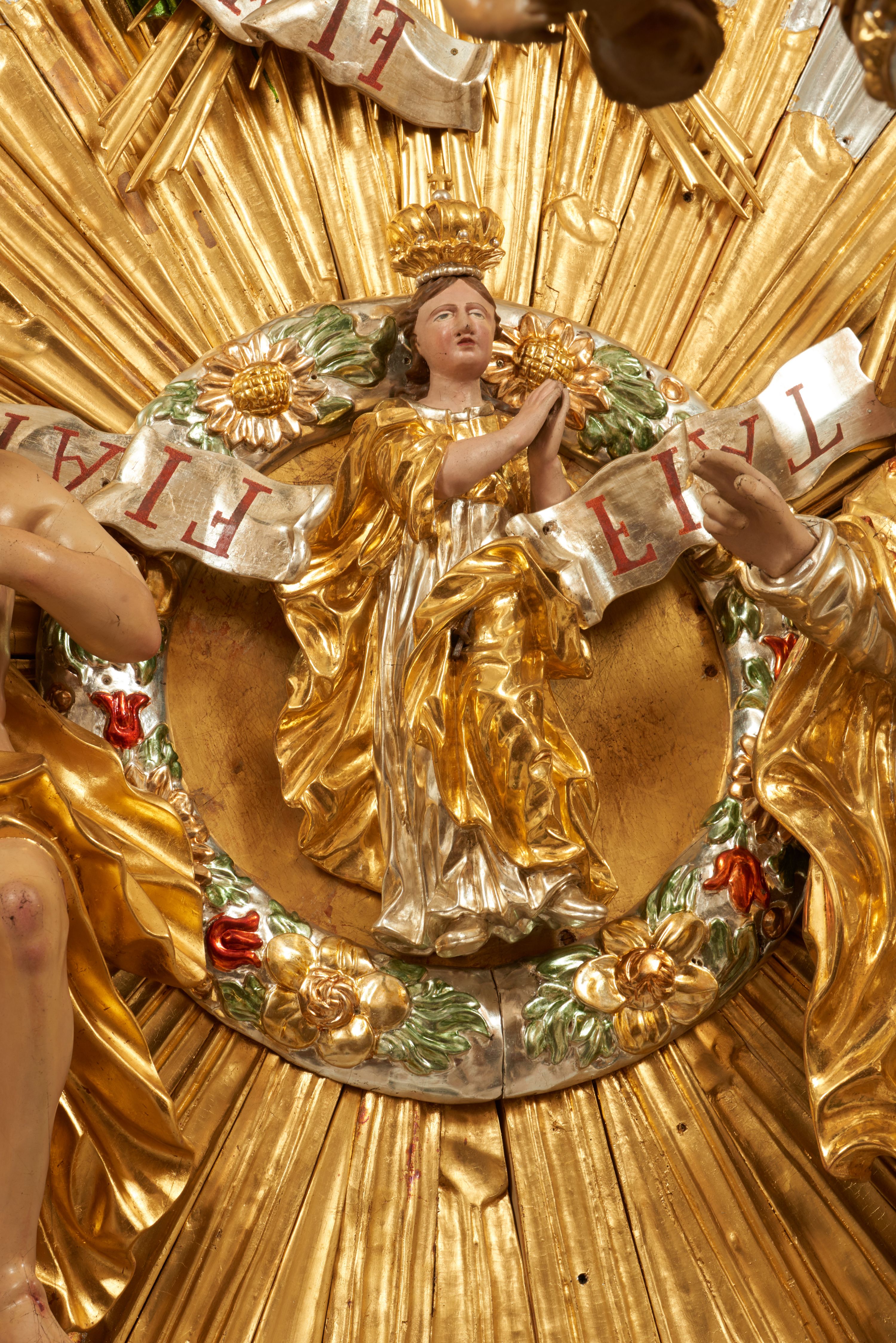 Koronacja Najświętszej Marii Panny stanowi ostatni epizod z życia Marii po Wniebowzięciu. Nie został on opisany w Nowym Testamencie, jakkolwiek podstawy do kultu Marii jako Królowej Niebios dały inne teksty, jak Pieśń nad Pieśniami oraz starotestamentowe figury Marii, mianowicie Estera (Est 2, 16-17) i Betsabe (1 Krl 2, 19). Omawiane dzieło odwołuje się do nowożytnego sposobu ukazania tego tematu z unoszącą się wśród obłoków Marią, którą koronuje Trójca Święta, w postaci tronujących w niebie Boga Ojca i Chrystusa, nad nimi zaś unosi się gołębica Ducha Świętego.