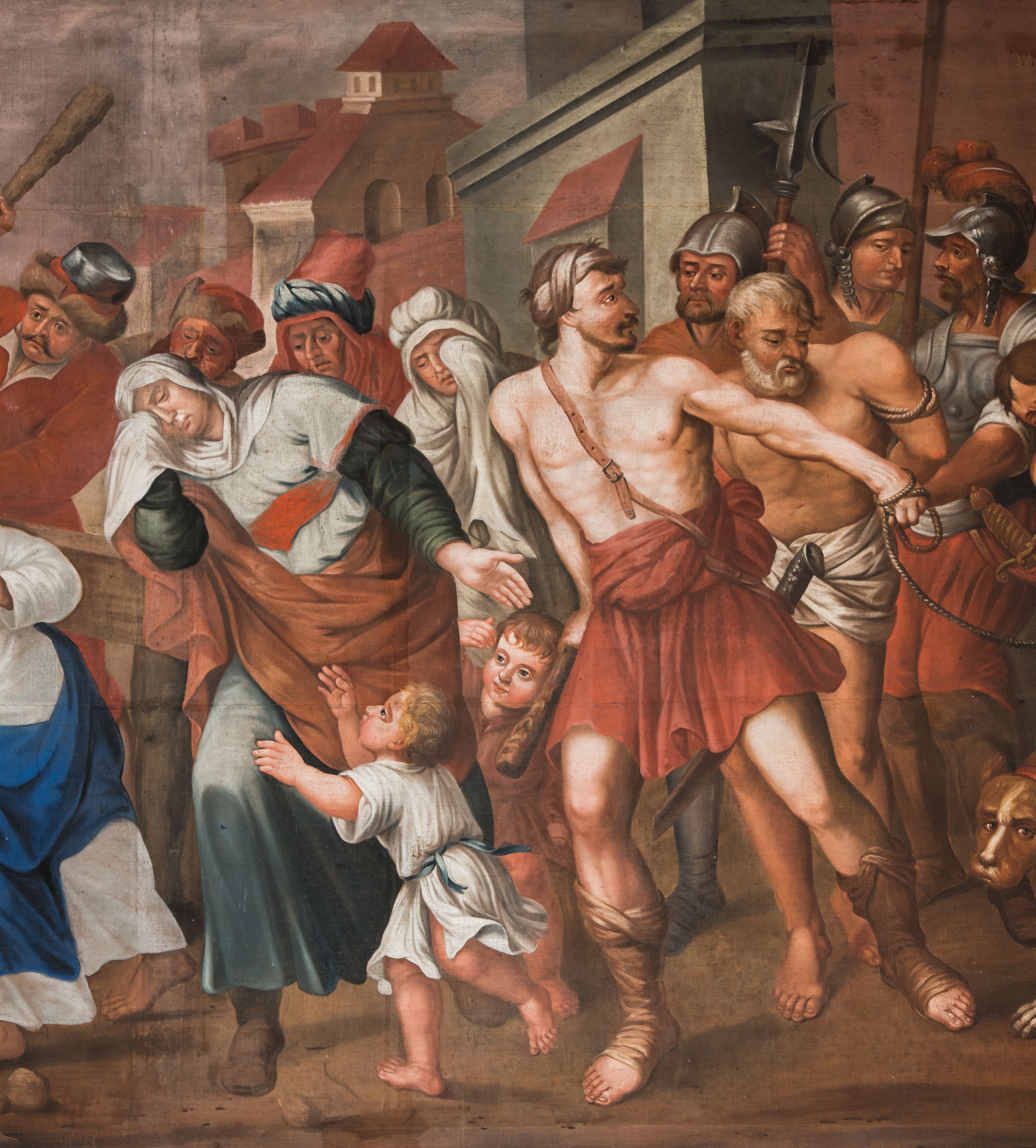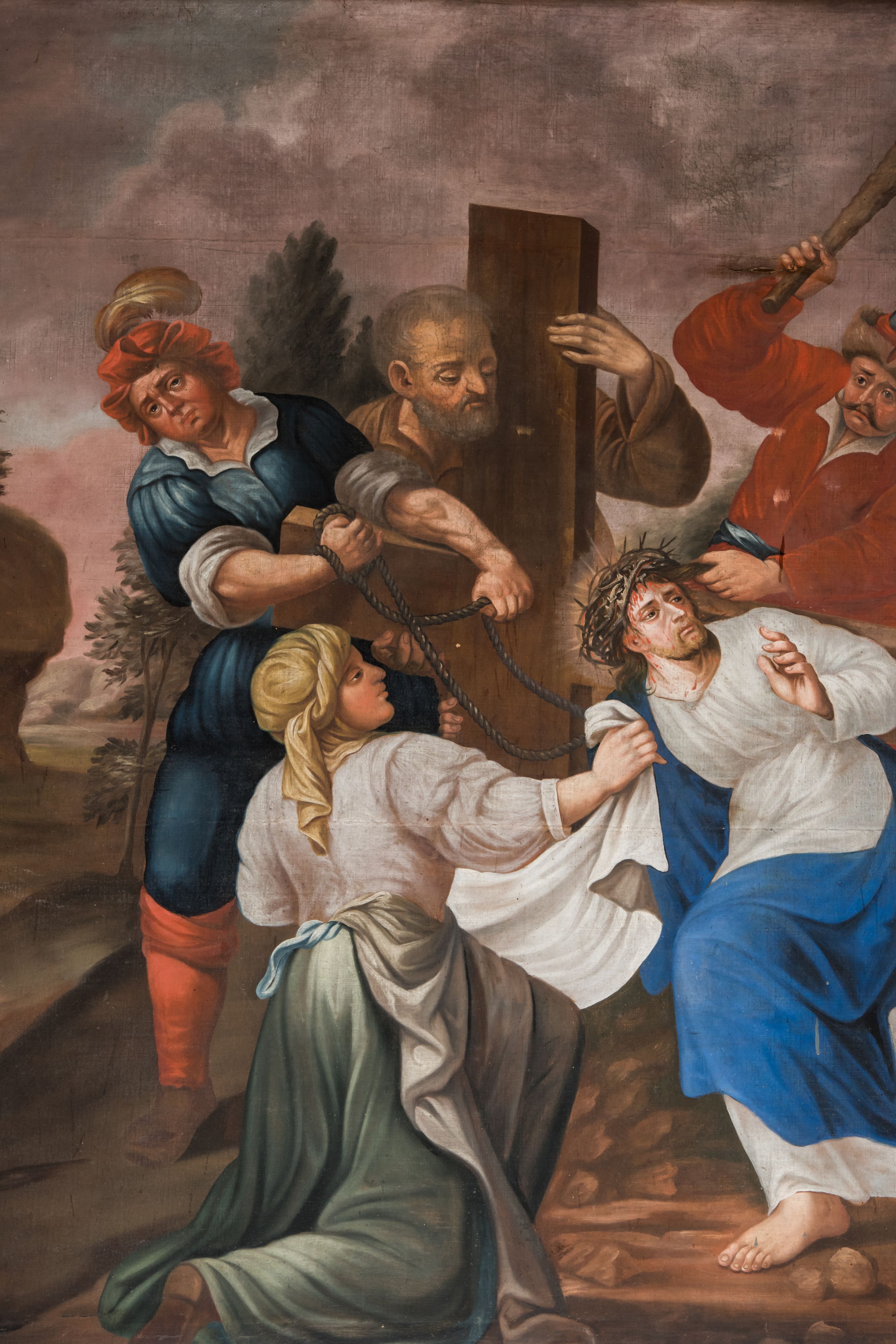 Znajdujący się w kościele Reformatów w Kętach obraz odnoszący się do drogi, jaką przebył Jezus na Golgotę, ukazuje niemal wszystkie wydarzenia uwzględnione w cyklu stacji drogi krzyżowej. Większość z nich ma ewangeliczne źródło. Kompozycja przedstawiająca wyprowadzanego z Jerozolimy przez żołnierzy rzymskich Jezusa ukazuje zatem m.in. św. Szymona z Cyreny, „który wracał z pola, i włożyli na niego krzyż, aby go niósł za Jezusem” (Łk 23, 26). Jezus zwraca się także do grupy podążających za nim płaczących kobiet prowadzących dzieci: „Córki jerozolimskie, nie płaczcie nade mną; płaczcie raczej nad sobą i nad dziećmi waszymi!” (Łk 23, 28). W tłumie po prawej stronie kompozycji, widoczne są półnagie sylwetki łotrów ze związanymi do tyłu rękoma, ponieważ „prowadzono też innych dwóch – złoczyńców, aby ich z Nim stracić” (Łk 23, 32). Postacią przedstawioną po lewej stronie kompozycji, która jest bohaterką szóstej stacji drogi krzyżowej, jest św. Weronika. Miała ona otrzeć chustą twarz umęczonego Jezusa. Sylwetkę świętej, niewymienionej w tekście Ewangelii, utożsamiano z kobietą uzdrowioną przez Jezusa z choroby krwotocznej (Mt 9, 20), jedną z niewiast podążających za niosącym krzyż Jezusem (Łk 23, 27-31) czy Martą, która wraz z siostrą Marią przyjęły Jezusa w swym domu (Łk 10, 38-42). Średniowieczne teksty hagiograficzne w dużej mierze wpłynęły na znaczny rozwój kultu świętej, związanego głównie z jej chustą. Obraz, podobnie, jak przedstawiające Opłakiwanie płótno, został wykonany w 1842 roku przez nieznanego artystę.