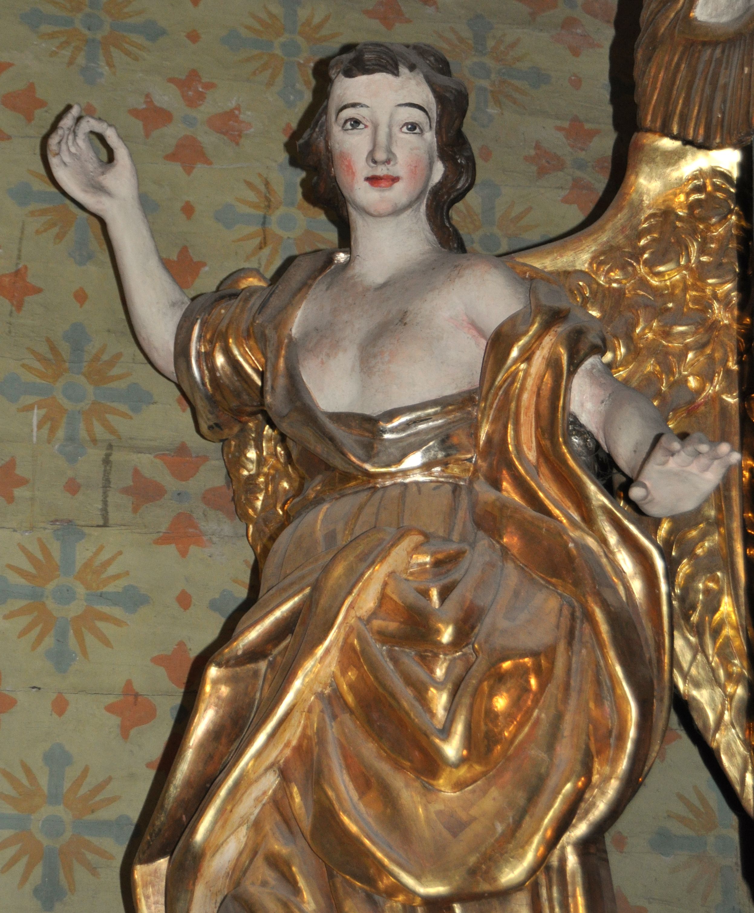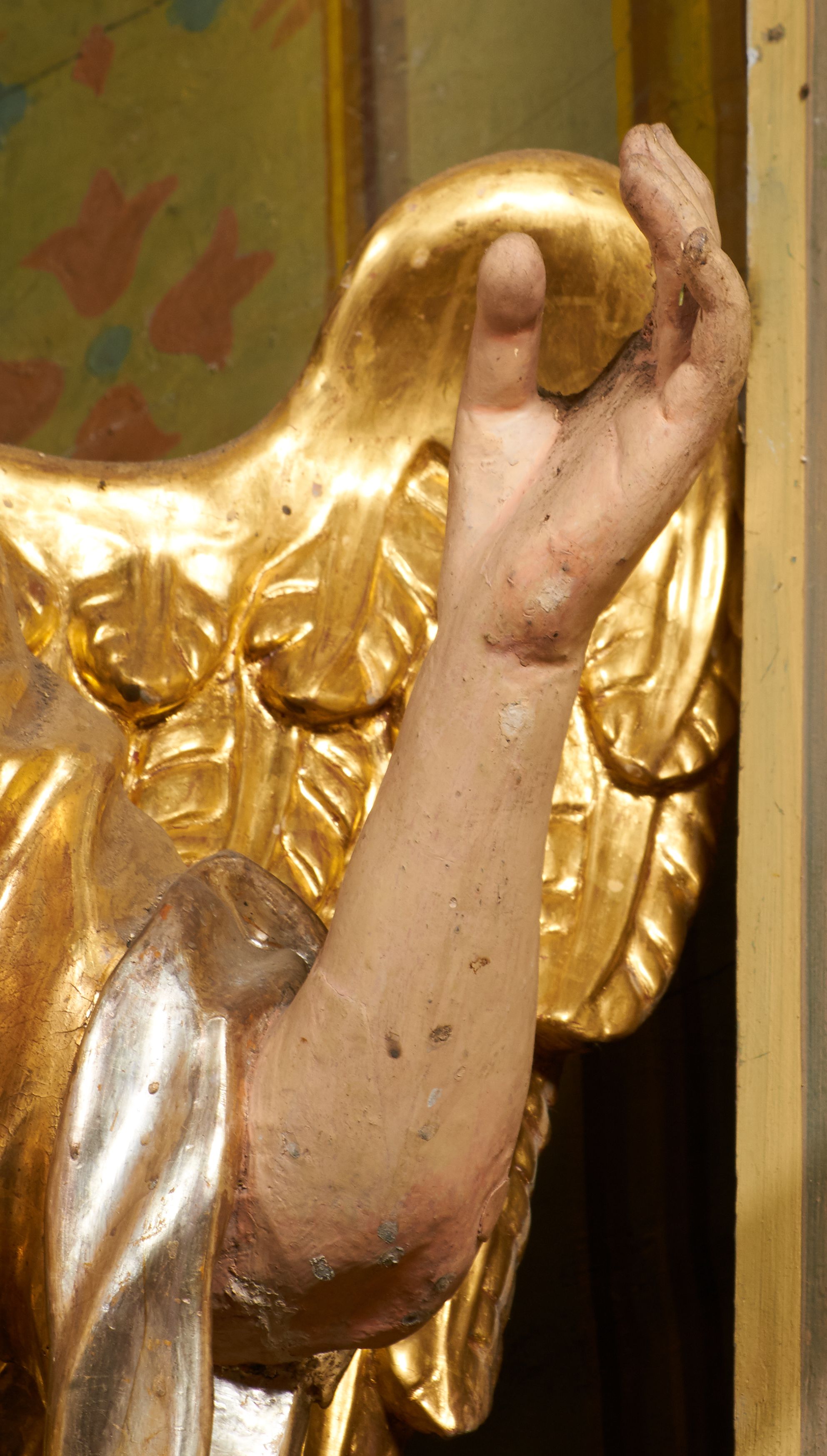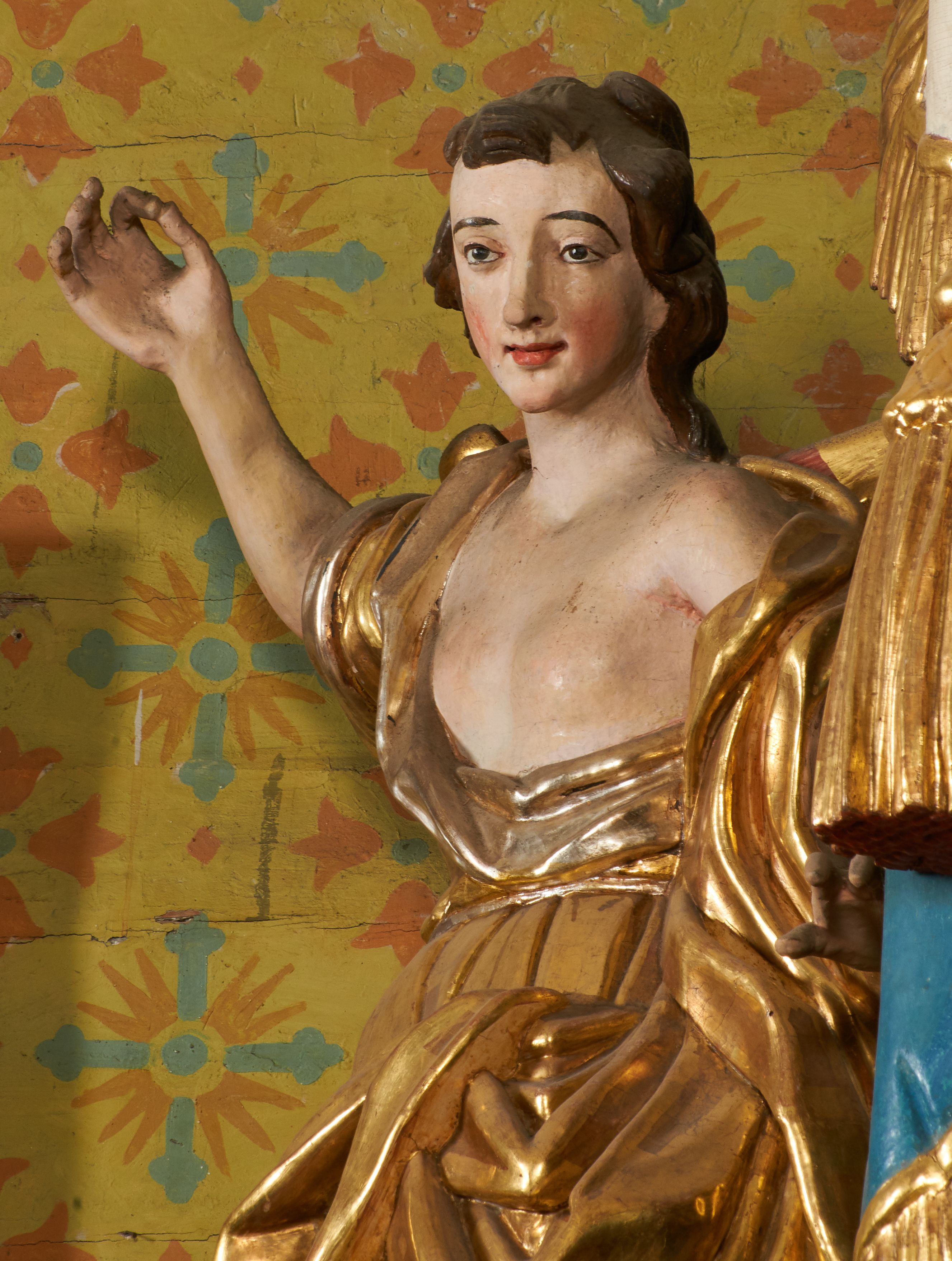 Figury zabrudzone, z lekkimi przetarciami w partii polichromii i złoceń. Odmalowywane i pozłacane w latach 1833, 1844, 1883, 1907, 1957 i 1987.