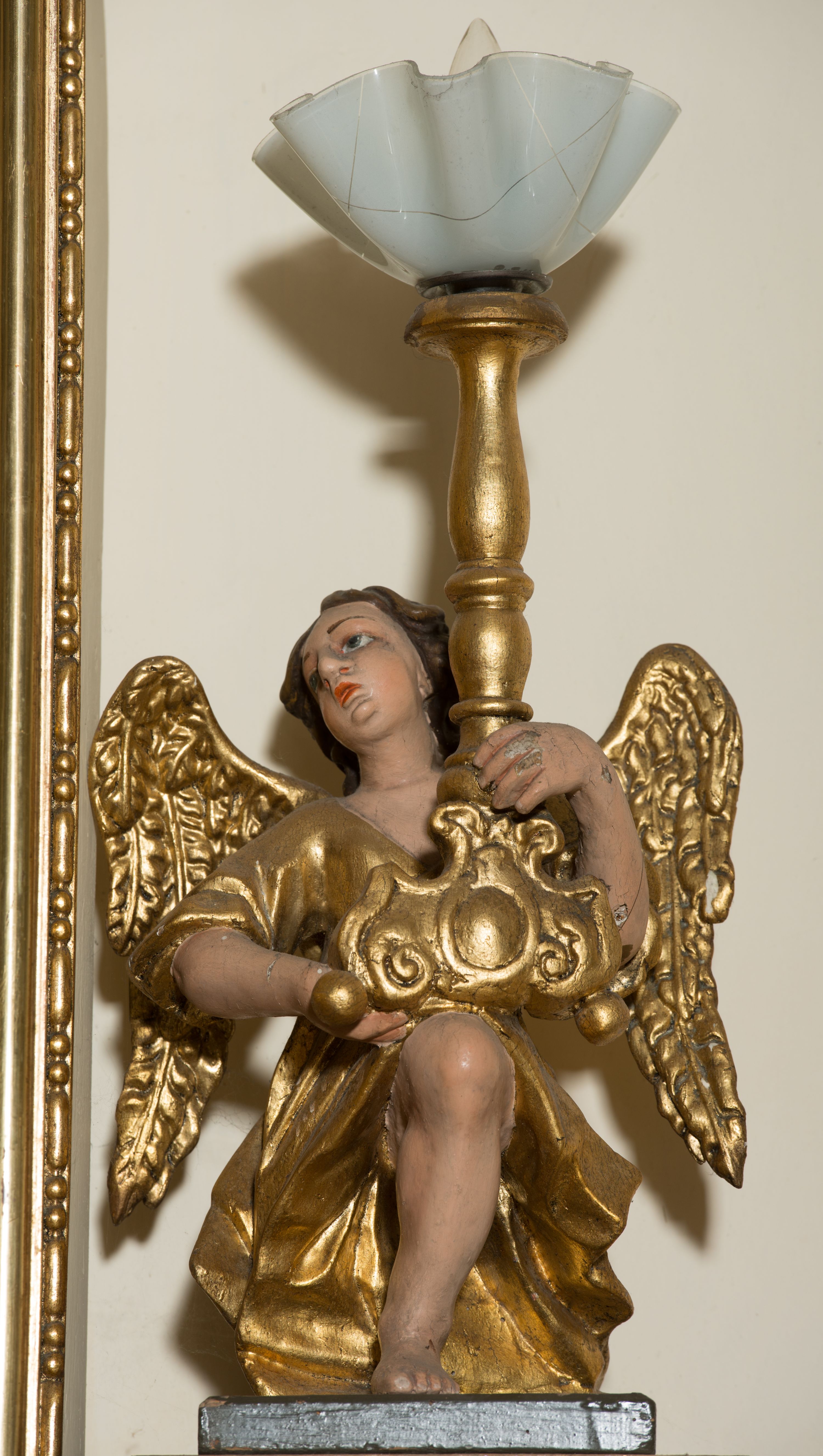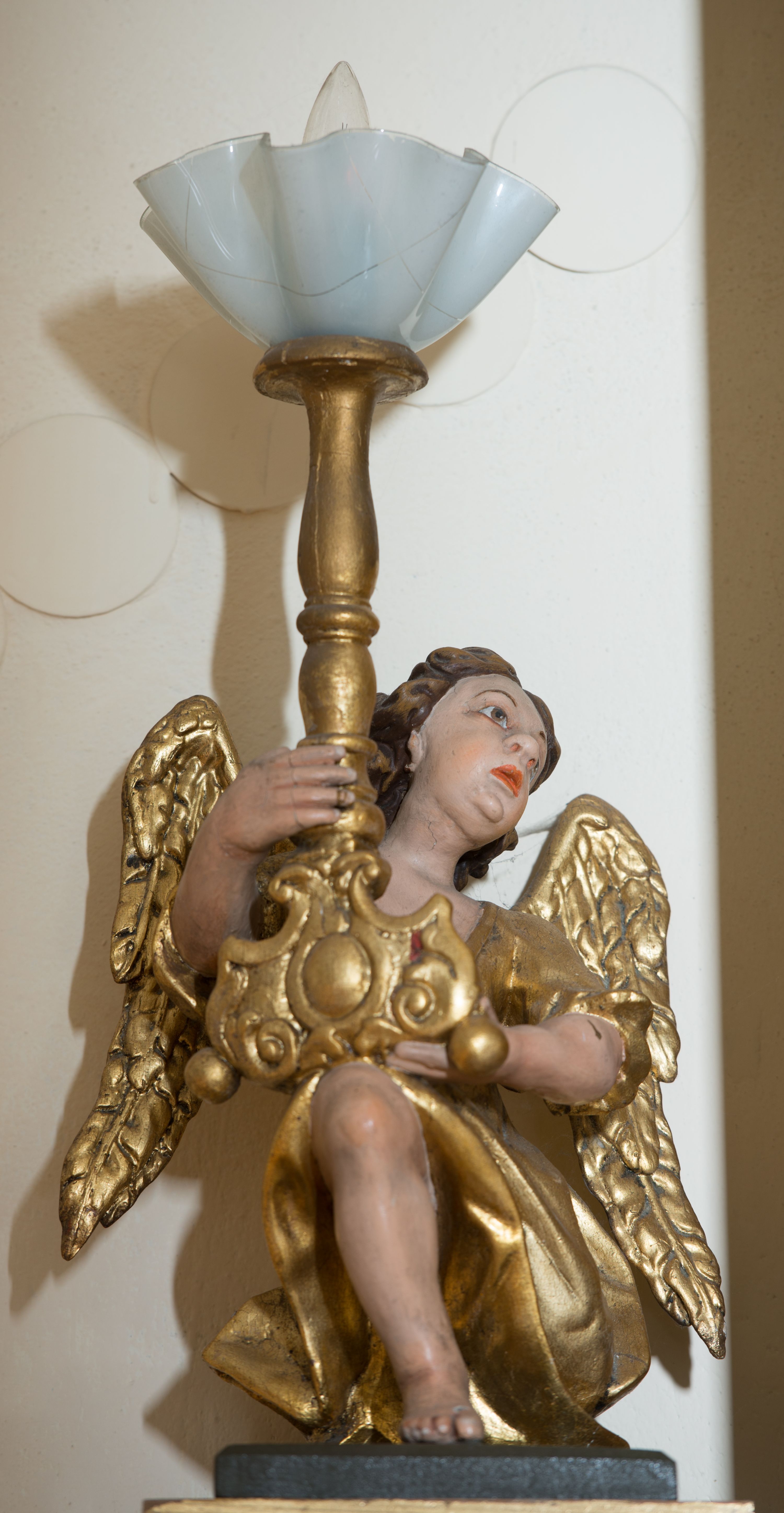 Rzeźby pełnoplastyczne, złocone i polichromowane, przedstawiające figury klęczących aniołów w dynamicznych pozach podtrzymujących świeczniki, ustawione na niskich cokołach. Twarze owalne, pełne o ekspresyjnym wyrazie: uniesiony ku górze wzrok, półotwarte usta. Włosy ciemnobrązowe, półdługie, falowane. Anioły ubrane są w bogato drapowane szaty z długimi rękawami. Partie karnacji polichromowane, szaty, skrzydła oraz trzony świeczników złocone.