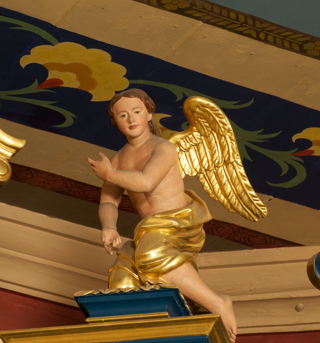 Pełnoplastyczne figury klęczących aniołów usytuowane w zwieńczeniu ołtarza głównego. Postacie są zwrócone w trzech czwartych do wewnątrz, ku ołtarzowi, mają pochylone głowy. Anioł z lewej strony ołtarza składa ręce w geście modlitwy, anioł z prawej prawą rękę ma opuszczoną, a lewą uniesioną przed sobą. Ich twarze są szerokie, oczy małe, nosy i usta niewielkie; okolone brązowymi, falowanymi włosami przylegającymi do głowy i opadającymi im na karki. Mają nagie torsy, a złocone draperie opasują im biodra, uda i kolana. Ich skrzydła są złożone i złocone.