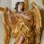 Figura drugiego anioła zwrócona frontalnie, w kontrapoście i wykroku, o esowato wygiętej sylwetce, głowa skierowana w lewo, delikatnie uniesiona. Lewa ręka złożona na piersi, prawa ugięta, wyciągnięta przed siebie w geście. Twarz owalna, młodzieńcza o delikatnych rysach, niewielki, lekko zadarty nos, oczy małe zwrócone ku górze, usta niewielkie o pełnych wargach. Włosy półdługie, głęboko rzeźbione w pojedyncze, wijące się pasma, ekspresyjnie poruszone, opadające na kark. Anioł jest ubrany w marszczoną tunikę, ściśle przylegającą do ciała, odsłaniającą tors i nogi oraz płaszcz przewiązany przez lewe ramię, z fragmentem podtrzymywanym dłonią na piersi, dalej otaczający postać, opadający na tył, z zawiniętą z przodu postaci partią materiału. Tkanina miękko rzeźbiona w grube, ekspresyjnie kształtowane fałdy, płynnie otaczająca postać z wywiniętym fragmentem na prawym boku. Skrzydła duże, złożone. Polichromia naturalistyczna w odsłoniętych partiach ciała, szaty i atrybuty złocone.