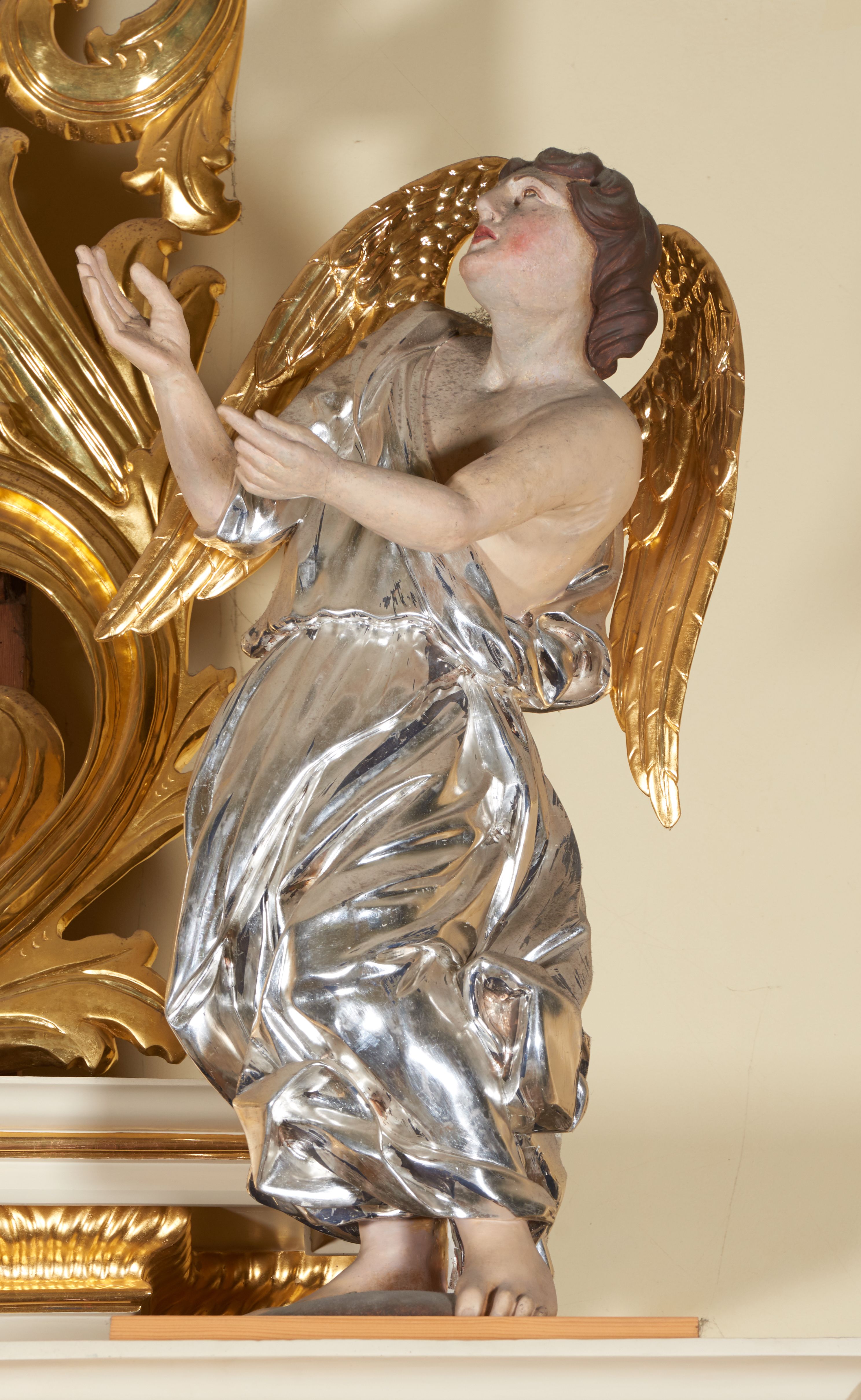 Figury pełnoplastyczne, wydrążone od tyłu, ukazują stojące w zwieńczeniu ołtarza anioły. Figura po lewej stronie jest zwrócona w lewo, o wygiętej łukowo sylwetce, z głową skręconą w prawo. Jej twarz jest owalna, o wyrazistych rysach i mimice oraz jasnej, szarawej karnacji z zaróżowionymi policzkami. Włosy ma krótkie, zaczesane do tyłu, falowane, ciemnobrązowe. Ręce uniesione na wysokości bioder i wysunięte równolegle do przodu. Anioł jest ubrany w długą, podwiązaną w pasie, mocno sfałdowaną, srebrzoną tunikę z rękawami sięgającymi łokci, z podwiniętym dołem. Na plecach smukłe, złocone skrzydła. Figura po prawej stronie jest zwrócona w prawo, ujęta w kontrapoście, o przechylonej do tyłu sylwetce. Jej głowa jest lekko odchylona do tyłu, twarz owalna o wyrazistych rysach, szarawej karnacji z zaróżowionymi policzkami. Włosy krótkie, zaczesane do tyłu, falowane, ciemnobrązowe. Ręce wysunięte przed korpus, lekko uniesione na wysokości klatki piersiowej. Anioł jest ubrany w długą, podwiązaną w pasie, mocno sfałdowaną, srebrzoną tunikę z rękawami sięgającymi łokci, z odsłoniętym lewym ramieniem i ręką. Na plecach smukłe, złocone skrzydła.