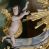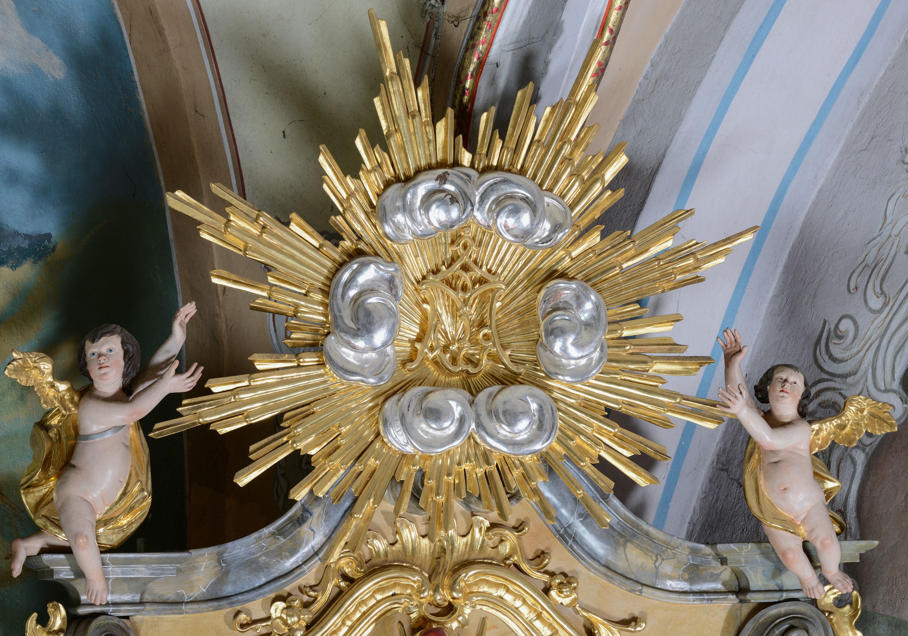 Figury dwóch aniołów adorujące monogram Marii umieszczony na tle promienistej glorii w zwieńczeniu ołtarza. Aniołki o silnie wygiętych sylwetkach z rękami wzniesionymi ku górze w stronę glorii. Sylwetki pulchne z jednym złoconym skrzydłem, umieszczonym od strony zewnętrznej ołtarza. Twarze owalne, z małymi i delikatnie rozchylonymi ustami, krótkimi i szerokimi noskami, oczami skierowanymi na wprost. Włosy ciemnobrązowe, średniej długości, zasłaniające uszy, falowane. Anioły przewiązane wąską tkaniną, odsłaniającą z jednej strony nagie biodro, anioł po lewej z tkaniną przewieszoną na srebrnym pasku. Polichromia w odsłoniętych partiach ciała naturalistyczna, szaty i skrzydła złocone.