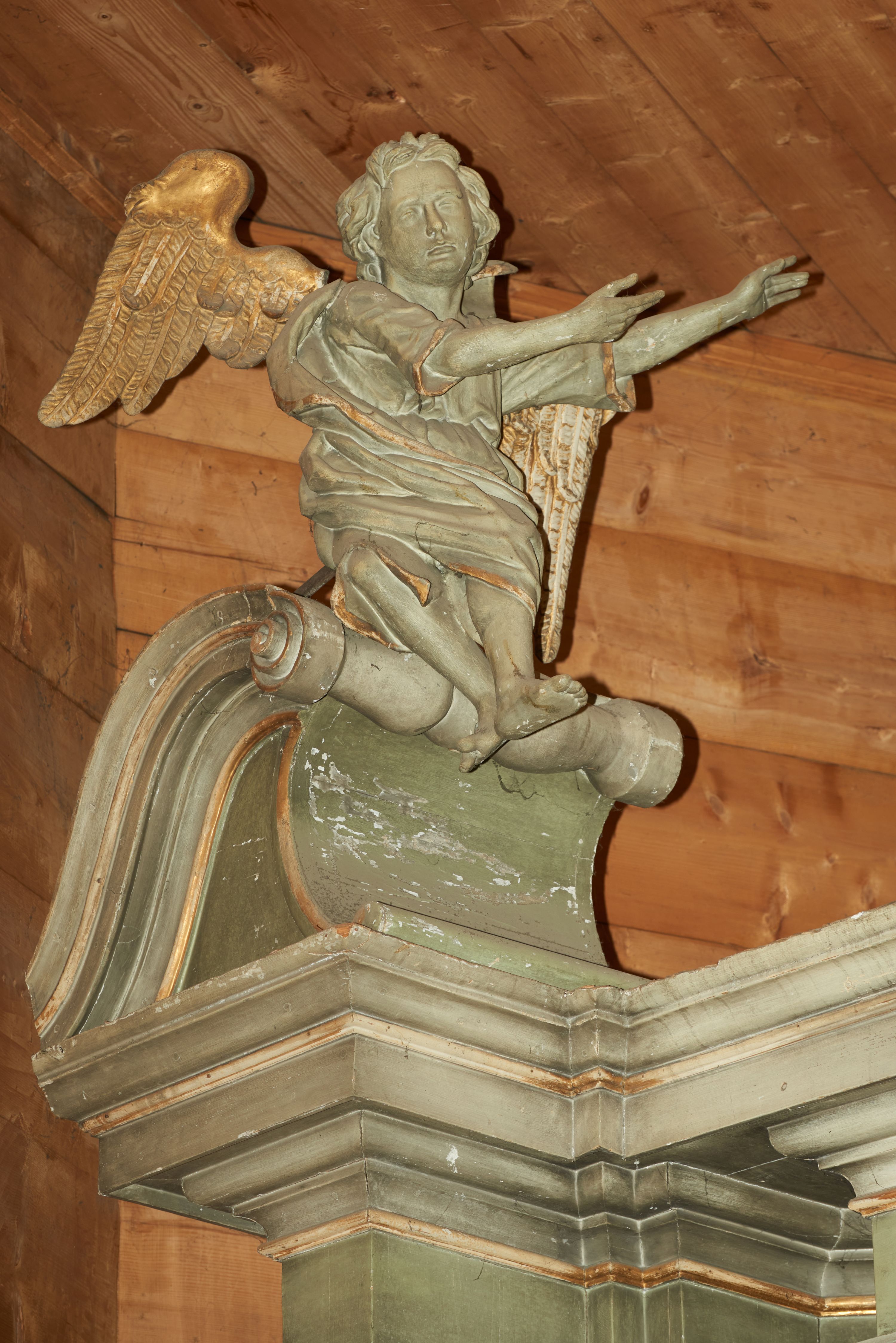Dwie pełnoplastyczne figury siedzących na odcinkach przyczółka aniołów. Aniołek po prawej stronie wznosi prawą rękę ku górze, a lewą trzyma na wysokości piersi, nogi ukazane w ruchu, prawa noga wyciągniętą do przodu. Aniołek po lewej stronie ołtarza obie ręce wyciąga w swoją lewą stronę, a stopy ma skrzyżowane, kolana rozchylone na boki. Twarze pełne z dużymi ustami i krótkimi nosami, delikatnie zaznaczonymi oczami; włosy krótkie, ułożone w grube pukle. Postacie ubrane są w krótkie tuniki oraz zarzucone na plecy płaszcze, szaty obwiedzione są złotą lamówką. Na plecach anioły mają duże, rozłożone skrzydła. Rzeźby w całości polichromowane są na kolor biały, skrzydła złocone.