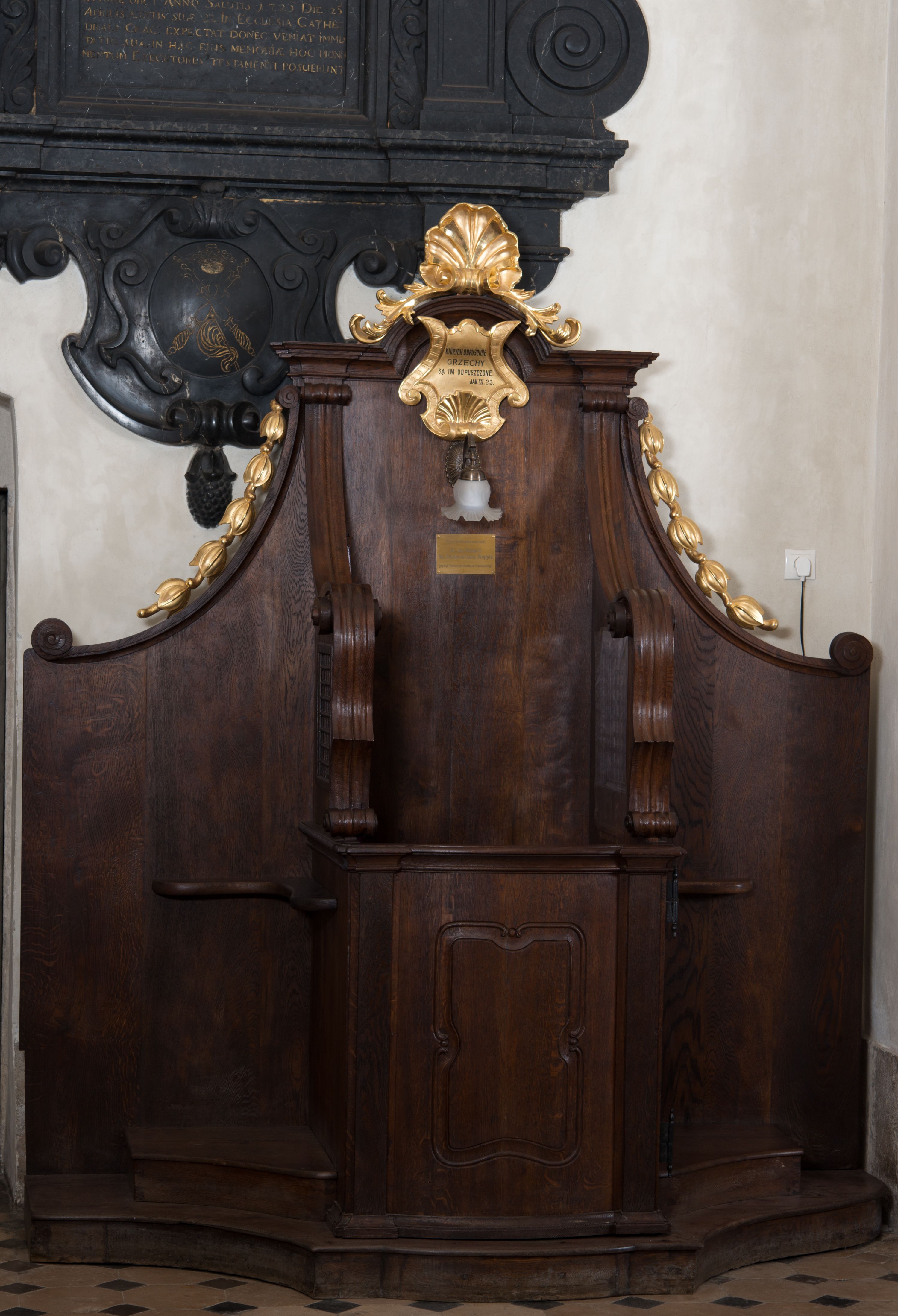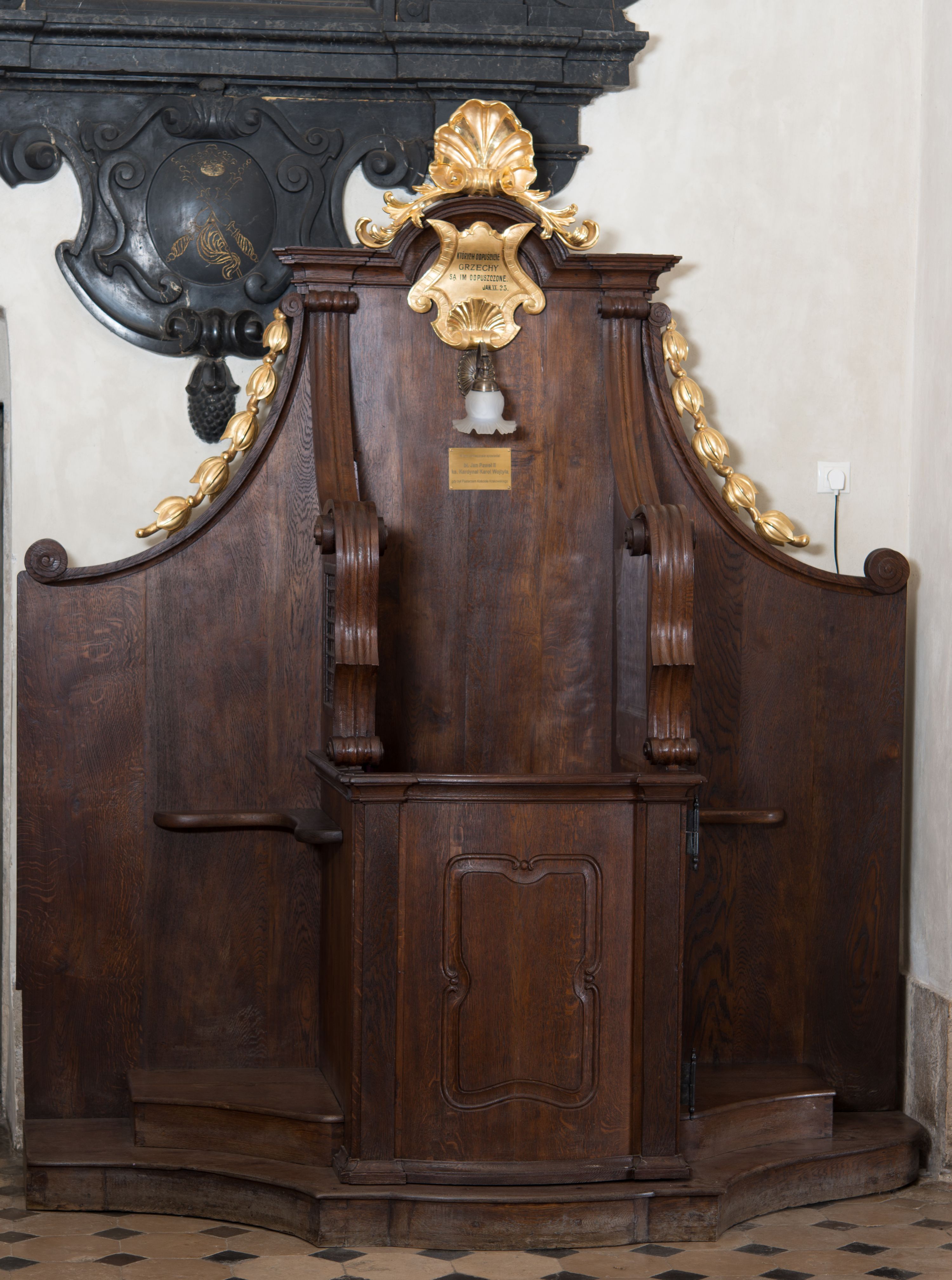 Konfesjonał o typowych dla późnego baroku formach z wklęsło wykrojonym zapleckiem i faliście wyciętymi bokami.