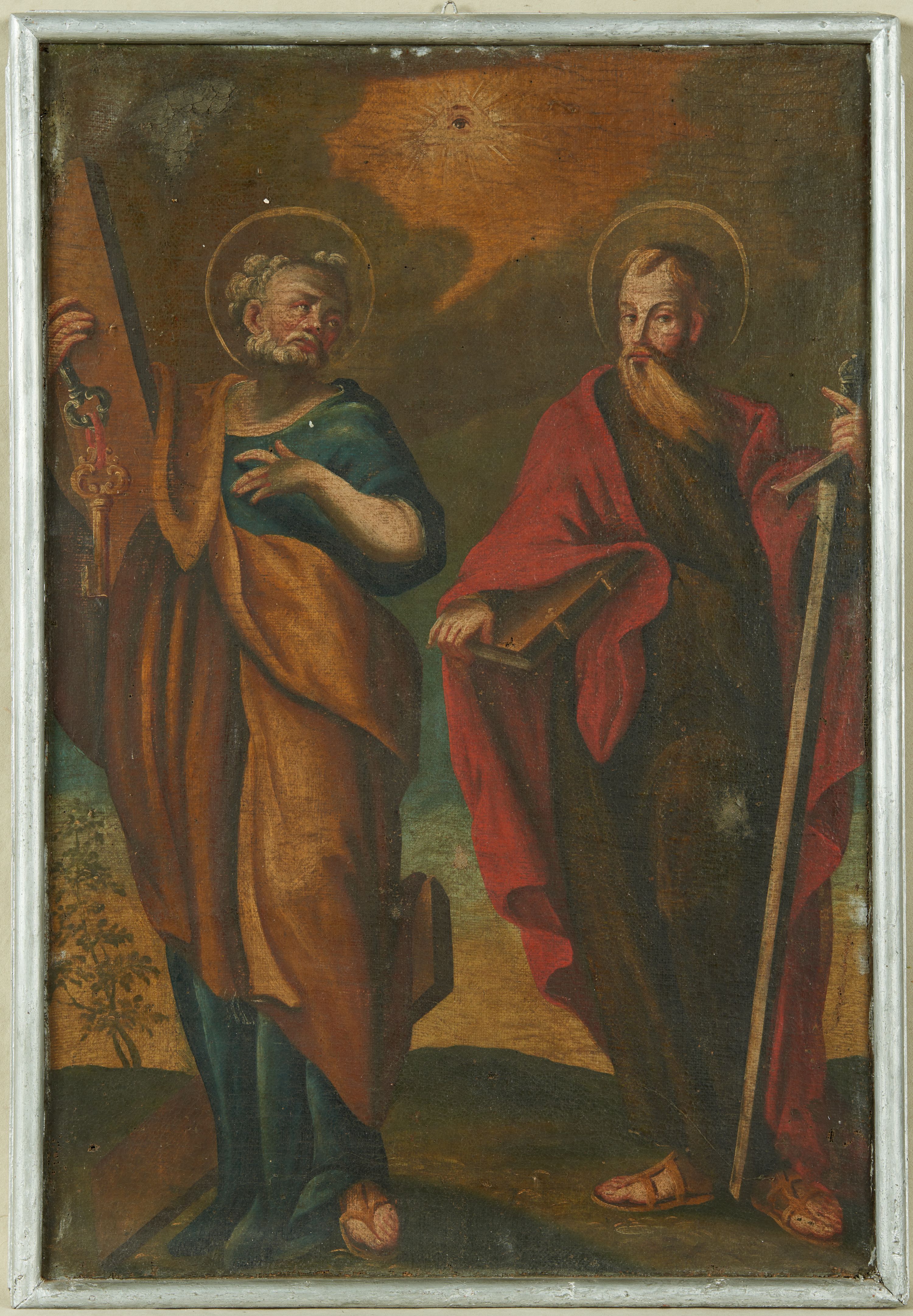 Na rewersie obrazu przedstawienie św. Piotra i św. Pawła w całej postaci. W lewej części obrazu Piotr zwrócony w trzech czwartych w prawo, w kontrapoście, z głową skierowaną w lewo. Prawą ręką przytrzymuje pionową belkę odwróconego krzyża, w dłoni trzyma dwa klucze, lewą rękę kładzie na piersi. Twarz ma szczupłą, o małych oczach, zadartym nosie i pełnych ustach, okoloną siwymi, kręconymi włosami i brodą. Ubrany jest w niebieską tunikę oraz jasnobrązowy płaszcz przewiązany diagonalnie przez prawe ramię. Na stopach ma sandały. W prawej części obrazu św. Paweł, ukazany frontalnie, w kontrapoście, z głową skierowana wprawo. W lewej ręce trzyma miecz skierowany ostrzem w dół, prawą przytrzymuje na boku księgę. Twarz ma pociągłą, o migdałowatych oczach, prostym nosie i pełnych ustach, okoloną długą brodą i jasnobrązowymi, krótkimi włosami. Ubrany jest w ciemnobrązową tunikę oraz czerwony płaszcz zarzucony na ramiona. Na stopach ma sandały. Wokół głów obu świętych nimby. Postacie ukazane na tle pejzażu. W górnej partii obrazu pośród obłoków, na tle rozświetlonego nieba Oko Opatrzności.