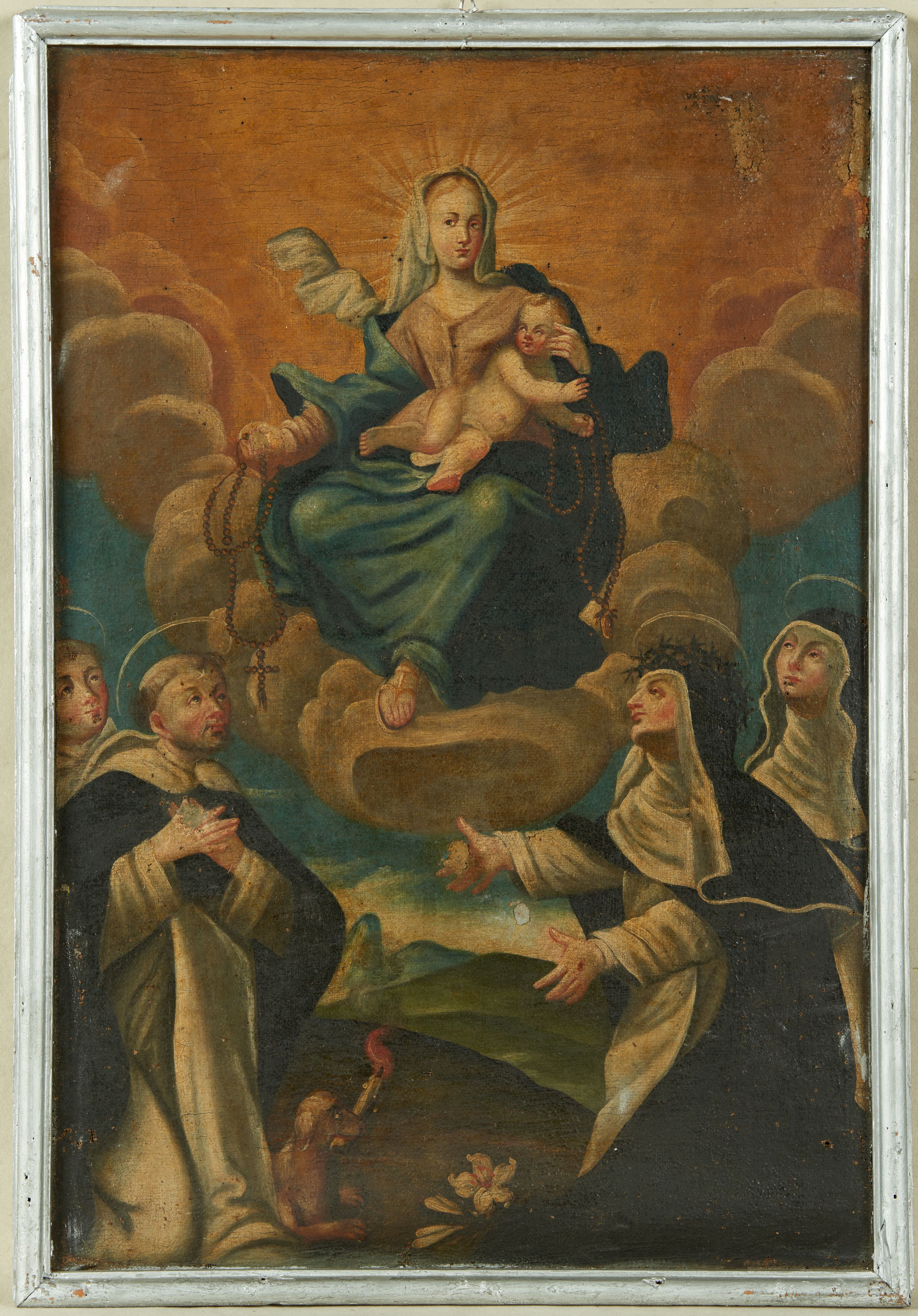 W górnej połowie obrazu ukazana Matka Boża z Dzieciątkiem na kolanach, siedząca frontalnie na obłokach, ze skrzyżowanymi nogami. Lewą ręką przytrzymuje Dzieciątko, prawą wyciąga w bok, w dłoni trzymając różaniec. Twarz ma owalną, o małych oczach, krótkim nosie i drobnych ustach, okoloną jasnymi włosami, ukrytymi pod welonem. Ubrana jest w jasnoróżową suknię, niebieski płaszcz zarzucony na ramiona i nogi, na głowie ma biały, rozwiany welon, a na stopach sandały. Dzieciątko ukazane w pozycji półleżącej na kolanach Matki, zwrócone w trzech czwartych w lewo, z głową skierowaną w przeciwną stronę, w obu rękach wyciągniętych w lewo trzyma różaniec. Dzieciątko ukazane jako niemal nagie, w partii podbrzusza przesłonięte białą tkaniną. Postacie w górnej strefie ukazane są pośród obłoków, na tle rozjaśnionego brązowo-żółtego nieba. W dolnej strefie dwie pary klęczących świętych zakonników i zakonnic. Po lewej św. Dominik, a za nim niezidentyfikowany dominikanin. Obaj zwróceni w trzech czwartych w lewo, z głowami uniesionymi w górę. Dominik ma dłonie skrzyżowane na piersi. Obaj mają szczupłe twarze, o małych okrągłych oczach, krótkich nosach i pełnych ustach, okolone krótkimi włosami, z tonsurami na głowie. Obaj ubrani są w białe habity z kapturami i szkaplerzami, Dominik ma na ramiona narzucony czarny płaszcz. Na czole ma gwiazdę. Przed nim leży pies trzymający pochodnię w pysku. Po prawej stronie św. Katarzyna Sieneńska, za nią niezidentyfikowana święta. Obie zakonnice zwrócone w trzech czwartych w prawo, z uniesionymi głowami. Święta Katarzyna z wyciągniętymi przed siebie rękami. Zakonnice o szczupłych twarzach, z niewielkimi oczami skierowanymi w górę, prostymi nosami i pełnymi ustami. Ubrane są w białe habity ze szkaplerzami, czarne płaszcz i welony. Święta Katarzyna ma na głowie koronę cierniową, na dłoniach stygmaty. Przed nią, na ziemi leży lilia. Nad głowami świętych aureole. Postacie w dolnej strefie ukazane na tle pejzażu z pagórkami w oddali.