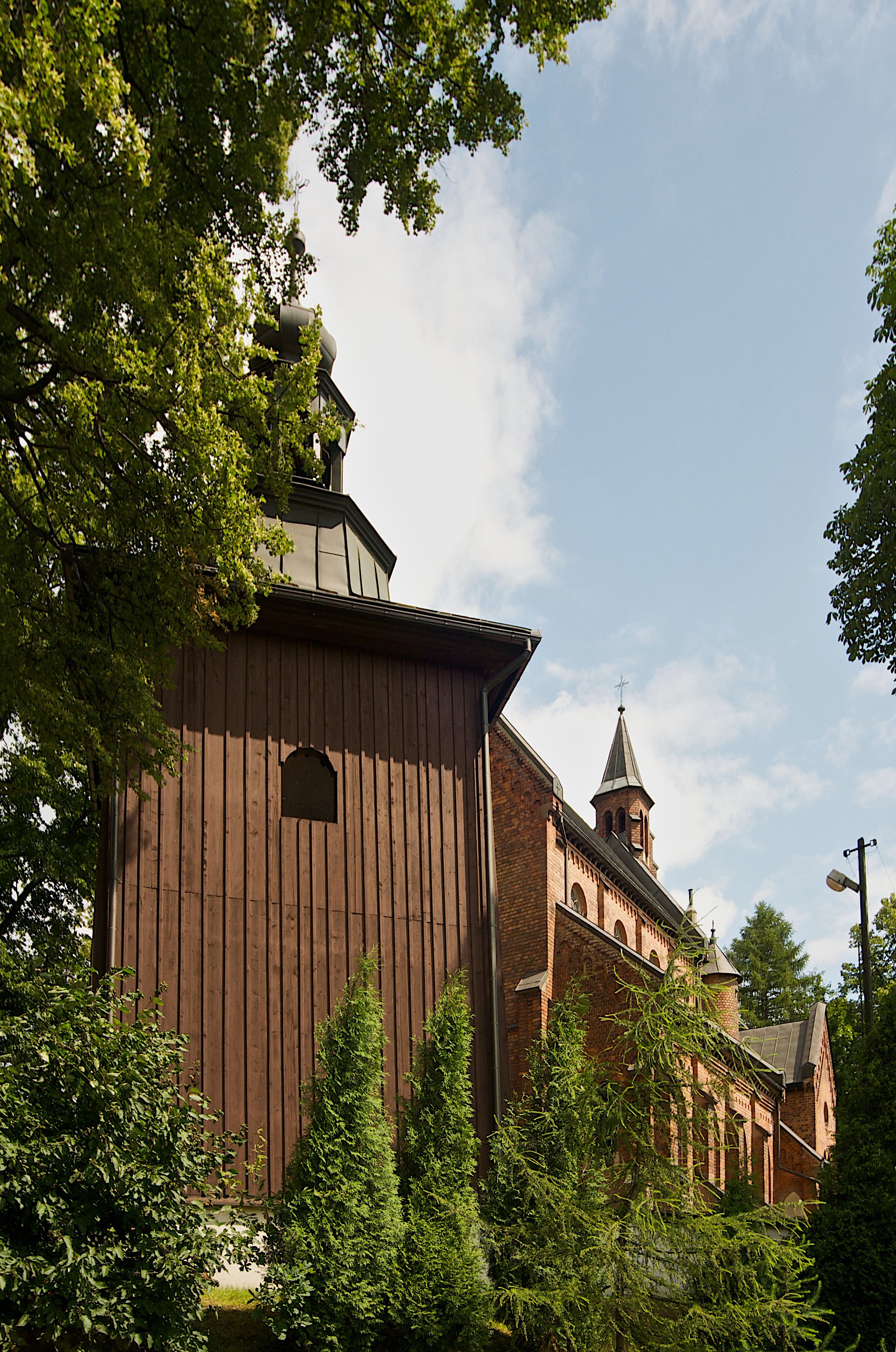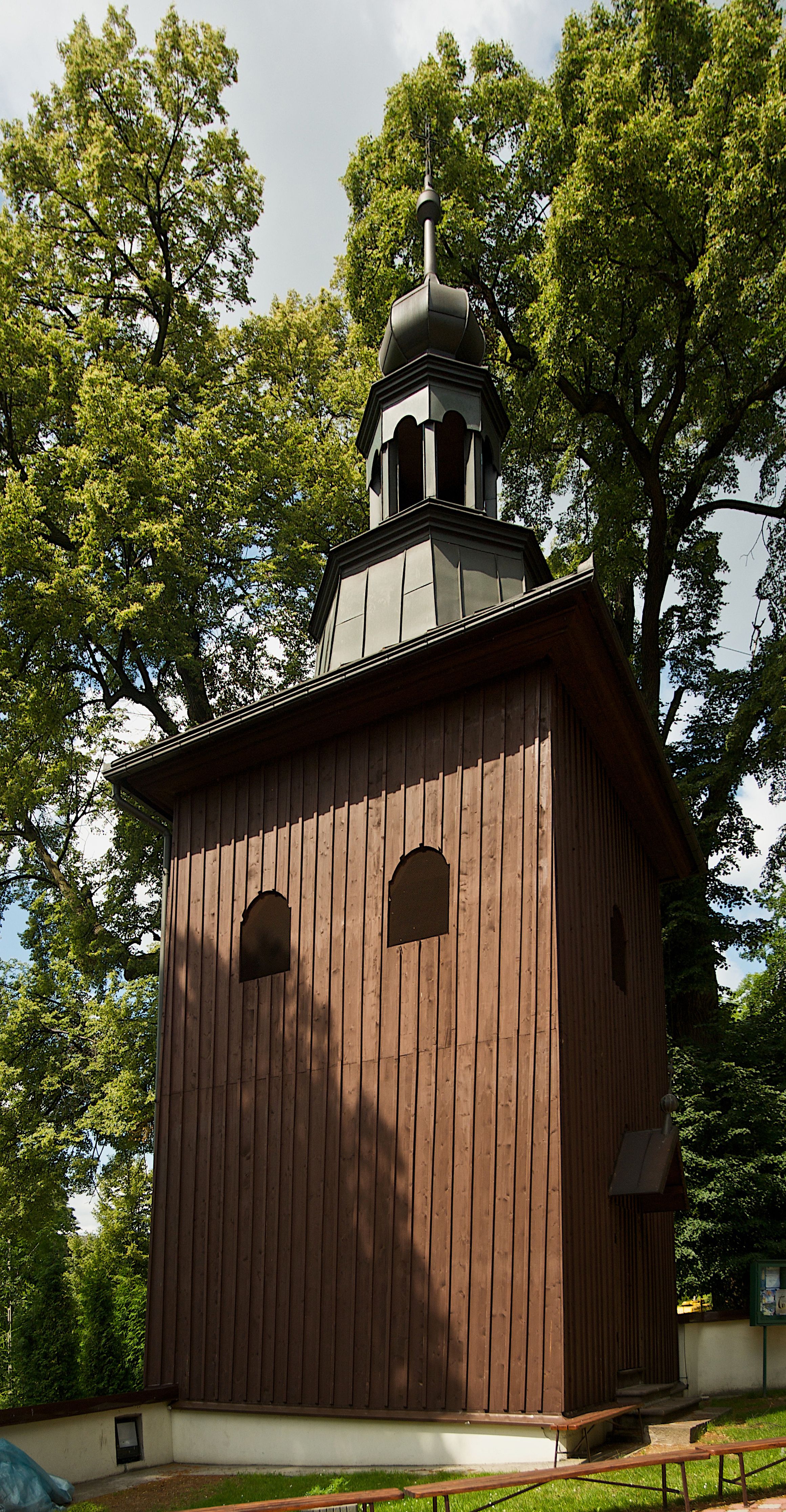W południowo-wschodniej części placu przy kościele stoi drewniana dzwonnica o konstrukcji słupowej, na kamiennym cokole na planie kwadratu, zwężająca się ku górze. W ścianach wschodniej i zachodniej po dwa, w południowej i północnej po jednym oknie zamkniętym łukiem odcinkowym nadwieszonym. Wejście w ścianie wschodniej, ponad nim daszek dwuspadowy zwieńczony kulą z krzyżem. Dach czterospadowy z ośmiobocznym tamburem z latarnią i hełmem baniastym, zakończony krzyżem. Dach kryty blachą.