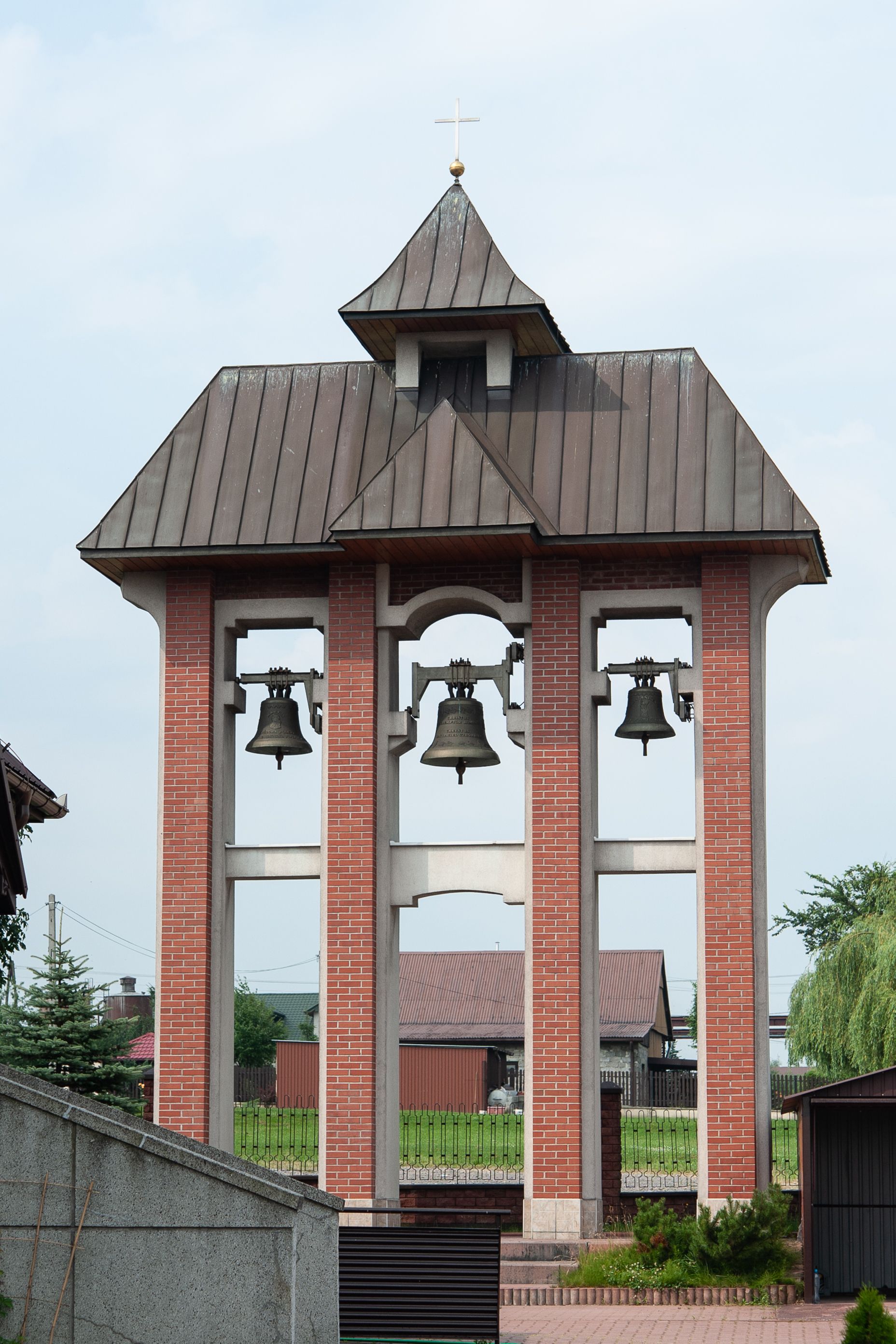 Omawiany obiekt reprezentuje typ wolnostojącej dzwonnicy parawanowej o trzech osiach. Wzniesiono ją w 1999 roku – została uroczyście poświęcona przez biskupa Kazimierza Nycza w trakcie odpustu parafialnego 19 września tego roku. Wcześniej parafia dysponowała tymczasową dzwonnicą, w której zawieszone były trzy dzwony odlane w przedsiębiorstwie Wacława Felczyńskiego z Gliwic. Po wzniesieniu obecnie istniejącego obiektu, dzwony zostały do niego przeniesione. W listopadzie 2011 roku podczas prac tynkarskich nowej dzwonnicy okazało się, że dzwony są uszkodzone, wobec czego wymieniono je na nowe instrumenty zamówione w przemyskim przedsiębiorstwie KAWMET. Zostały one zawieszone w czerwcu 2012 roku i obecnie znajdują się na wyposażeniu dzwonnicy.