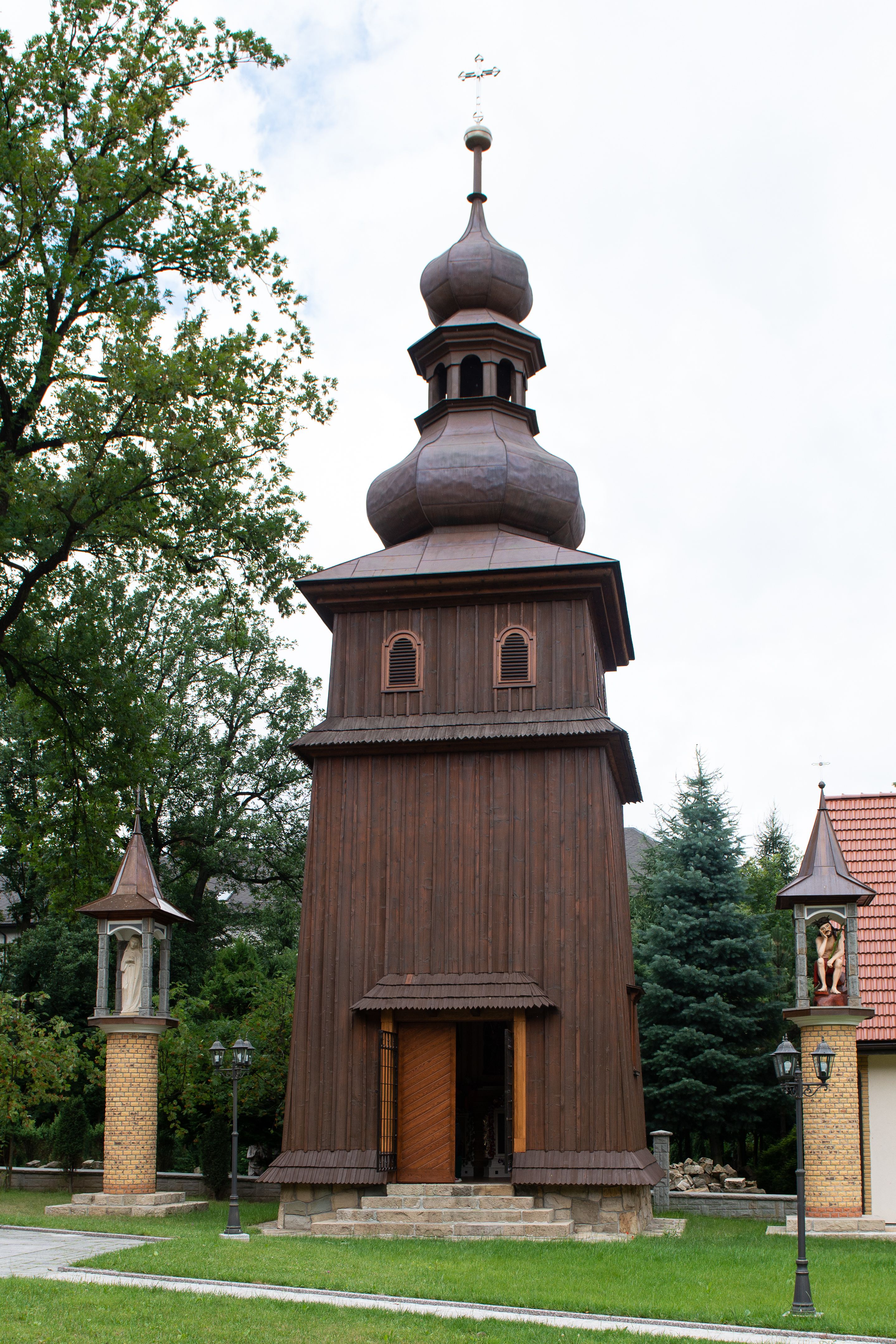 Dzwonnica drewniana, konstrukcji słupowo-ramowej, ściany szalowane z listwowaniem, więźba dachowa drewniana. Założona na planie kwadratu, na kamiennym podmurowaniu, przesłoniętym okapowym daszkiem gontowym. Ściany zwężające się ku górze, przepasane okapowym daszkiem gontowym w trzech czwartych wysokości. Zwieńczona blaszanym hełmem baniastym zakończonym szpikulcem z kulą i krzyżem. Otwór drzwiowy w ścianie południowej o wykroju stojącego prostokąta zamknięty drzwiami dwuskrzydłowymi, nakryty okapowym daszkiem gontowym. Do drzwi prowadzą czterostopniowe, kamienne schody. Otwory głosowe w formie stojącego prostokąta zamkniętego łukiem półkolistym nadwieszonym, po dwa na każdej ścianie w najwyższej partii dzwonnicy.