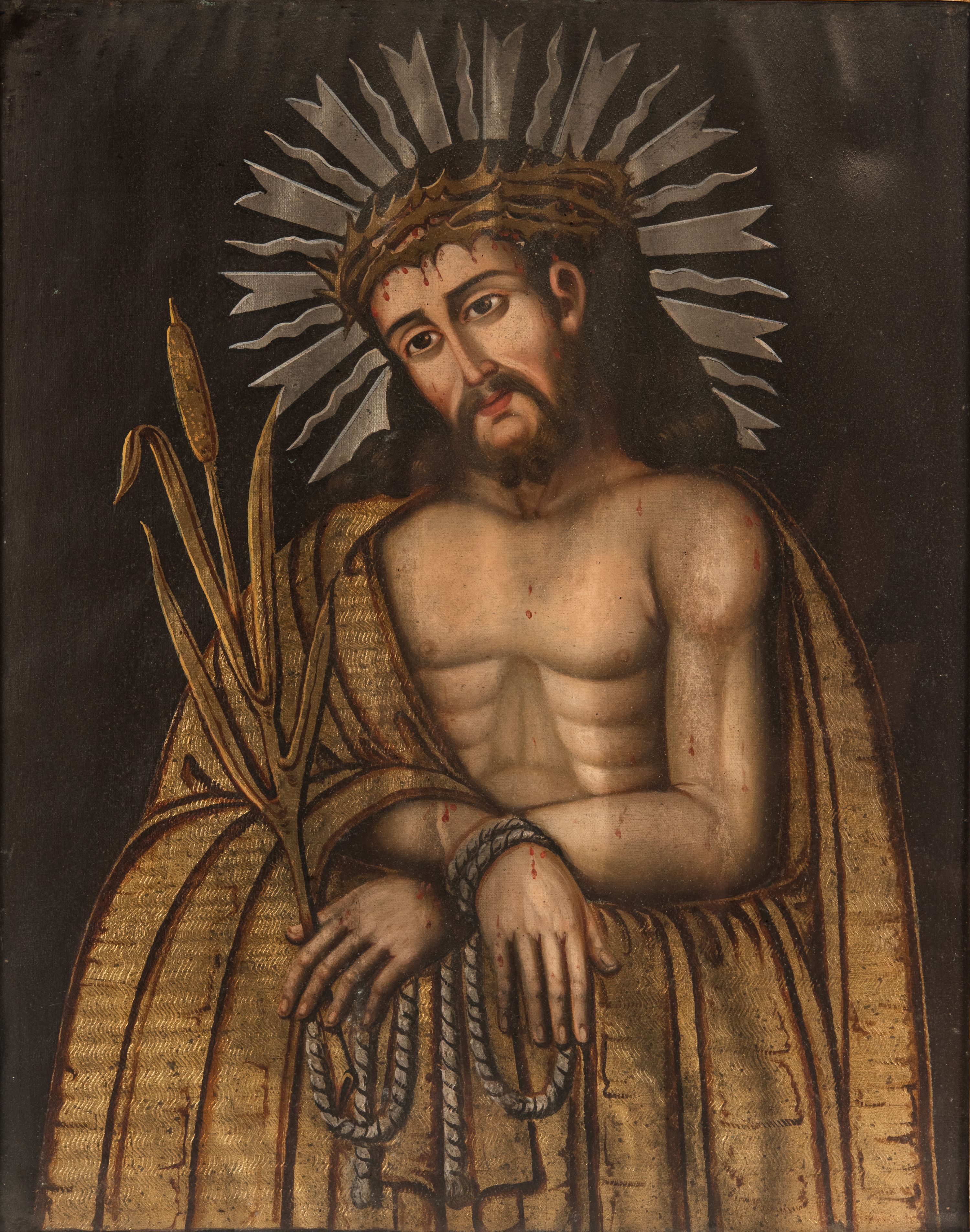 Obraz ma kształt stojącego prostokąta. Na czarnym tle ukazana została stojąca postać ubiczowanego Jezusa w ujęciu do pasa. Chrystus ma długie, czarne, falowane, opadające na plecy włosy oraz krótki zarost. Głowę ze złotą koroną cierniową nieznacznie przechyla w lewo. Wokół niej znajduje się srebrzysta gloria promienista, składająca się z namalowanych naprzemiennie cienkich oraz grubszych srebrnych promieni, zakończonych w jaskółczy ogon. Zbawiciel ubrany jest w luźno spływający po ramionach złoty płaszcz przewieszony przez lewę ramię, odsłaniający umięśnioną klatkę piersiową. Jego wyciągnięte do przodu związane złotym sznurem ręce są skrzyżowane na wysokości pasa. W lewej ręce trzyma czterolistną trzcinę zakończoną pałką.