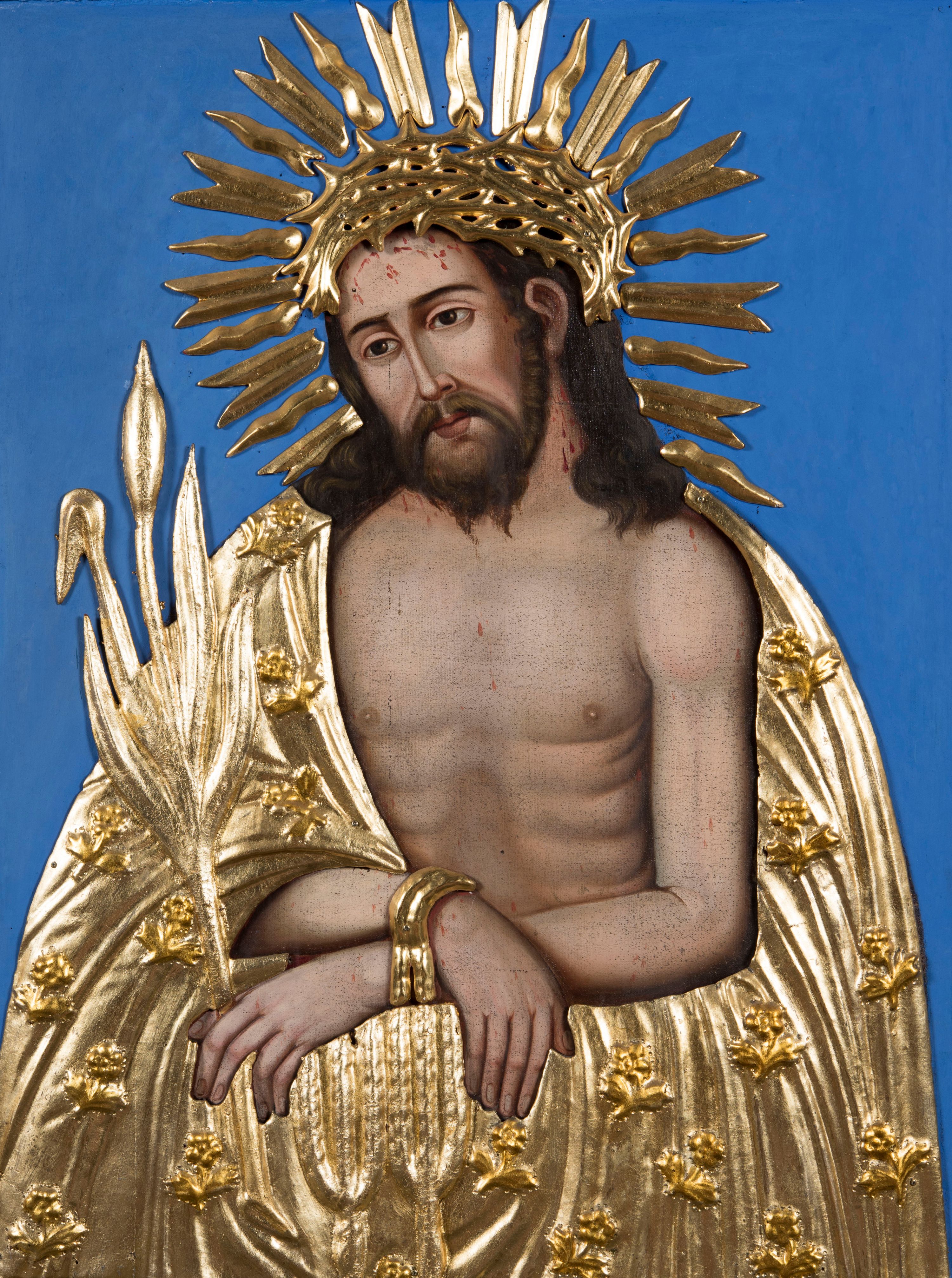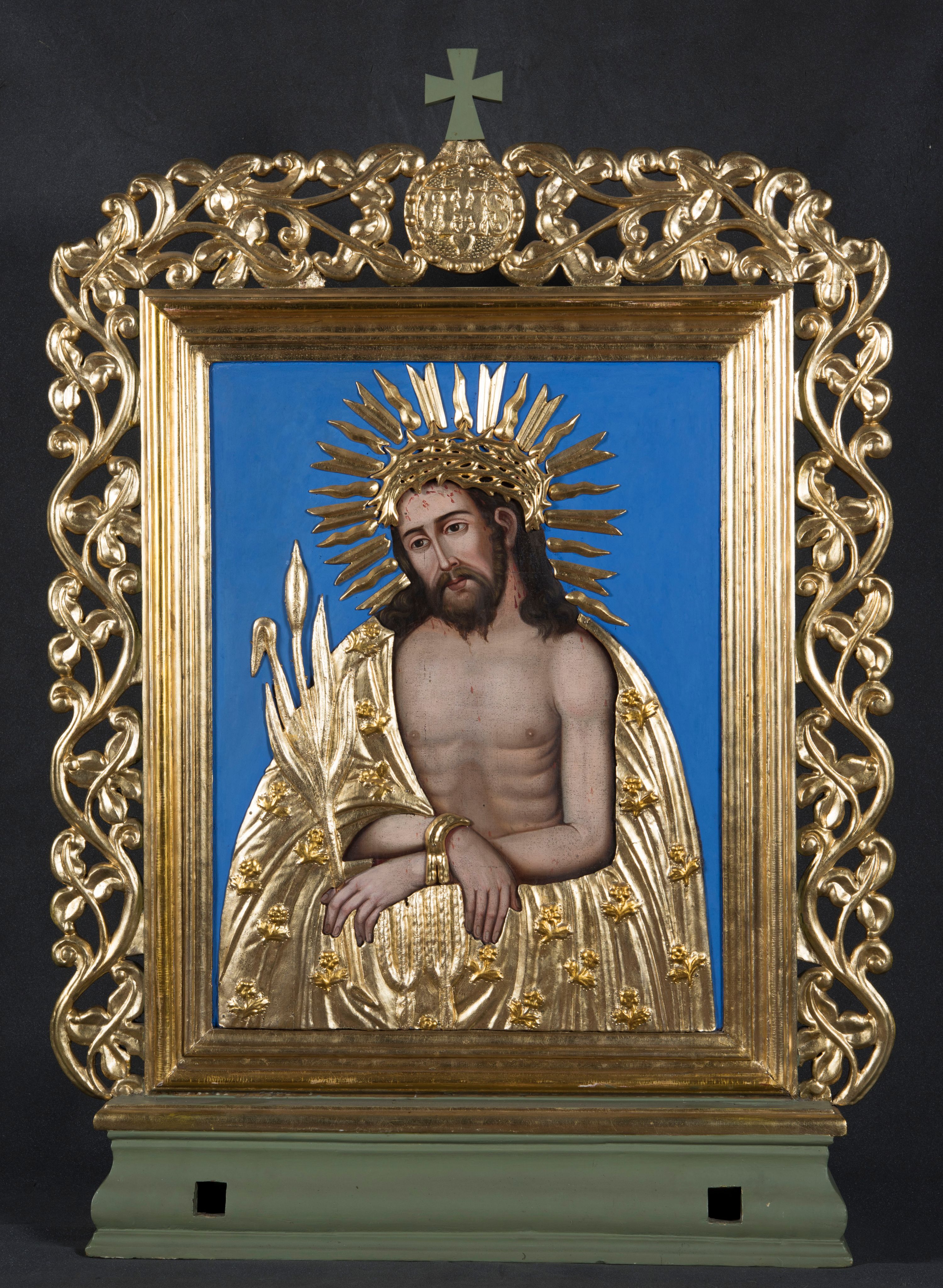 Ikonograficzny motyw „Ecce Homo” nawiązuje do biblijnych słów Piłata, wypowiedzianych o Jezusie tuż po ubiczowaniu. Umęczony, ubrany w purpurowy płaszcz, z cierniową koroną na głowie oraz trzciną w dłoni Jezus, szyderczo nazwany królem, został ukazany na pośmiewisko ludowi domagającemu się jego śmierci. Motyw Ecce Homo pojawiał się już we wczesnym średniowieczu. Ówczesne przedstawienia Jezusa, zarówno w malarstwie książkowym, jak i na włoskich mozaikach, ukazywały go w boskim majestacie oraz królewskiej godności. Dopiero u schyłku średniowiecza, od połowy XV wieku w pełni ukształtowała się wersja o charakterze dolorystycznym, według której Ecce Homo traktowano jako przedstawienia Jezusa w najbardziej upokarzającej chwili podczas męki.