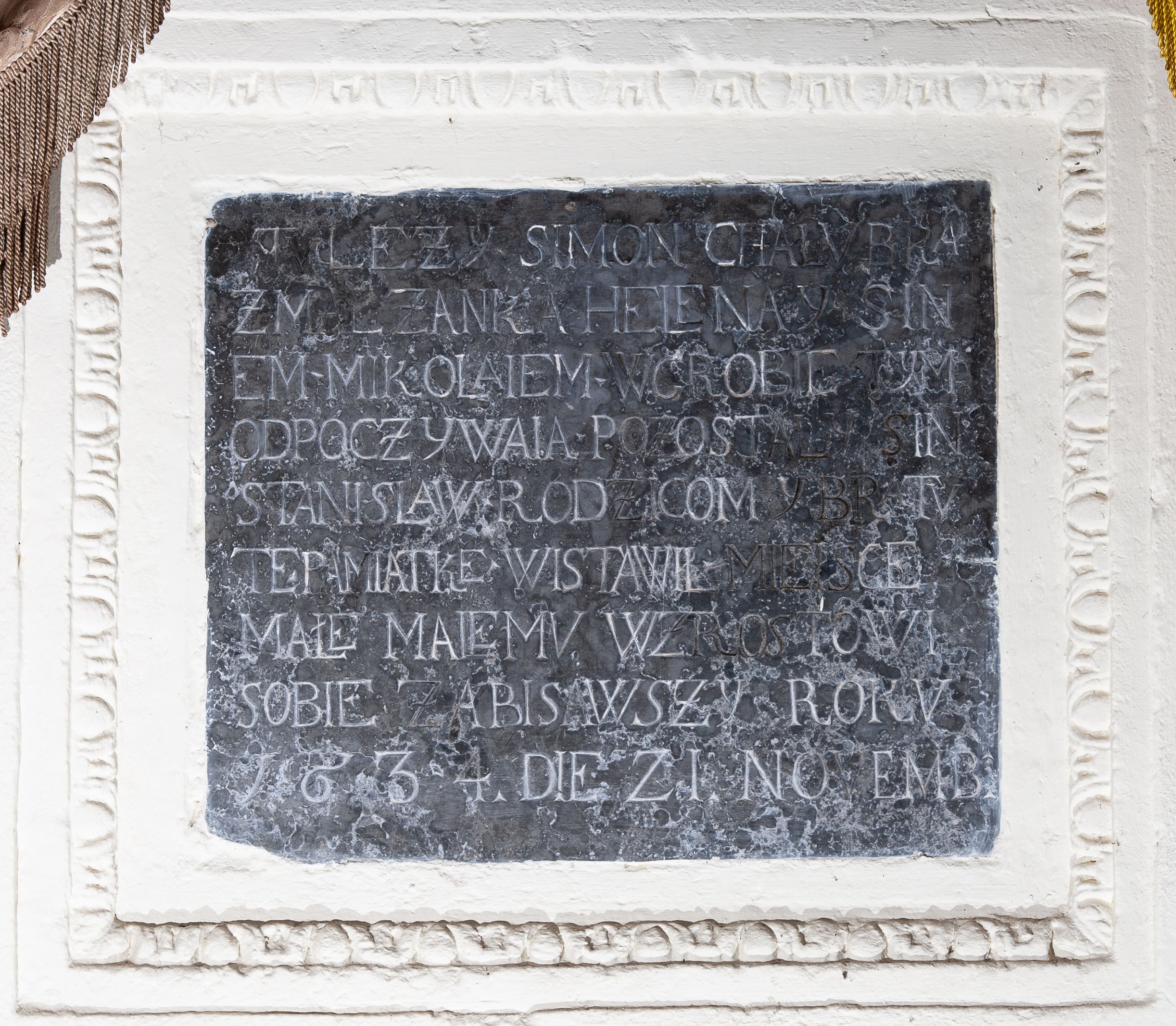 Płyta w kształcie leżącego prostokąta, w profilowanej opasce tynkowej dekorowanej kimationem. Inskrypcja majuskułowa w języku polskim i zapisem daty po łacinie: TU LEŻY SIMON CHALUBKA / Z MAŁŻANKA HELENA Y SIN/EM MIKOLAIEM W GROBIE TYM / ODPOCZYWAIA POZOSTALY SIN / STANISLAW RODZICOM Y BRATV / TE PAMIATKE WISTAWIŁ MIEISCE / MAŁE MALEMU WZROSTOWI / SOBIE ZABISAWSZY ROKV / 1634. DIE 2I. NOVEMB(RIS).