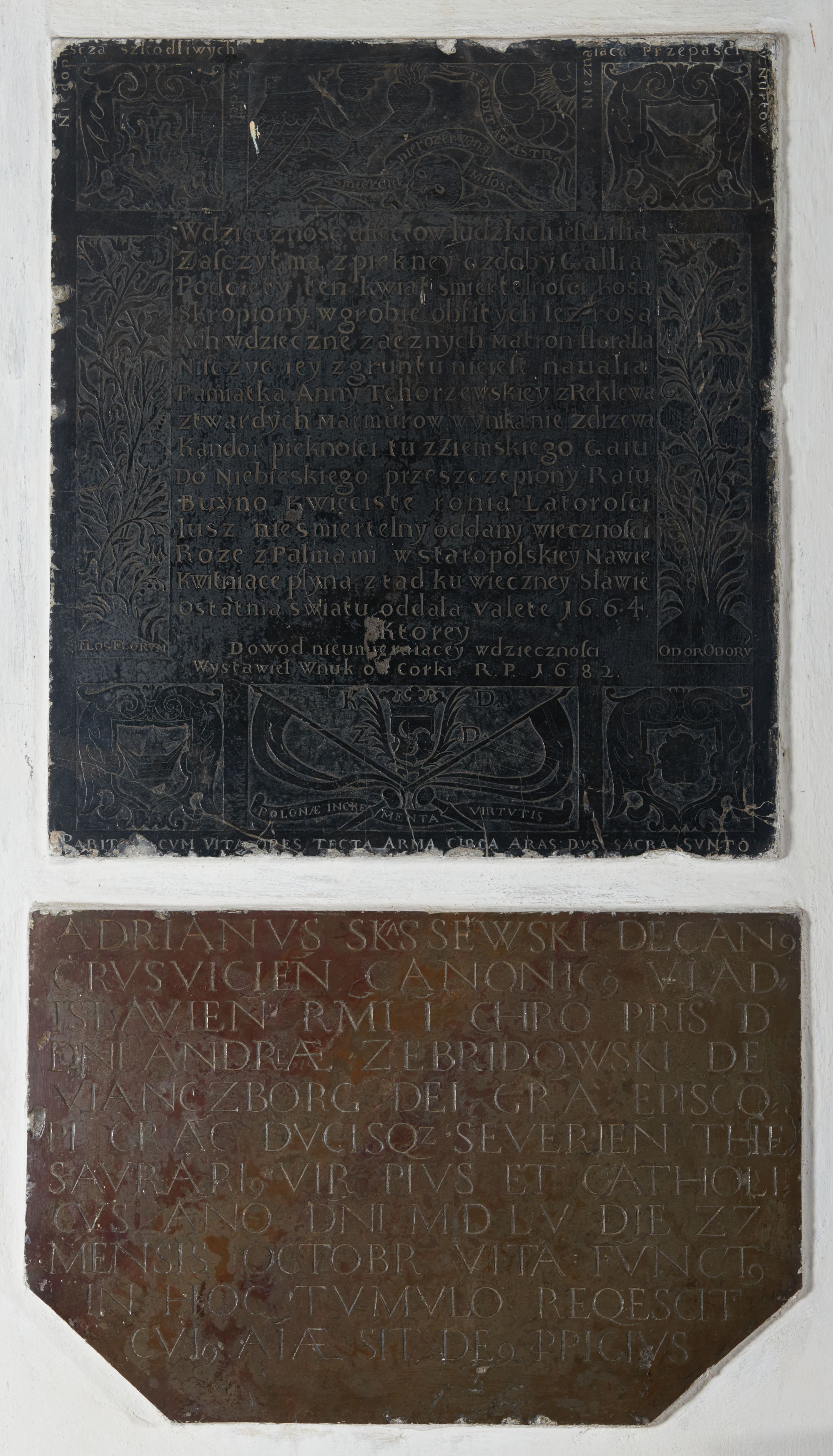 Tablica epitafijna kamienna w kształcie prostokąta o ściętych dolnych narożach. Na niej wykuta inskrypcja „ADRIANVS SKASSEWSKI DECAN(US) / CRVSVICIEN(SIS) CANONIC(US) VLAD/ISLAVIEN(SIS) R(EVERENDISSI)MI I(N) CHR(IST)O P(AT)RIS D[OMINI] / D(OMI)NI ANDREAE ZEBRIDOWSKI DE / VIANCZBORG DEI GRA(TIA) EPISCO/PI CRAC(OVIENSIS) DVCISQ(UE) SEVERIEN(SIS) THE/SAVRARI(US) VIR PIVS ET CATHOLI/CVS AN(N)O D(OMI)NI MDLV DIE 27 / MENSIS OCTOBR(IS) VITA FVNCT(US) / IN HOC TVMVLO REQESCIT / CVI(US) A(N)I(M)AE SIT DE(US) P(PRO)PICIVS”