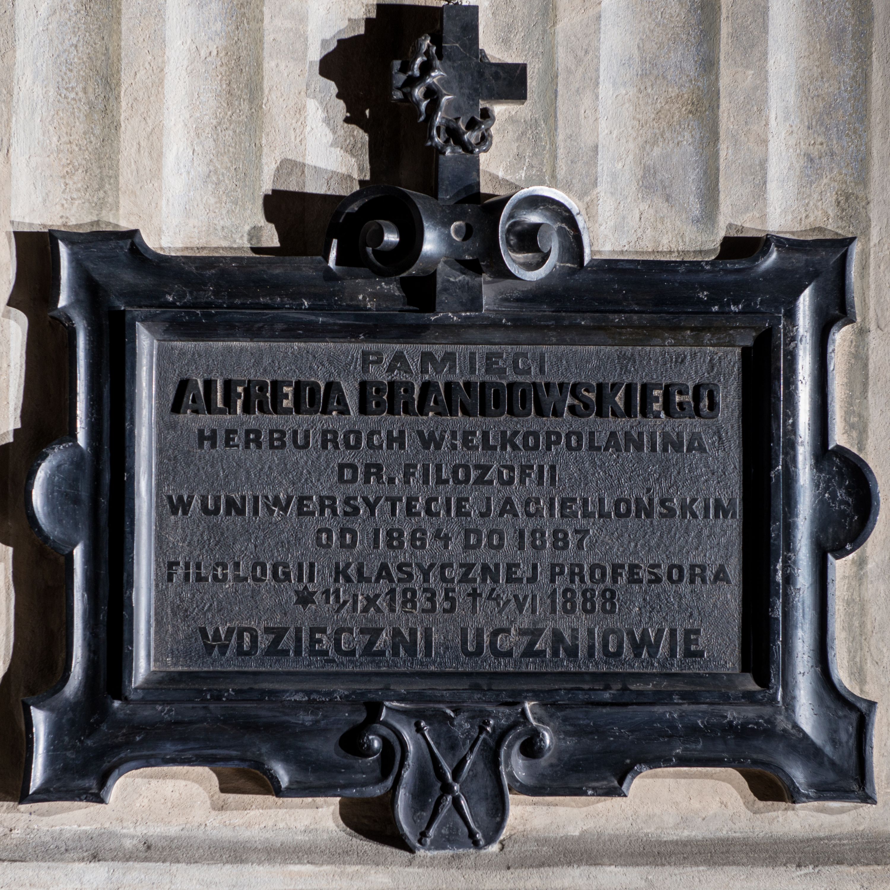 Epitafium Alfreda Brandowskiego (1835-188), filologa klasycznego, profesora latynistyki w Uniwersytecie Jagiellońskim, ufundowane przez uczniów, nawiązuje do epitafiów z pierwszej połowy XVII wieku.