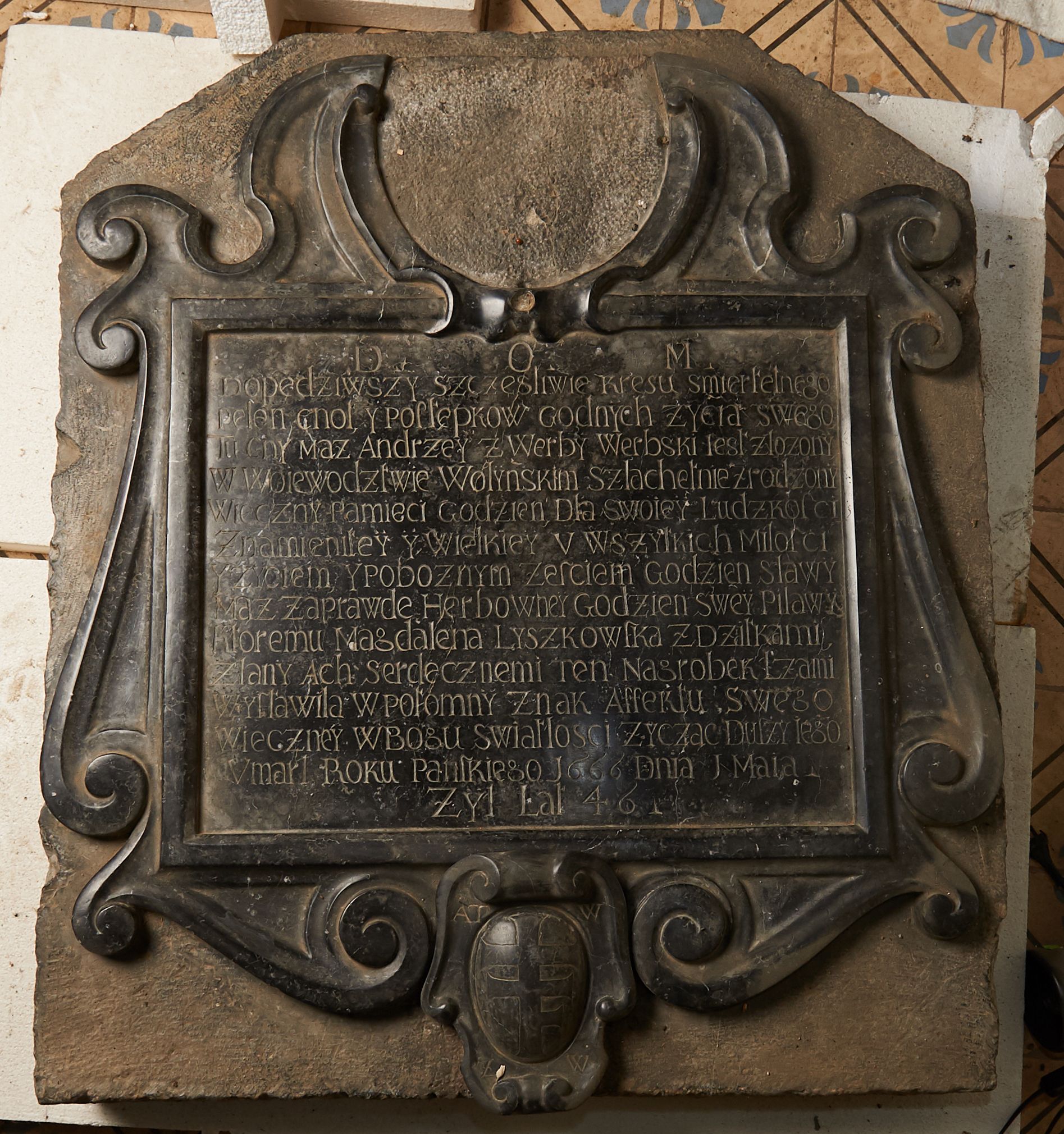 Tablica epitafijna w kształcie leżącego prostokąta, ujęta ramą, flankowana wolutowymi uszakami przechodzącymi w spływy wolutowe. U góry pozostałości po owalnym medalionie w kartuszu; u dołu kartusz z herbem Pilawa, z inicjałami „AT / W” i „Z / W”, ujęty antytetycznie zwróconymi wolutami. W polu tablicy inskrypcja: „D[EO] O[PTIMO] M[AXIMO] / Dopędziwszy szczęśliwie kresu smiertelnego / pełen cnot, y postępków godnych życia swego / Tu cny mąż Andrzey z Werby Werbski iest złożony / W Woiewodztwie Wołynskim szlachetnie zrodzony / Wieczny pamieci godzien dla swoiey ludzkosci / znamienitey y wielkiey v wszystkich milości / y zyciem, y poboznym zerciem godzien sławy / maż zaprawde herbowney godzien swey Pilay / któremu Magdalena Lyszkowska z dziatkami / zlany ach serdecznemi ten nagrobek łzami / wystawiła w potomny znak affektu swego / wieczney w Bogu swiatłosci / życząc duszy iego / Vmarł roku panskiego 1666 dnia 1 maia / żył lat 46”.