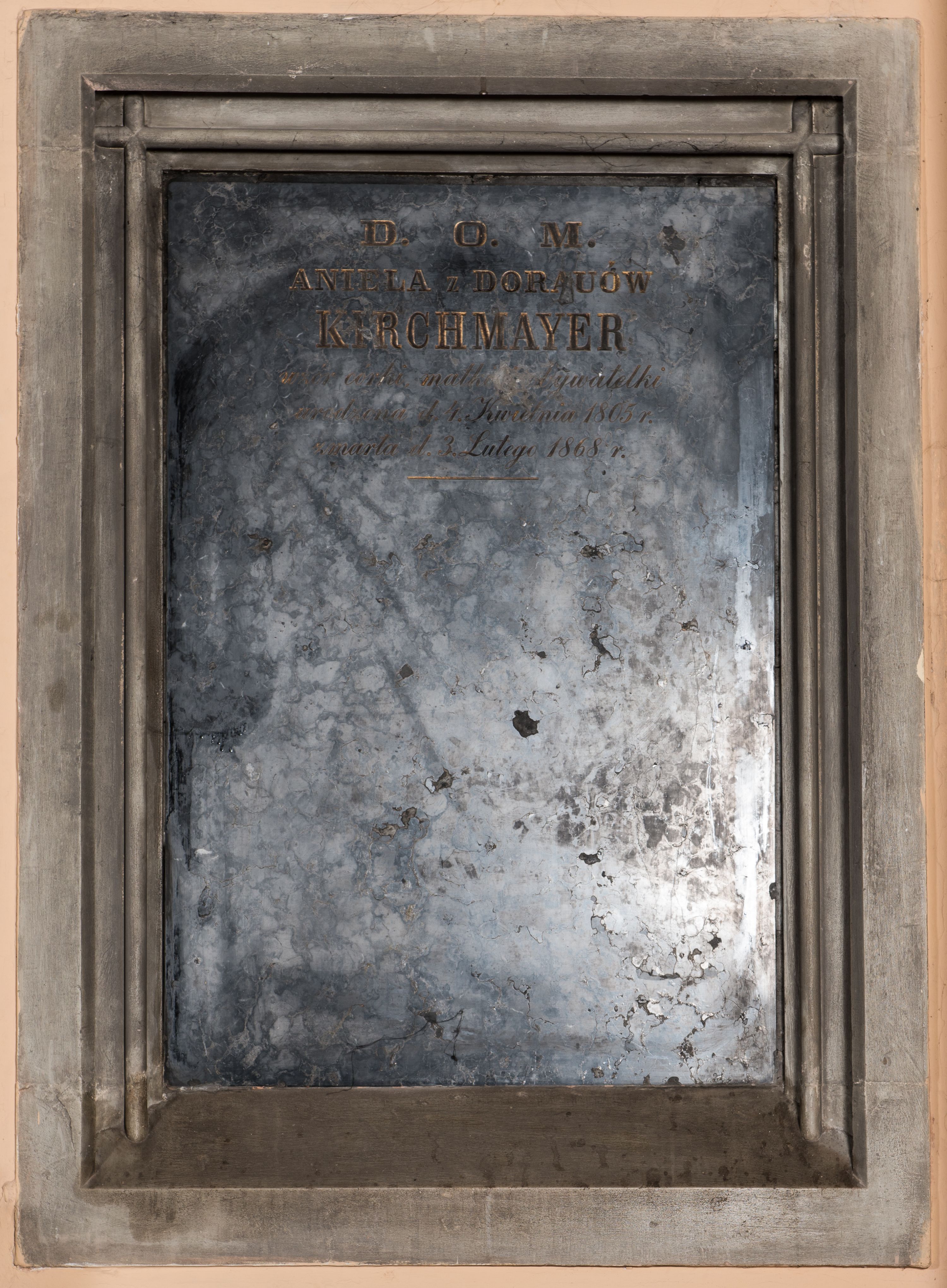 Tablica w kształcie stojącego prostokąta w kamiennej, profilowanej ramie z inskrypcją: "D(EO) O(PTIMO) M(AXIMO) / ANIELA Z DORAUÓW / KIRCHMAYER / wzór córki, matki, obywatelki / urodzona d(nia) 4. Kwietnia 1805 r(oku) / zmarła d(nia) 3.Lutego 1868 r(oku)"