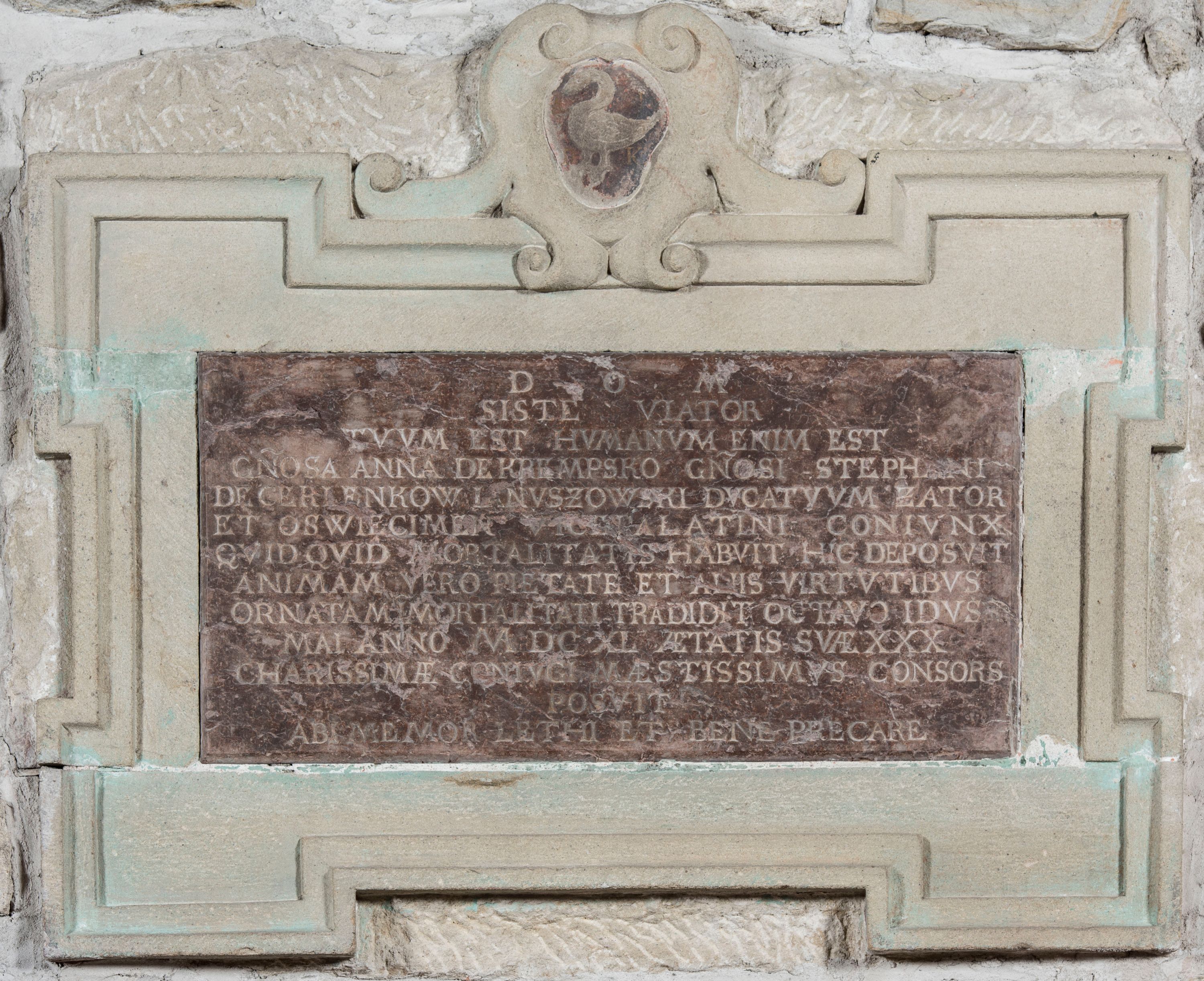 Epitafium w kształcie leżącego prostokąta z profilowanym obramieniem z uszakami w narożach. Górna krawędź obramienia zwieńczona na osi kartuszem ujętym dwiema wolutami, wypełniony wypukłą tarczą herbem Łabędź. W polu symetryczna inskrypcja: D.O.M. / SISTE VIATOR / TVVUM EST HVMANVM ENIM EST / GENEROSA ANNA DE KREMPSKO GENEROSI STEPHANI DE CERIENKOW IANUSZOWSKI DVCATVVM ZATOR / ET OSWIECIMEN VICEPALATINI CONIVNX / QVIDQVID MARTALITATIS HABVIT HIC DEPOSVIT / ANIMAM VERO PIETATE ET ALIIS VIRTVTIBVS / ORNATAM IMORTALITATI TRADIDIT OCTAVO IDVS / MAL ANNO MDCXL AETATIS SVAE XXX / CHARISSIMAE CONIVGI MAESTISSIMUS CONSORS / POSVIT / ABI MEMOR LETHI ET BENE PRECARE. Tablica epitafijna, herb wykonana w marmurze kieleckim, obramowanie z piaskowca.