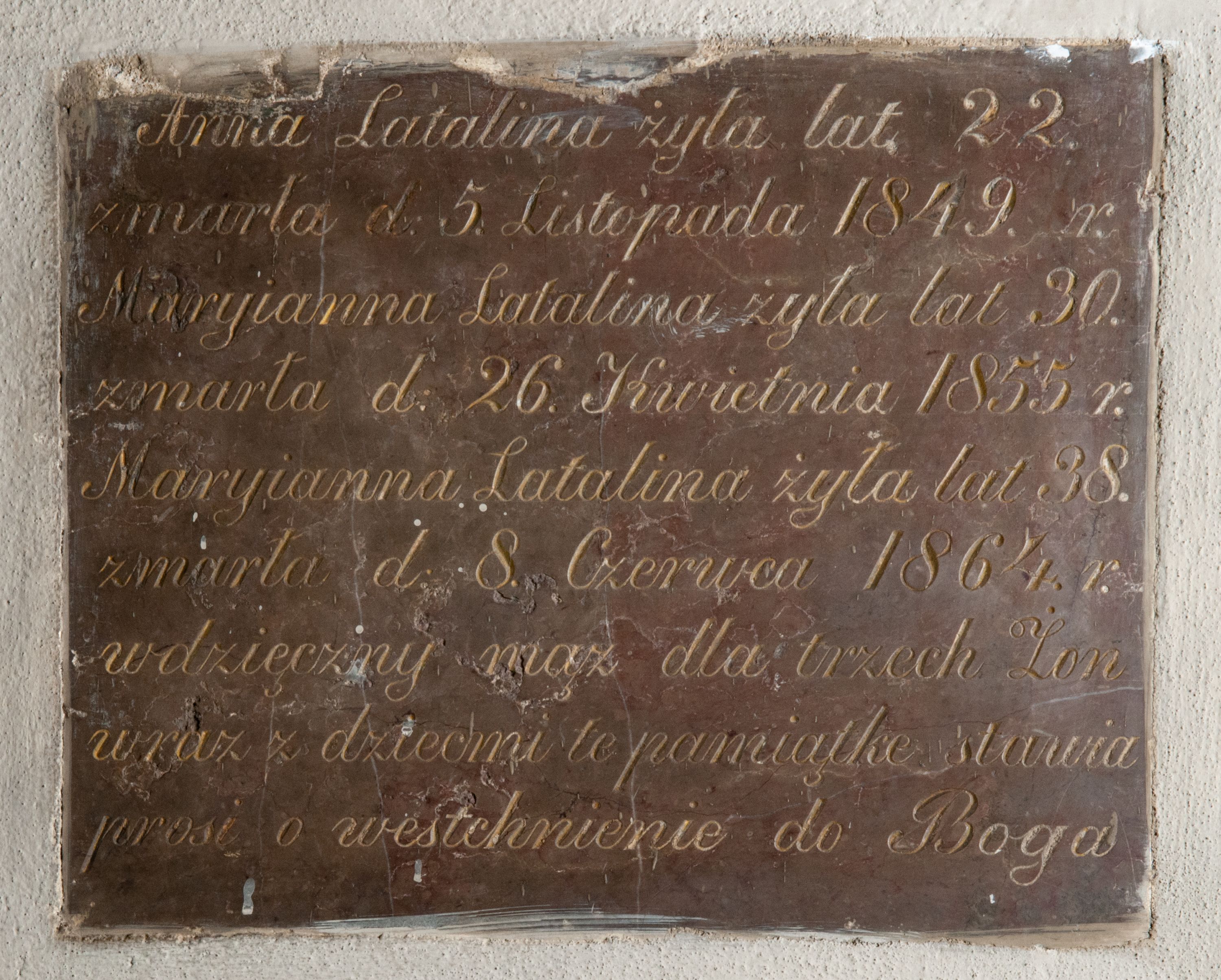 Kamienna tablica epitafijna w kształcie leżącego prostokąta wypełniona inskrypcją „Anna Latalina żyła lat 22. / zmarła d(nia) 5. Listopada 1849. r(oku) / Maryianna Latalina żyła lat 30. / zmarła d(nia) 26. Kwietnia 1855 r(oku) / Maryianna Latalina żyła lat 38. / zmarła d(nia) 8. Czerwca 1864. r(oku) / wdzięczny mąż dla trzech Żon / wraz z dziećmi te pamiątke stawia / prosi o westchnienie do Boga”.