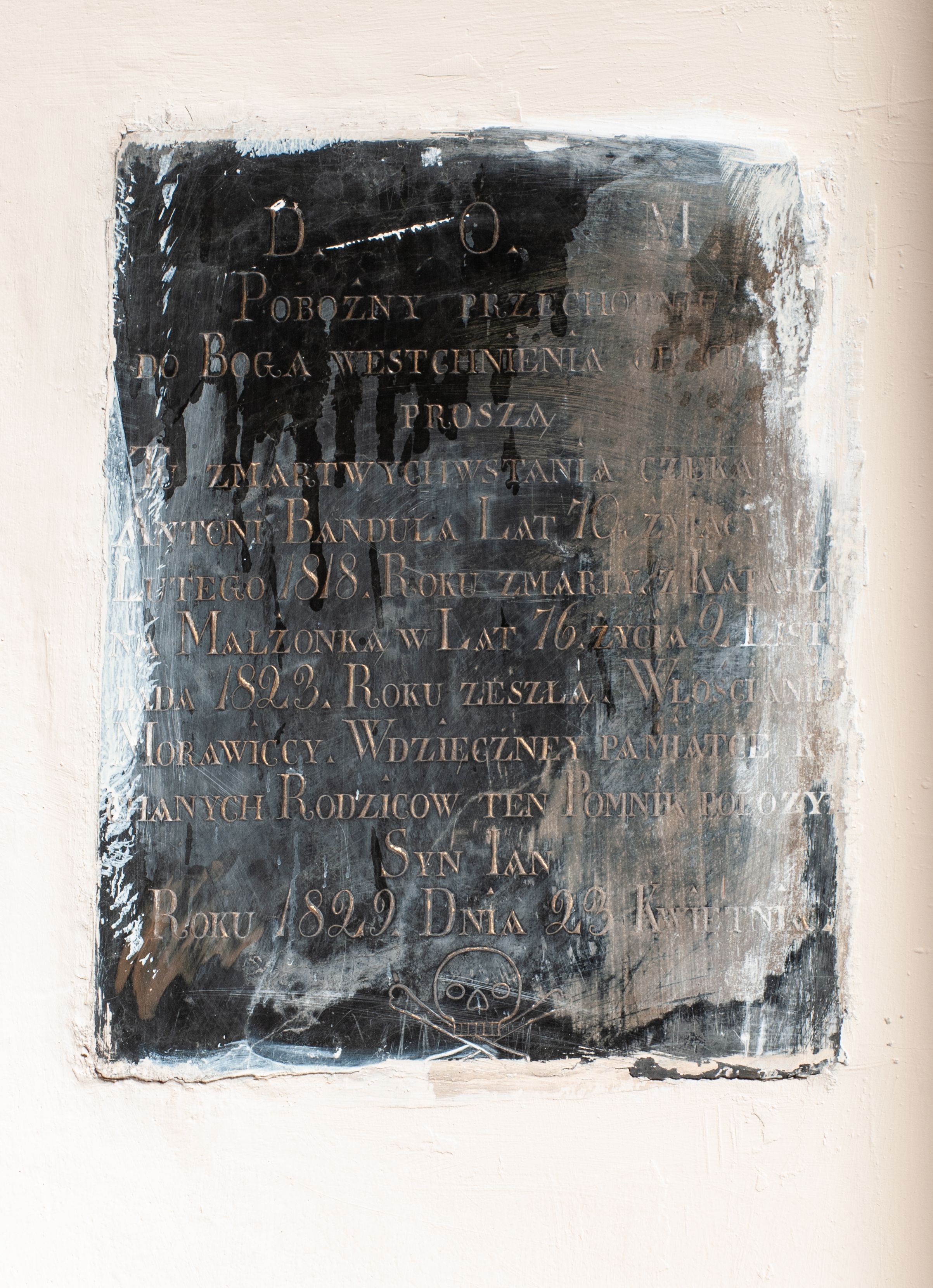 Tablica w kształcie stojącego prostokąta z inskrypcją: "D(EO) O(PTIMO) M(AXIMO) / POBOŻNY PRZECHODNIU / DO BOGA WESTCHNIENIA OD CIEBIE / PROSZĄ / TU ZMARTWYCHWSTANIA CZEKAJĄC / ANTONI BANULA LAT 70 ŻYJĄCY / 14 LUTEGO 1818 ZMARŁY KATARZYNA / MAŁŻONKA W LAT 76. ŻYCIA 21 LISTOPA/DA 1823. ROKU ZESZŁA. WŁOŚCIANIE / MORAWICCY WDZIĘCZNEY PAMIĄTCE KO/CHANYCH RODZICÓW TEN POMNIK POŁOŻYŁ / SYN IAN / ROKU 1829 DNIA 23 KWIETNIA"