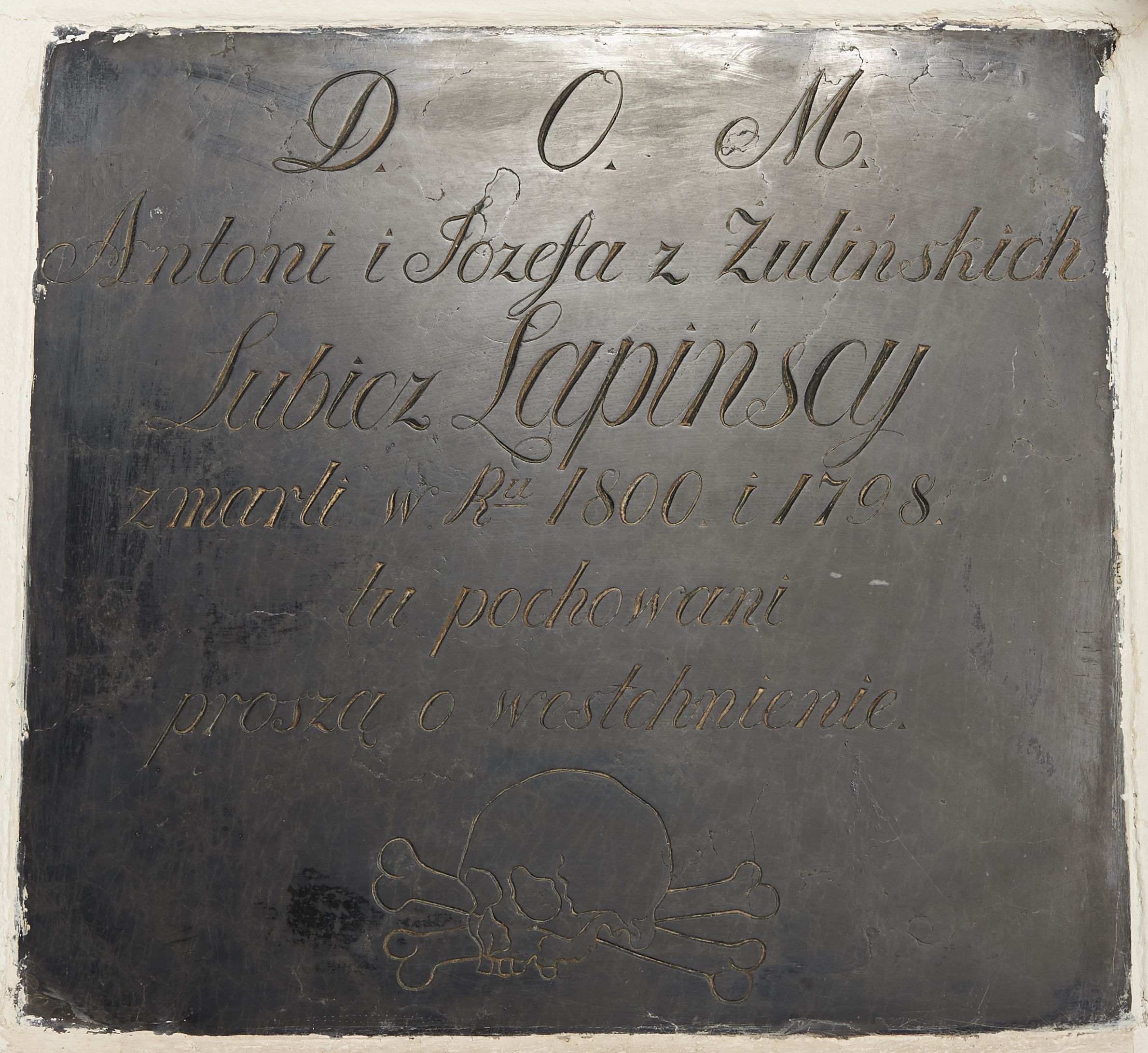 Epitafium w formie prostokątnej tablicy o kształcie zbliżonym do kwadratu z inskrypcją: „D(EO) O(PTIMO) M(AXIMO) / Antoni i Józefa z Żulińskich / Lubicz Lapińscy / Zmarli w R(ok)u 1800 i 1798 / tu pochowani / proszą o westchnienie”. Pod inskrypcją ryta czaszka ze skrzyżowanymi piszczelami.