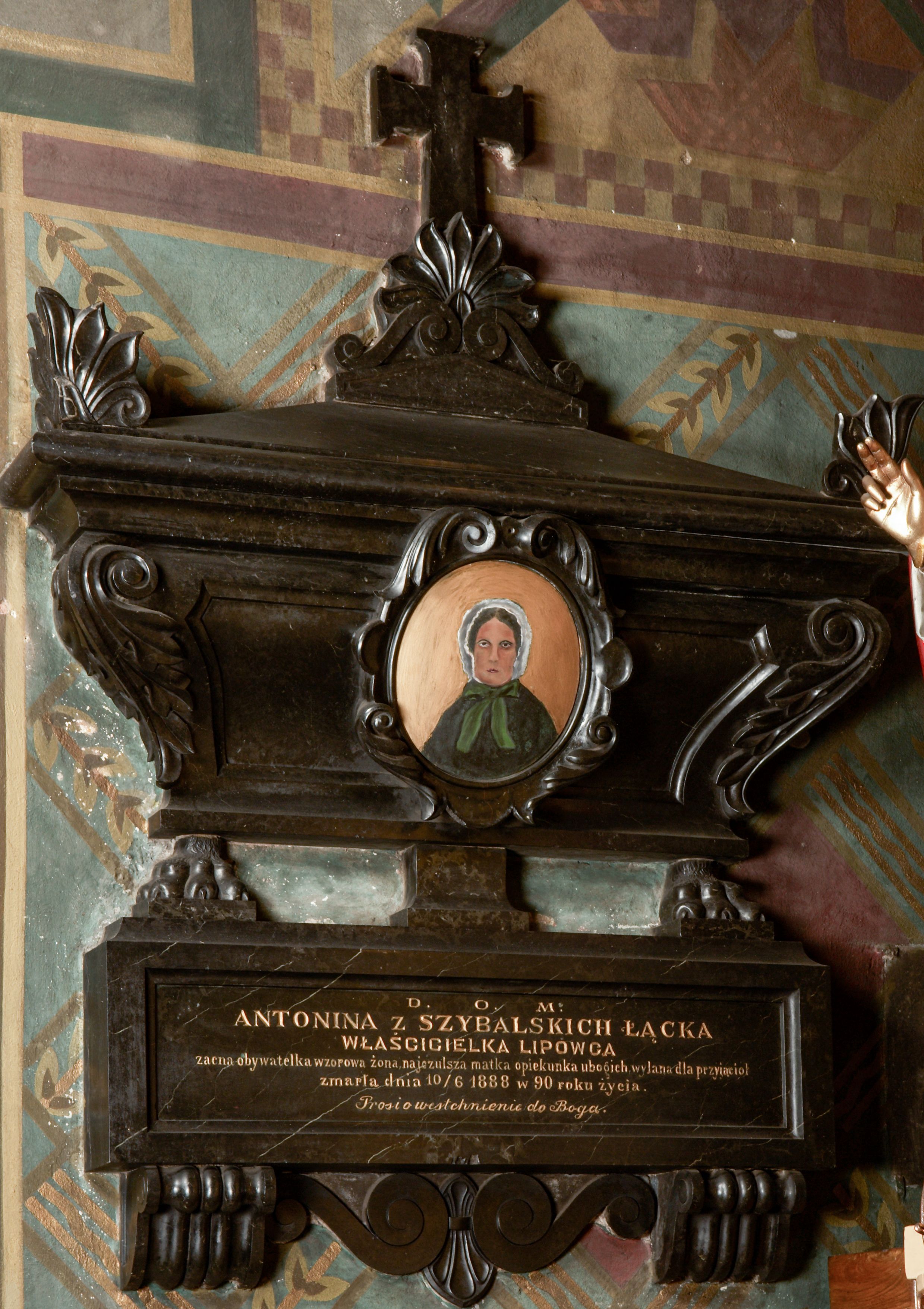 Rozbudowane epitafium utworzone z tablicy inskrypcyjnej i posadowionego na niej sarkofagu z owalnym portretem zmarłej. Tablica osadzona na dwóch wolutowych, profilowanych konsolach i umieszczonych między nimi płaskich wolutach połączonych muszlą, z inskrypcją: "D(EO) O(PTIMO) M(AXIMO) / ANTONINA Z SZYBALSKICH ŁĄCKA / WŁAŚCICIELKA LIPOWCA / zacna obywatelka wzorowa żona, najczulsza matka opiekunka ubogich, wylana dla przyjaciół / zmarła dnia 10/6 1888 w 90 roku życia. / Prosi o westchnienie do Boga." Sarkofag oparty na dwóch lwich łapach i postumencie pośrodku, wybrzuszony, ujęty liśćmi akantu, zwieńczony spłaszczoną trójkątną pokrywą z liściastymi akroterionami na bokach i trójkątnym cokolikiem z dwiema wolutkami z palmetką, zwieńczoną krzyżem. Na sarkofagu owalny medalion otoczony kartuszem z liści z portretem zmarłej. Kobieta przedstawiona jest frontalnie, w popiersiu. Ubrana w ciemno-zieloną pelerynę oraz biały czepiec zawiązywany zieloną kokardą. Tło jednolicie złocone.
