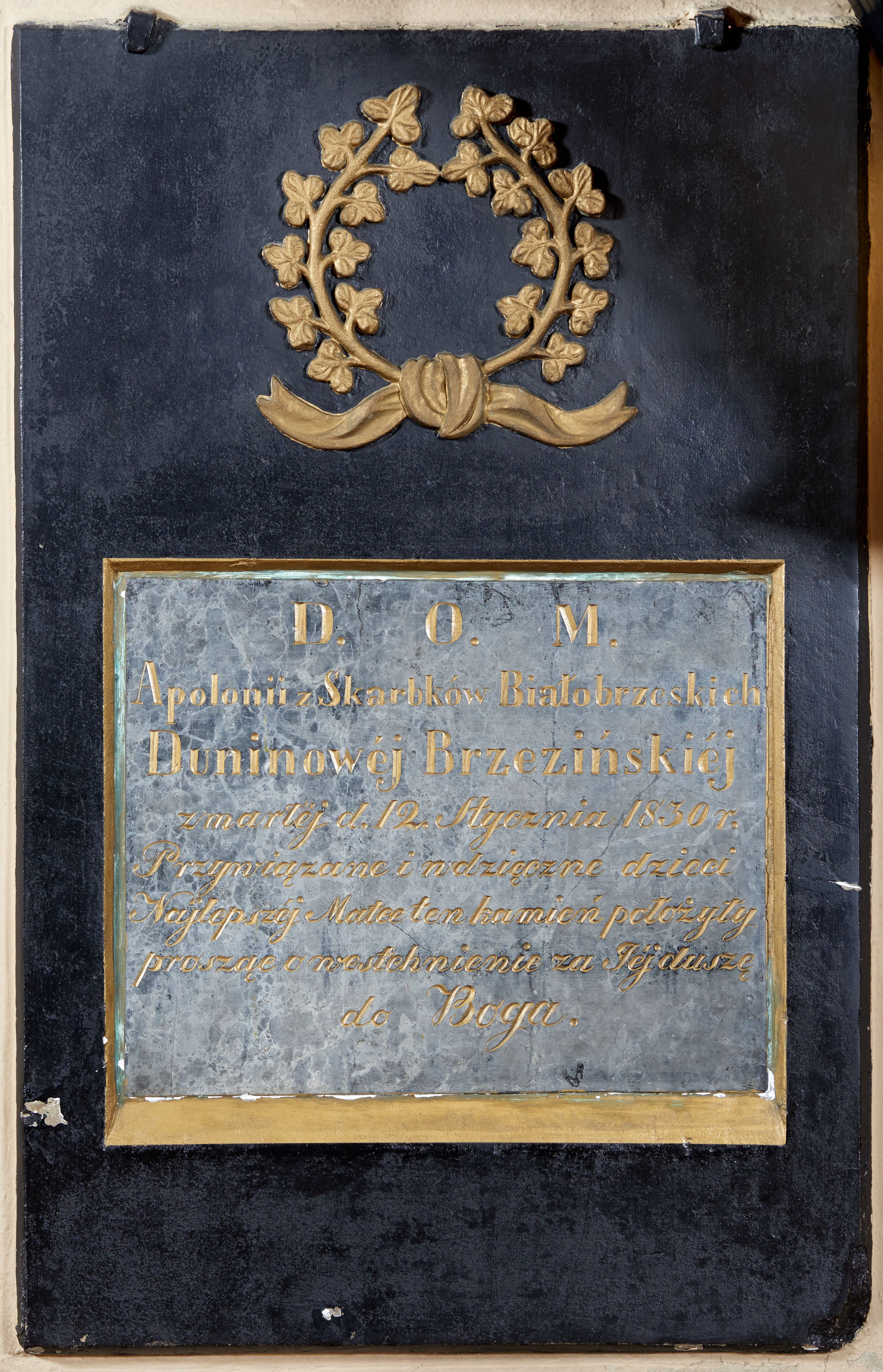 Epitafium w kształcie stojącego prostokąta. W polu kwadratowa płycina z rytą, złoconą inskrypcją „D(EO) O(PTIMO) M(AXIMO) / Apolonii z Skarbków Białobrzeskich / Duninowéj Brzezińskiéj / zmarłéj d(nia) 12. stycznia 1830r(oku) / Przywiązane i wdzięczne dzieci / Najlepszéj Matce ten kamień położyły / prosząc o westchnienie za Jéj duszę / do Boga.” Nad płyciną rzeźbiony, złocony wieniec z trójlistnych gałązek, przewiązany u dołu wstęgą.