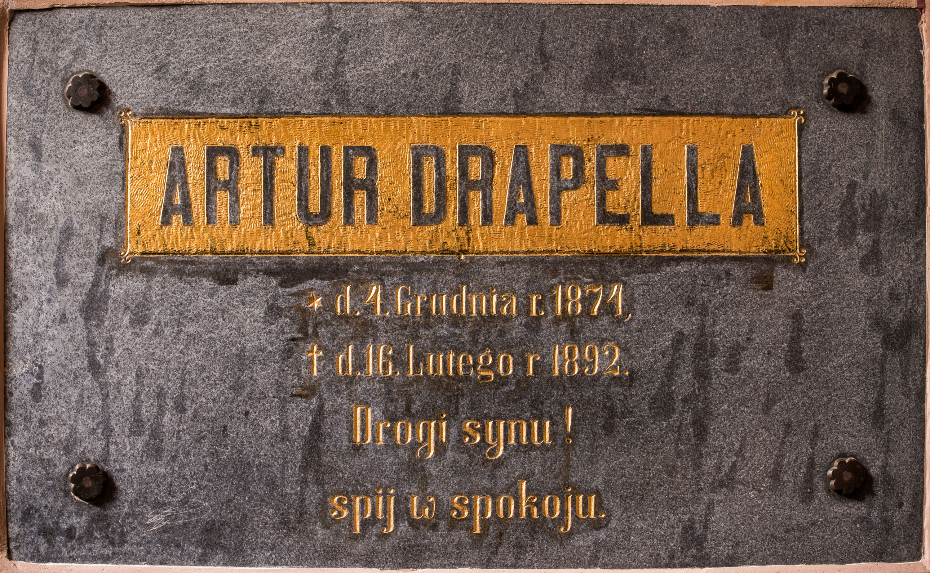 Epitafium w formie kamiennej tablicy w kształcie leżącego prostokąta, przymocowanej w narożach czterema śrubami o zakończeniach w formie rozetek. W górnej partii, na złoconym, prostokątnym tle jest napis „ARTUR DRAPELLA”, natomiast poniżej: „*d(nia) 4. Grudnia r(oku) 1871, / +d(nia) 16. Lutego r[oku] 1892 / Drogi synu! / spij w spokoju.”.