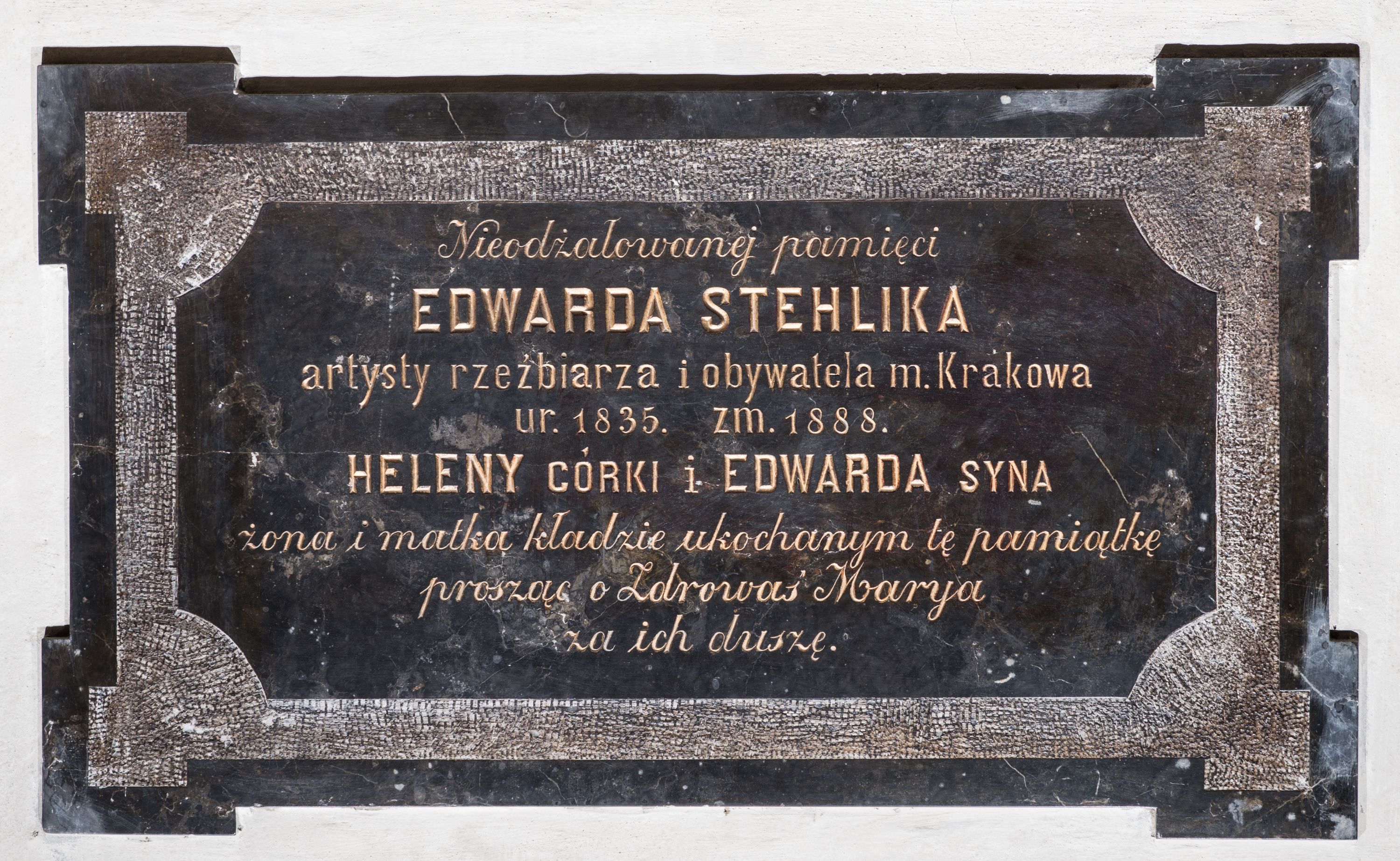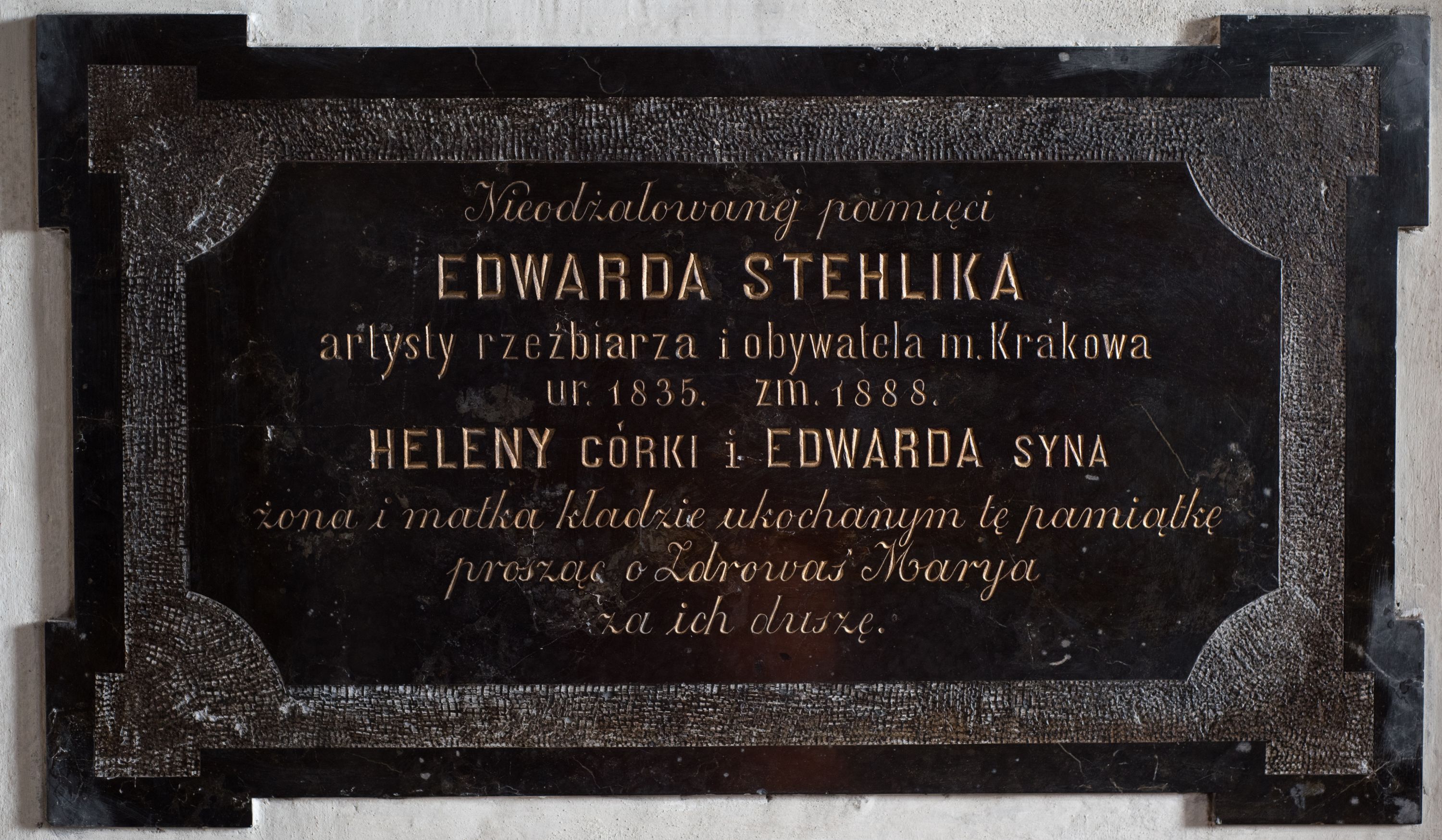 Epitafium Edwarda Stehlika zasłużonego kamieniarza i rzeźbiarza, restauratora krakowskich kościołów po pożarze w połowie XIX wieku oraz jego dzieci Heleny i Edwarda sprawione staraniem żony Mari Anny Florentyny Schwartz.