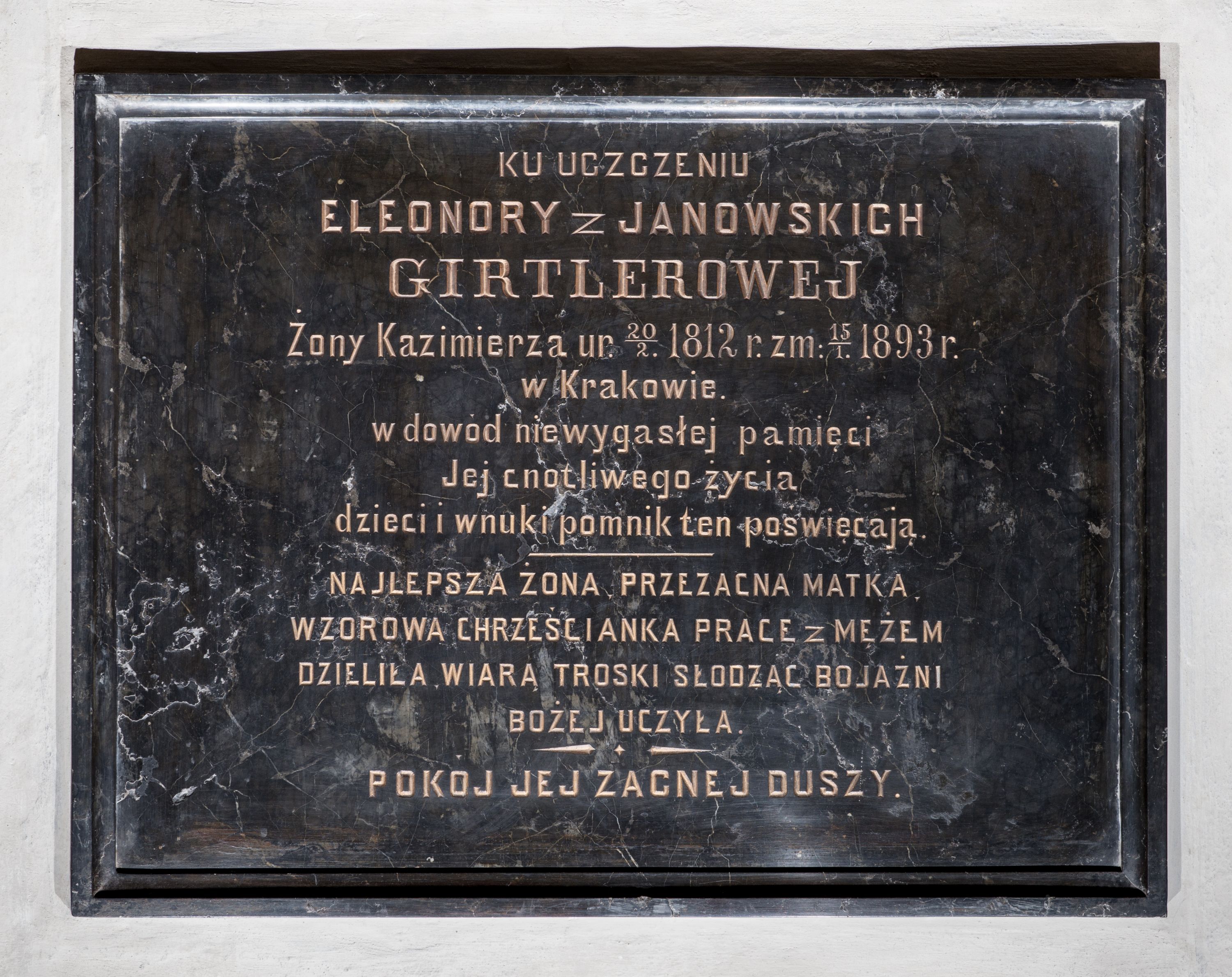 Epitafium w kształcie leżącego prostokąta z inskrypcją: „KU UCZCZENIU / ELEONORY z JANOWSKICH / GIRTLEROWEJ / Żony Kazimierza ur(odzonej) 20/2 1812 r(oku) zm(arłej) 15/1. 1893 r(oku) / w Krakowie. / w dowód niewygasłej pamięci / Jej cnotliwego życia / dzieci i wnuki pomnik ten poświęcają. / NAJLEPSZA ŻONA, PRZEZACNA MATKA, / WZOROWA CHRZEŚCIANKA PRACE z MĘŻEM / DZIELIŁA, WIARĄ TROSKI SŁODZĄC BOJAŻNI / BOŻEJ UCZYŁA. / POKÓJ JEJ ZACNEJ DUSZY”.