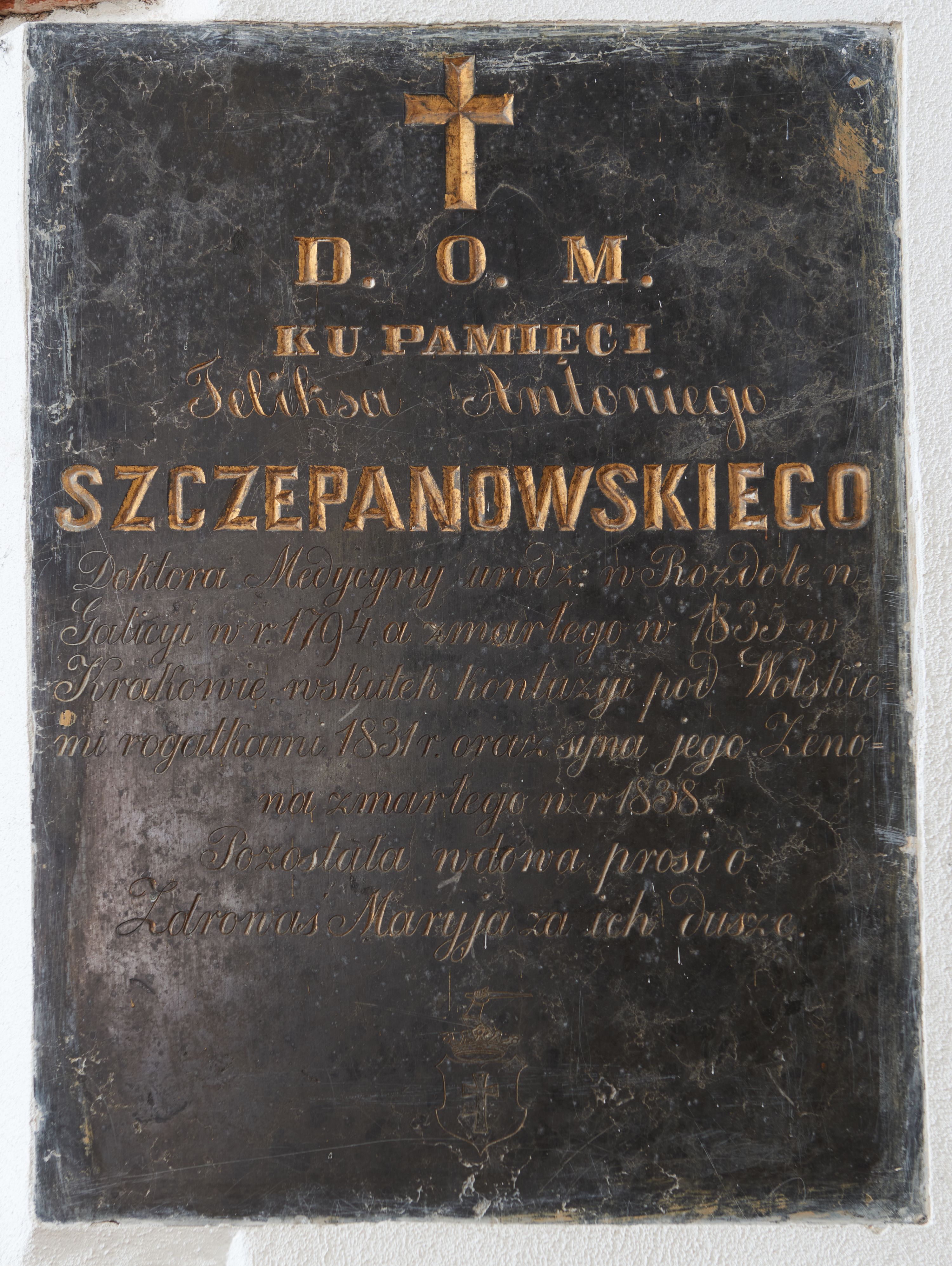 D. O. M. / KU PAMIĘCI / Feliksa Antoniego / SZCZEPANOWSKIEGO / Doktora Medycyny urodz: w Rozdole w / Galicji w r. 1794 a zmarłego w 1835 w / Krakowie w skutek kontuzyi pod Wołskie - / mi rogatkami 1831 r. oraz syna jego Zeno - / na zmarłego w r. 1838. / Pozostała wdowa prosi o / Zdrowaś Maryja za ich dusze.