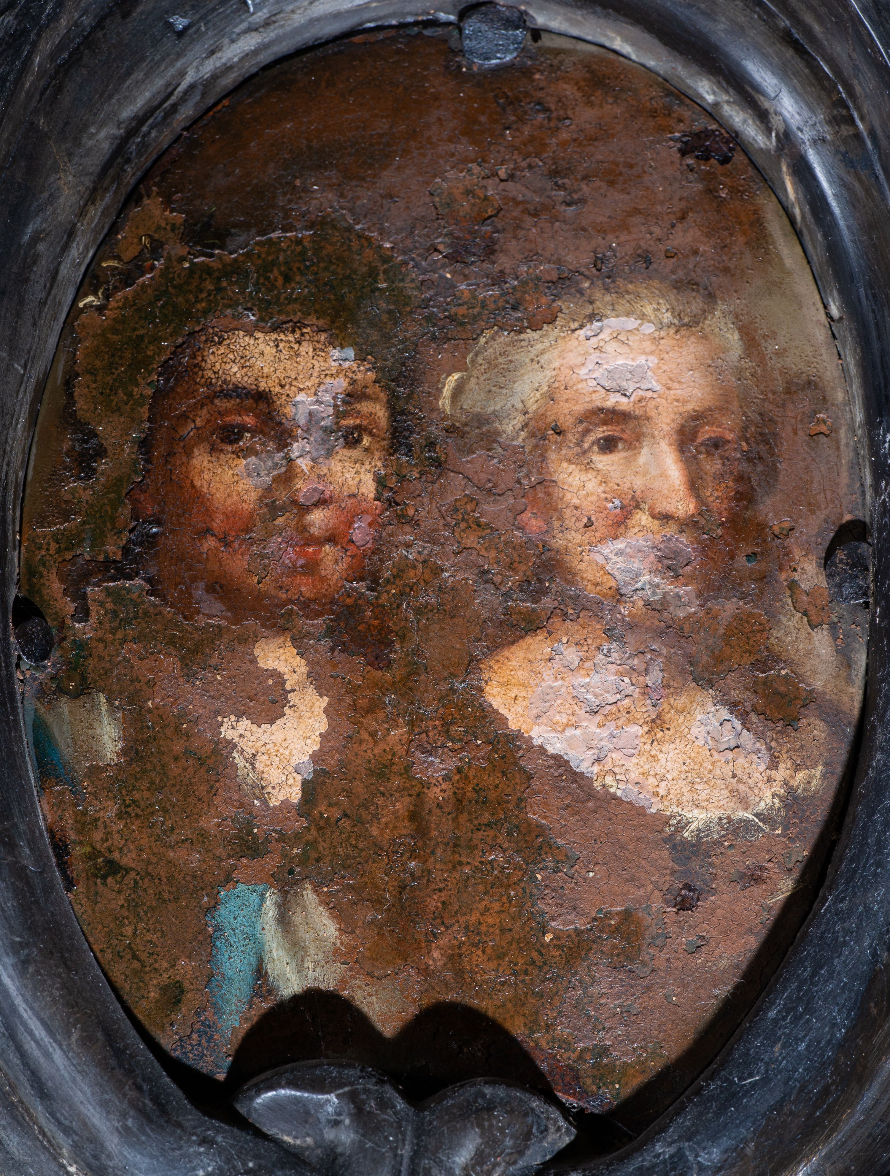 Obraz zniszczony, z ubytkami, blacha skorodowana.