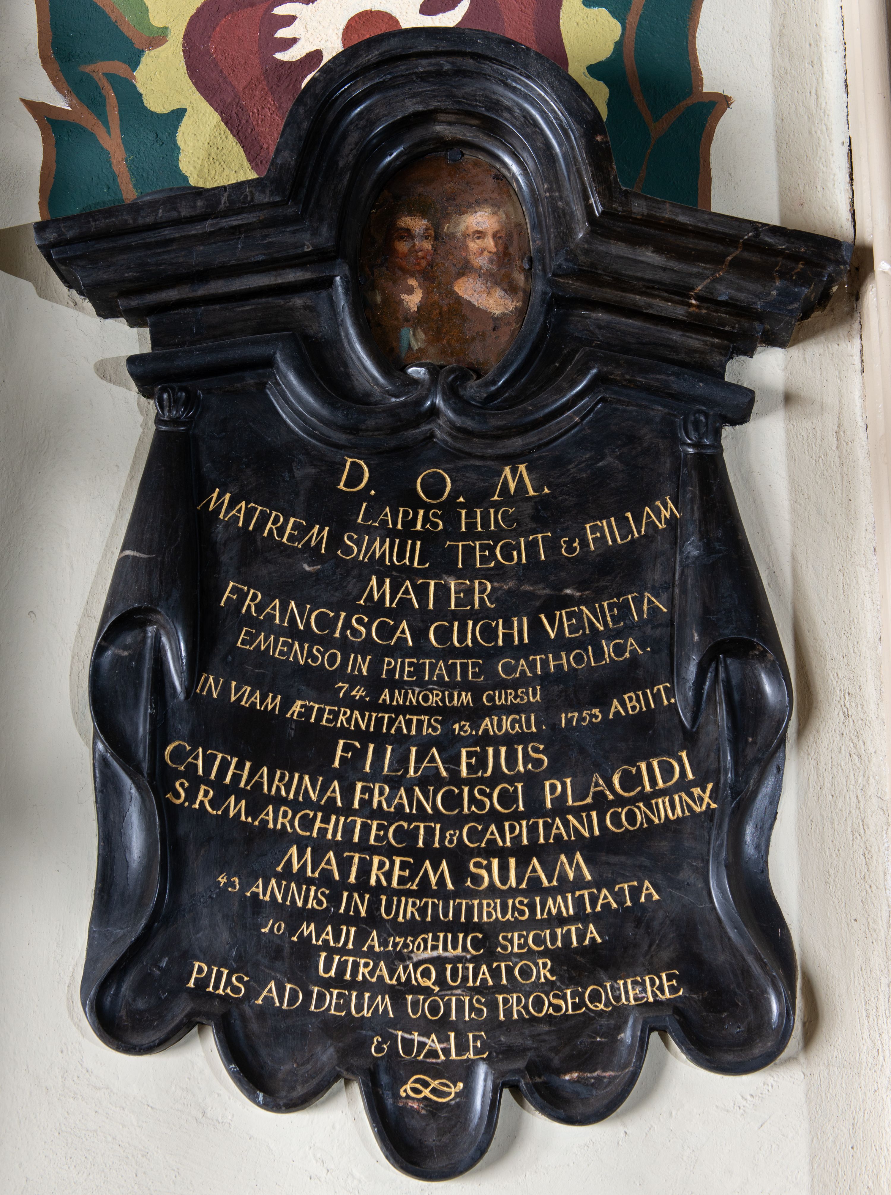 Epitafium w kształcie podwieszonej pod gzyms tkaniny. Gzyms profilowany, wybrzuszony półkoliście, z owalnym polem, w którym znajduje się portret zmarłych. Kobiety ukazane w popiersiu, w trzech czwartych, z oczami na wprost. Pod nim tablica z inskrypcją w kształcie podwieszonej zawiniętej na bokach tkaniny zakończonej motywem lambrekinu. W polu inskrypcja: „D(EO) O(PTIMO) M(AXIMO) / LAPIS HIC / MATREM SIMUL TEGIT et FILIAM / MATER / FRANCISCA CUCHI VENETA / EMENSO IN PIETATE CATHOLICA. / 74. ANNORUM CURDU / IN VIAM AETERNITATIS 13.AUGU(STI) 1753 ABIIT. / FILIA EJUS / CATHARINA FRANCISCI PLACIDI / S(ACRE) R(EGIE) M(AIESTATIS) ARCHITECTI et CAPITANI CONJUNX / MATREM SUAM / 43 ANNIS IN VIRTUTIBUS IMITATA / 10 MAJI A(NNO) 1756 HUC SECUTA. / UTRAMQ VIATOR / PIIS AD DEUM VOTIS PROSEQUERE / et VALE”.