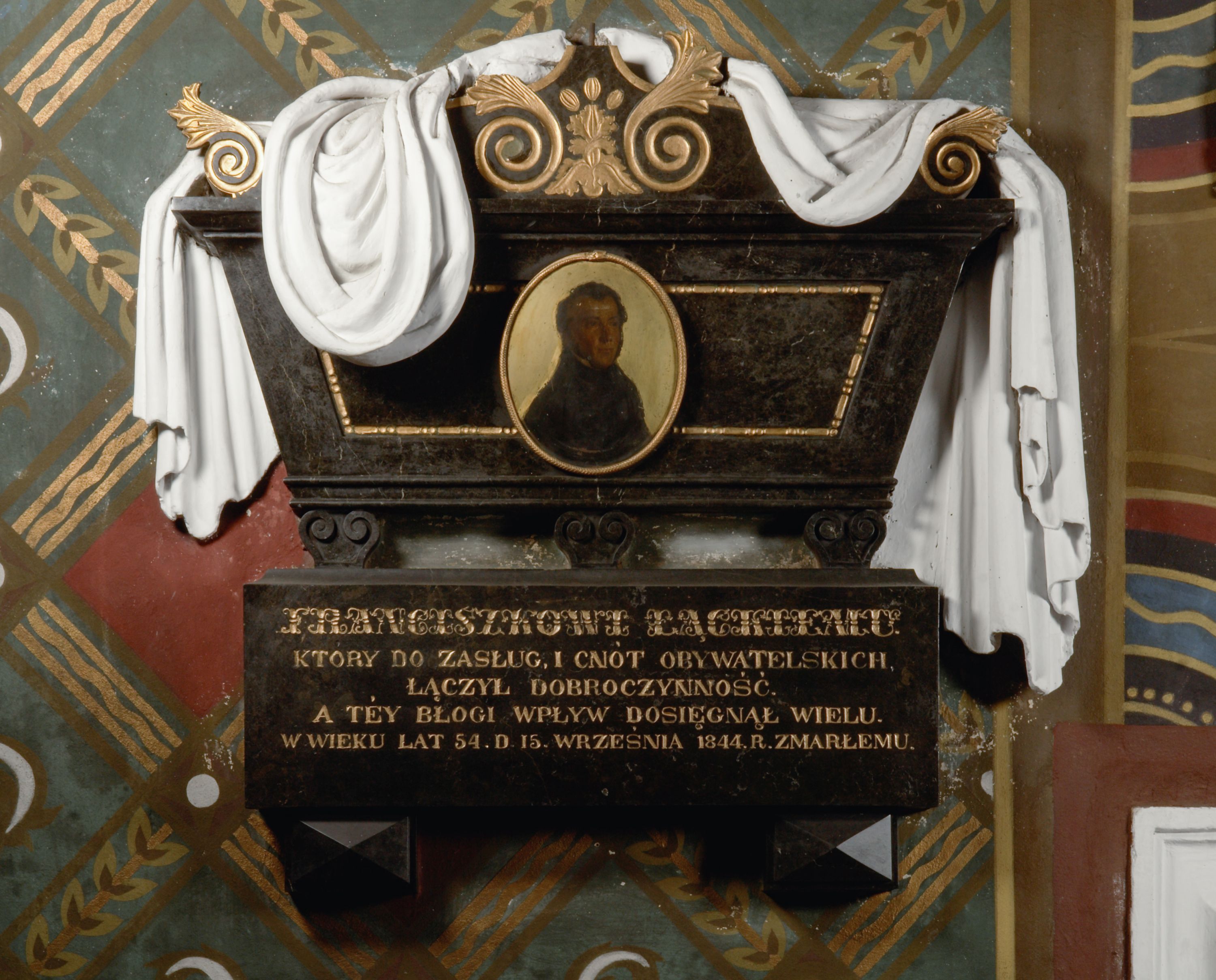 Rozbudowane epitafium utworzone z wysokiego cokołu z inskrypcją i wspartego na nim sarkofagu nakrytego tkaniną z portretem. Sarkofag stoi na trzech niewielkich nóżkach, zdobionych podwójnymi ustawionymi przeciwstawnie wolutami. Ma kształt równoramiennego trapezu, z dekorowaną perełkowaniem płyciną pośrodku i osadzonym w jej centrum, malowanym na owalnej, złoconej blasze portretem zmarłego. Zwieńczenie w kształcie łuku wklęsło-wypukłego, dekorowane złoconymi wolutami zakończonymi liśćmi akantu liściastymi wolutami w funkcji akroterionów oraz narzuconą nań, udrapowaną, białą tkaniną. Pośrodku owalny obraz w złoconej ramie naśladującej węża pożerającego własny ogon. Zmarły przedstawiony w popiersiu, z ciałem w trzech czwartych zwróconym w lewo. Ubrany w ciemny strój z wysokim kołnierzem. Tło jednolicie złocone. Na cokole, wspartym na dwóch piramidalnych konsolach ryta i złocona inskrypcja "FRANCISZKOWI ŁĄCKIEMU / KTÓRY DO ZASŁUG, I CNÓT OBYWATELSKICH, / ŁĄCZYŁ DOBROCZYNNOŚĆ. / A TEY BŁOGI WPŁYW DOSIĘGNĄŁ WIELU. / W WIEKU LAT 54 D(NIA) 15 WRZEŚNIA 1844. R(OKU) ZMARŁEMU."