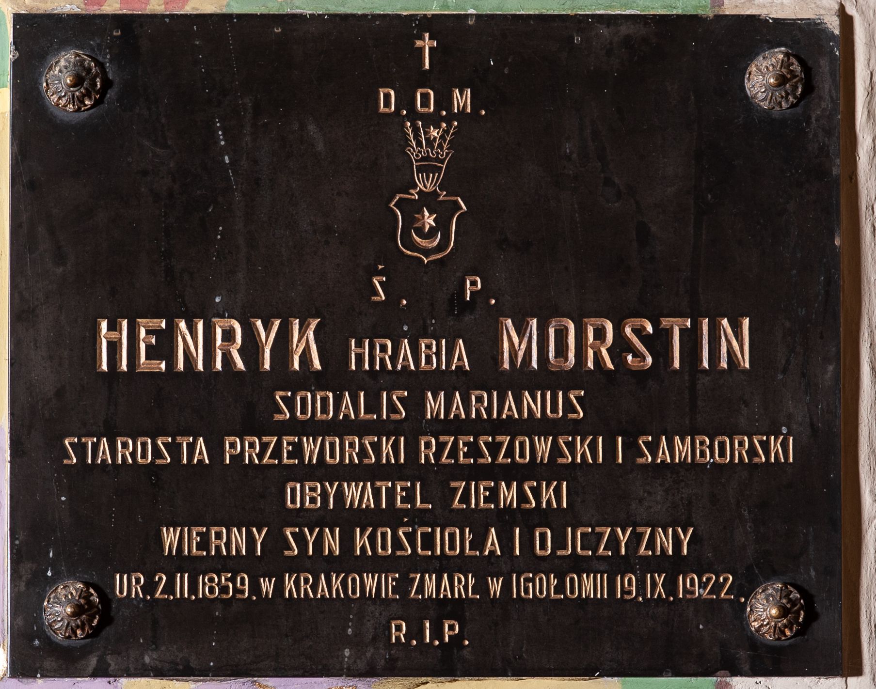 Tablica epitafijna w kształcie leżącego prostokąta, przymocowana do ściany czterema nitami, z zewnątrz ozdobionymi rozetkami. W polu złocona, kuta inskrypcja „D(EO) O(PTIMO) M(AXIMO) / Ś(WIĘTEJ) P(AMIĘCI) / HENRYK HRABIA MORSTIN / SODALIS MARIANUS / STAROSTA PRZEWORSKI RZESZOWSKI I SAMBORSKI / OBYWATEL ZIEMSKI / WIERNY SYN KOŚCIOŁA I OJCZYZNY / UR(ODZONY) 2. II. 1859. W KRAKOWIE ZMARŁ W IGOŁOMII 19. IX. 1922. / R(EQUIESCAT) I(N) P(ACE)”. Między pierwszym a drugim wierszem inskrypcji, kuty i złocony herb Leliwa. W tarczy o ściętych narożach głowicy i podstawie z języczkiem umieszczono godło herbu Leliwa: księżyc, a nad nim gwiazda. Na tarczy hełm z otwartą koroną i klejnotem w postaci czterech piór, na których położono gwiazdę.